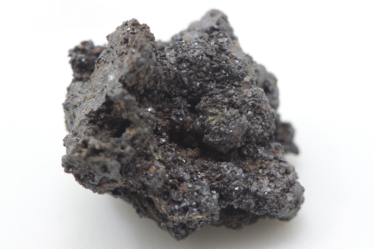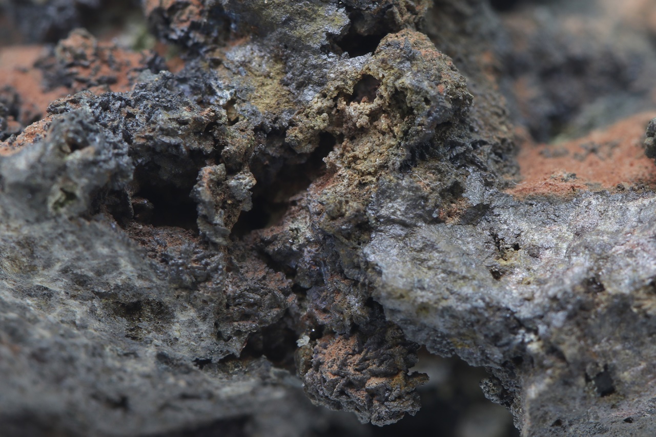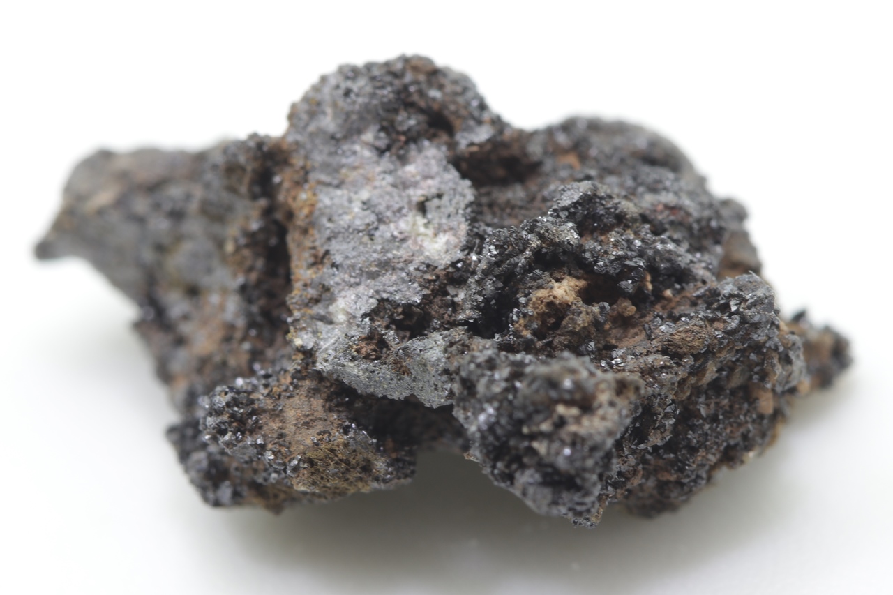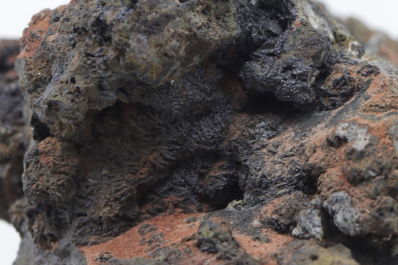 Specimen of lead and zinc vanadate – descloizite in two habits: once as small, shiny black crystals, and the other time as brown tabular crystals.