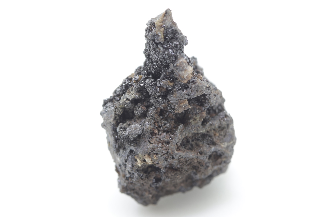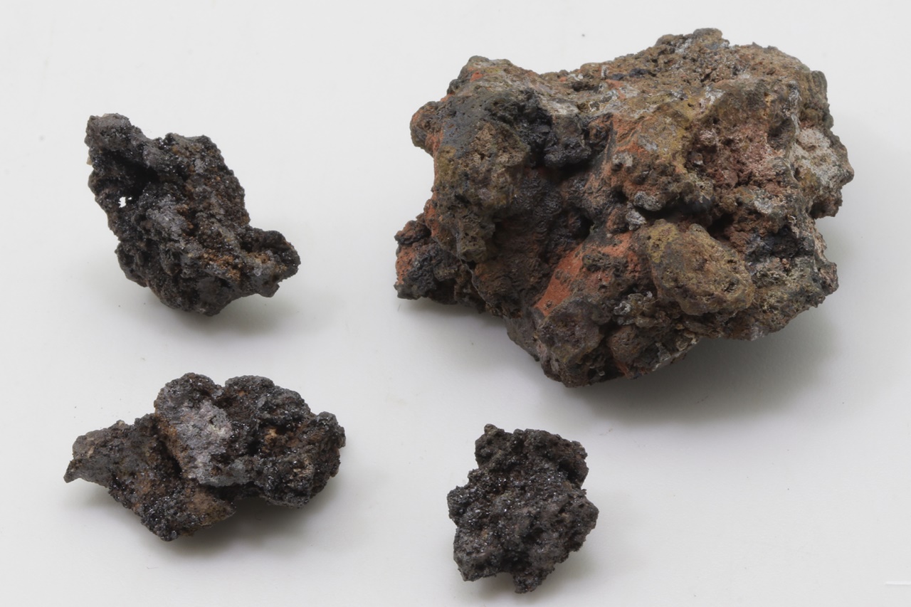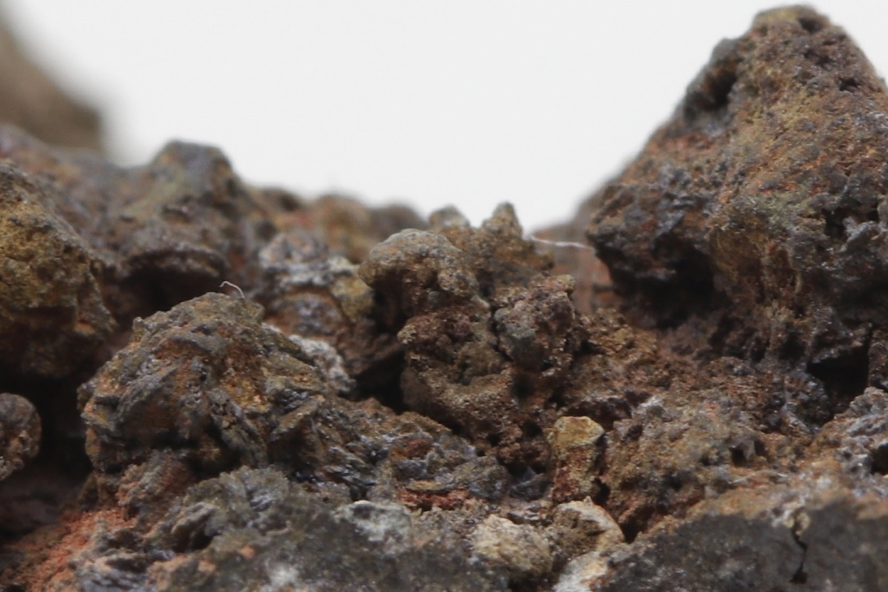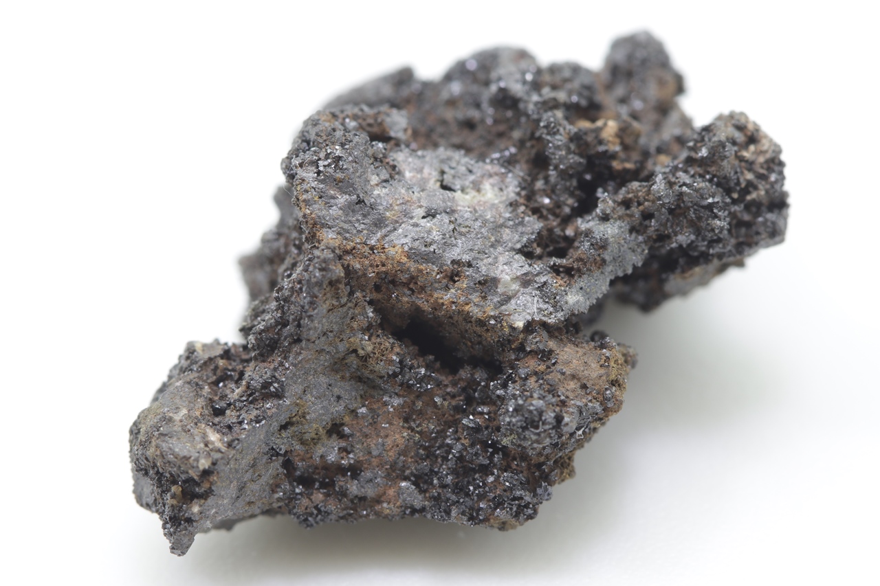Specimen of lead and zinc vanadate – descloizite in two habits: once as small, shiny black crystals, and the other time as brown tabular crystals.