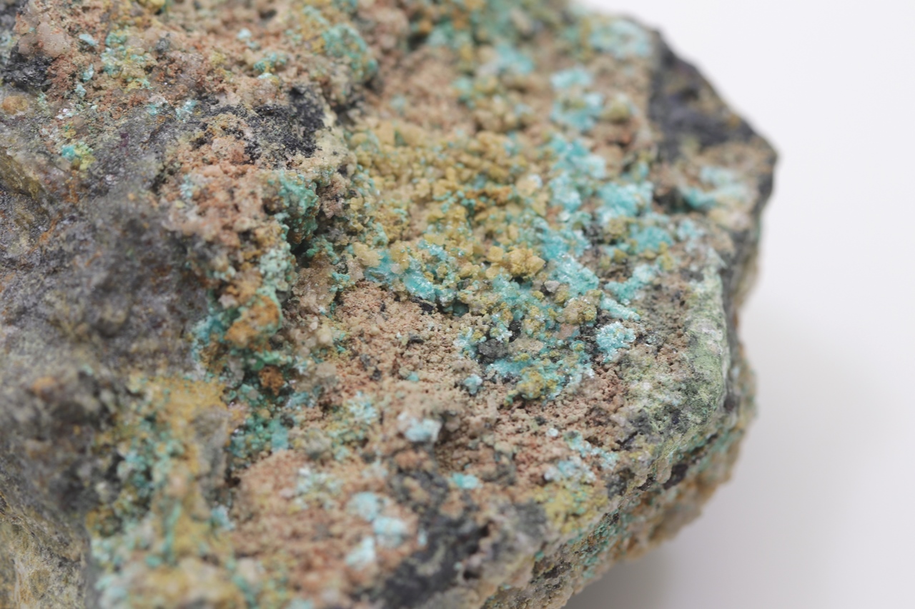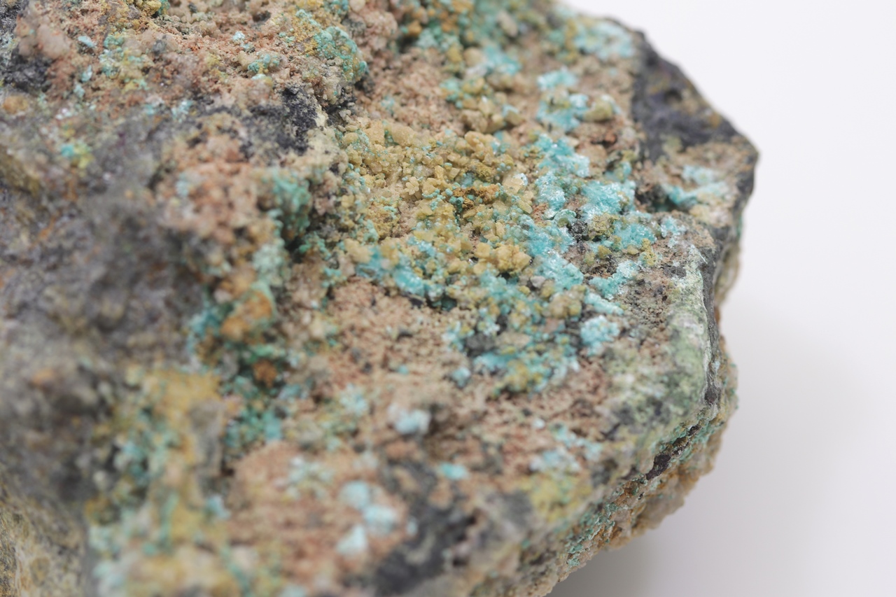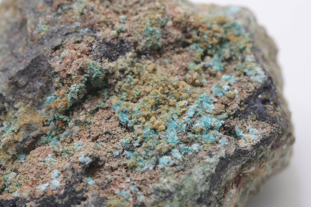 Devilline forms small, blue-green, acicular crystals that grow into radial aggregates. Most of these aggregates reach a size of 3 mm. Individual devilline aggregates grow into the surrounding minerals and substrate. This sample is a nice example of devilline from the locality Špania Dolina.