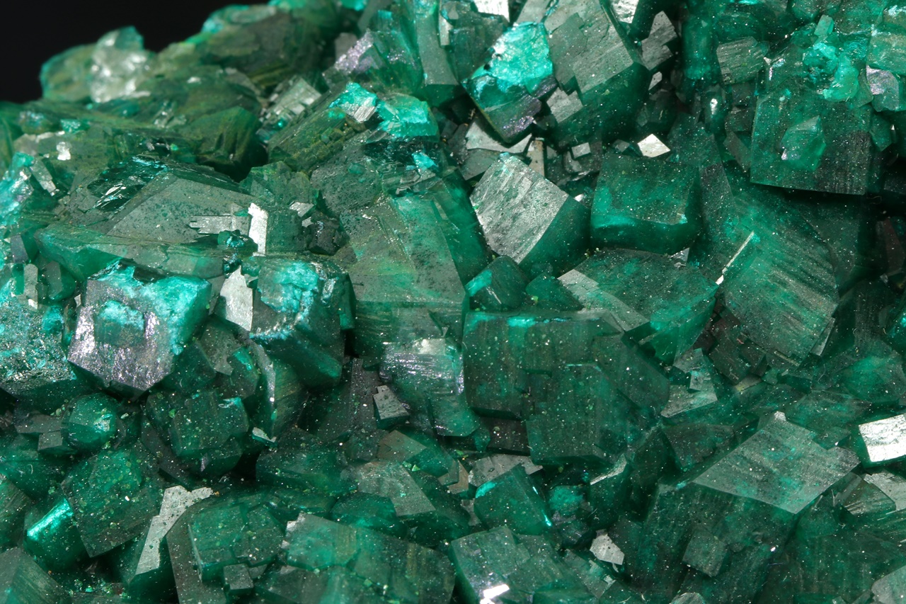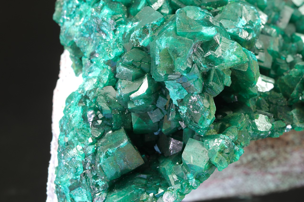 Exceptionally high-quality and rich druse of intensely green, glossy Dioptase crystals. The Dioptase crystals are around 1 cm in size.
