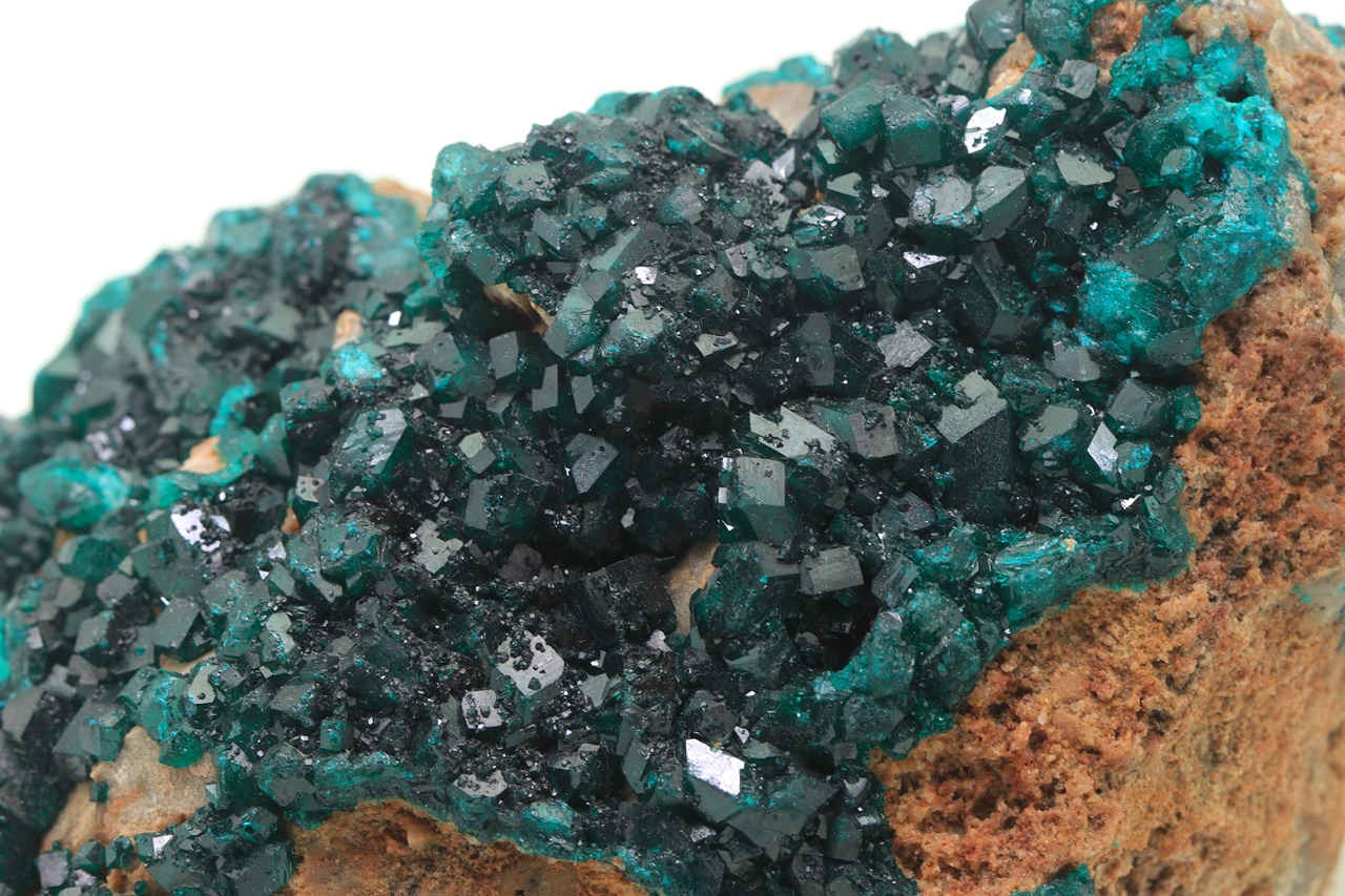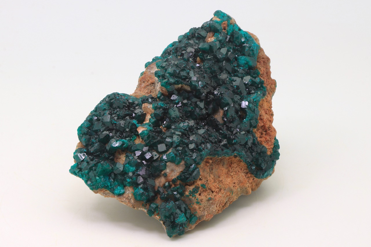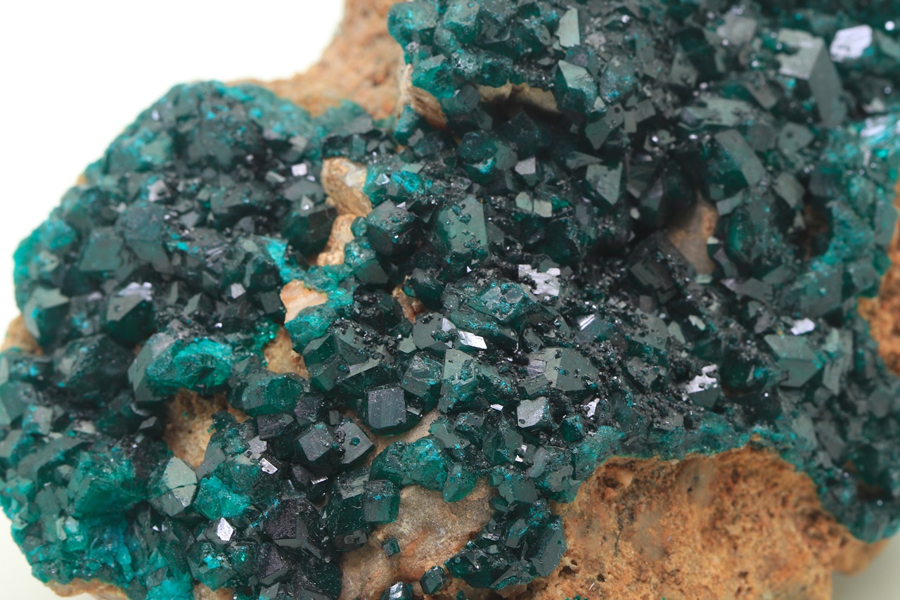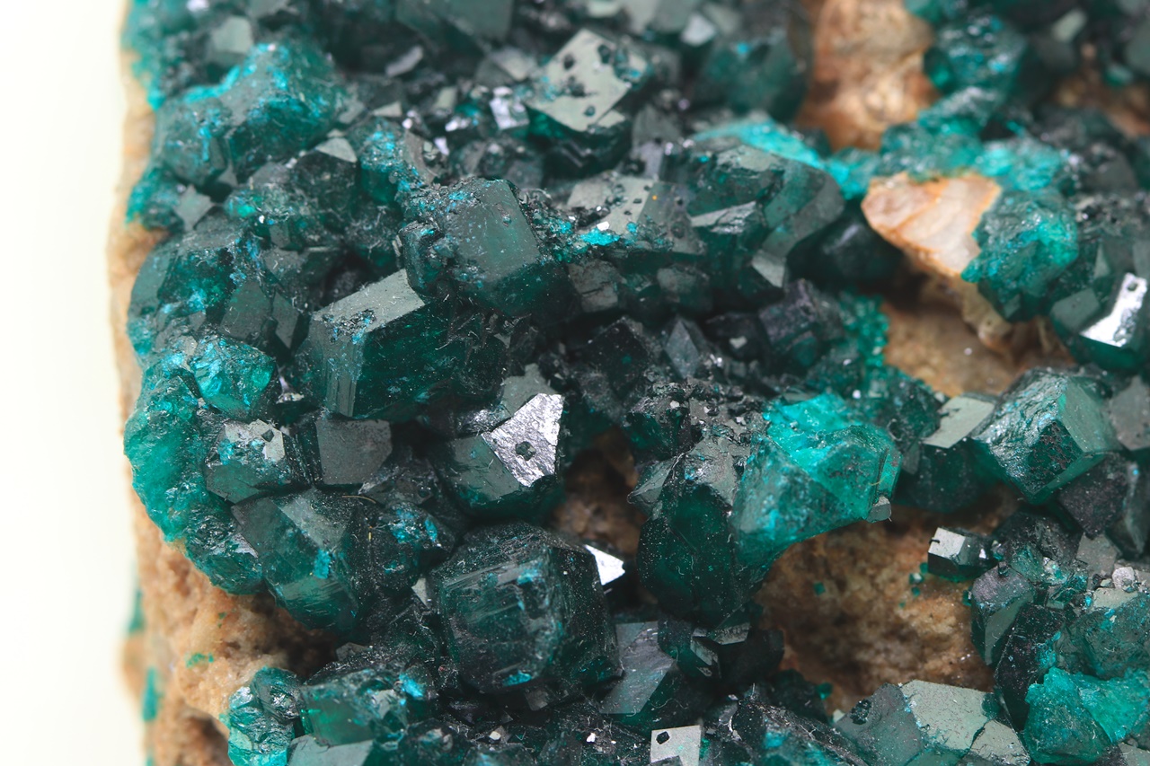 Large druse of saturated green, shiny crystals of copper silicate – dipotassium – up to 9 mm in size.