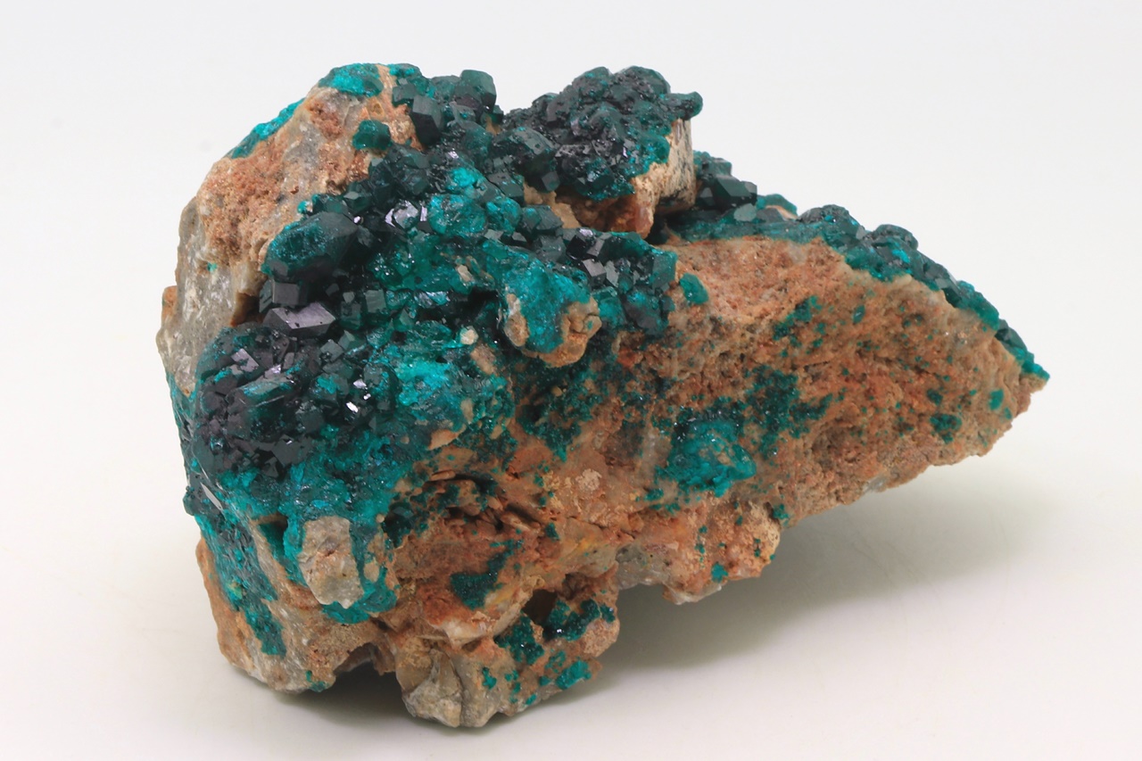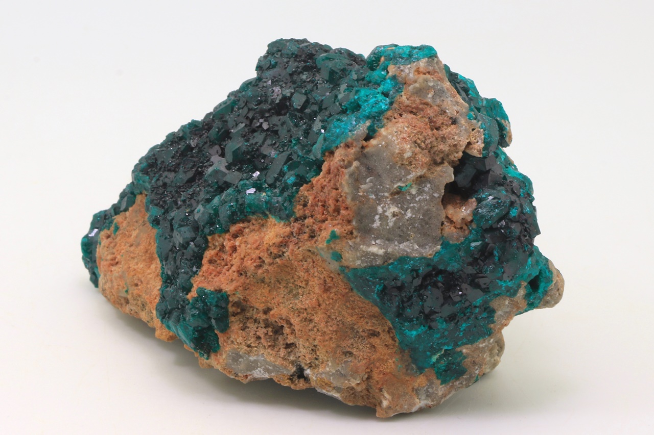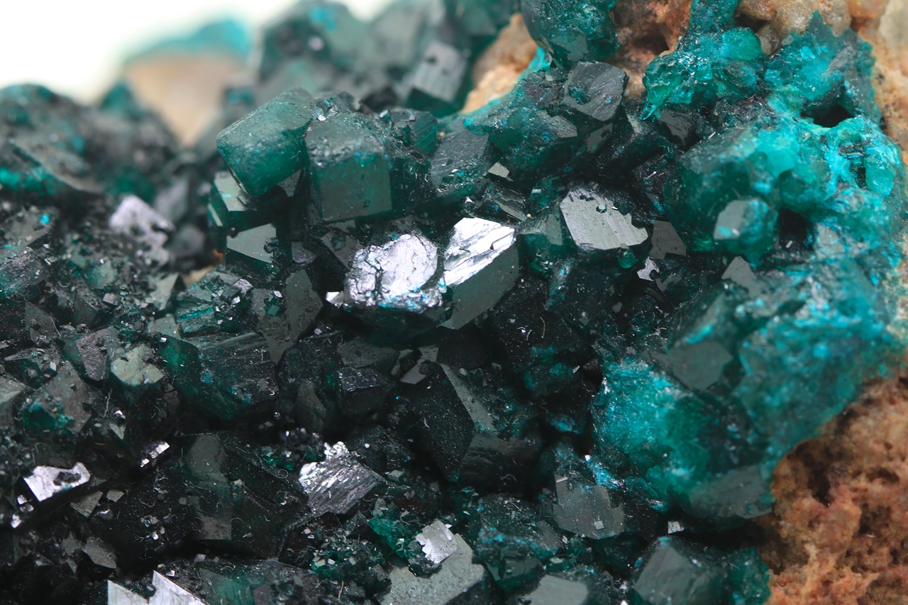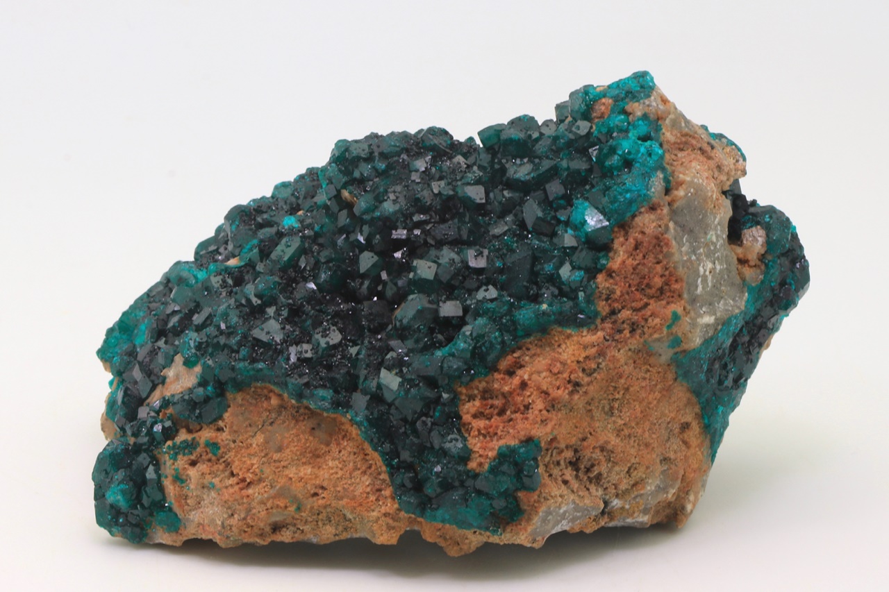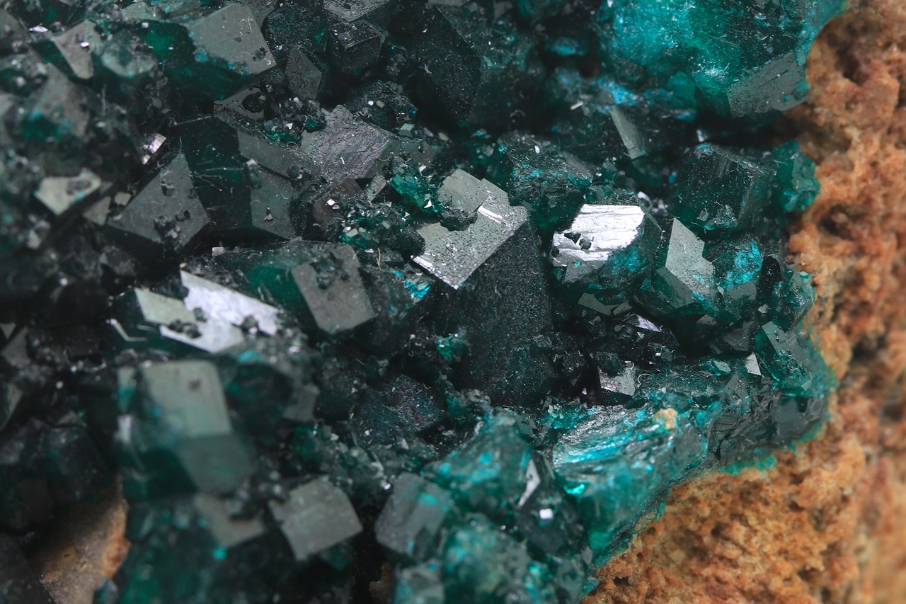 Large druse of saturated green, shiny crystals of copper silicate – dipotassium – up to 9 mm in size.
