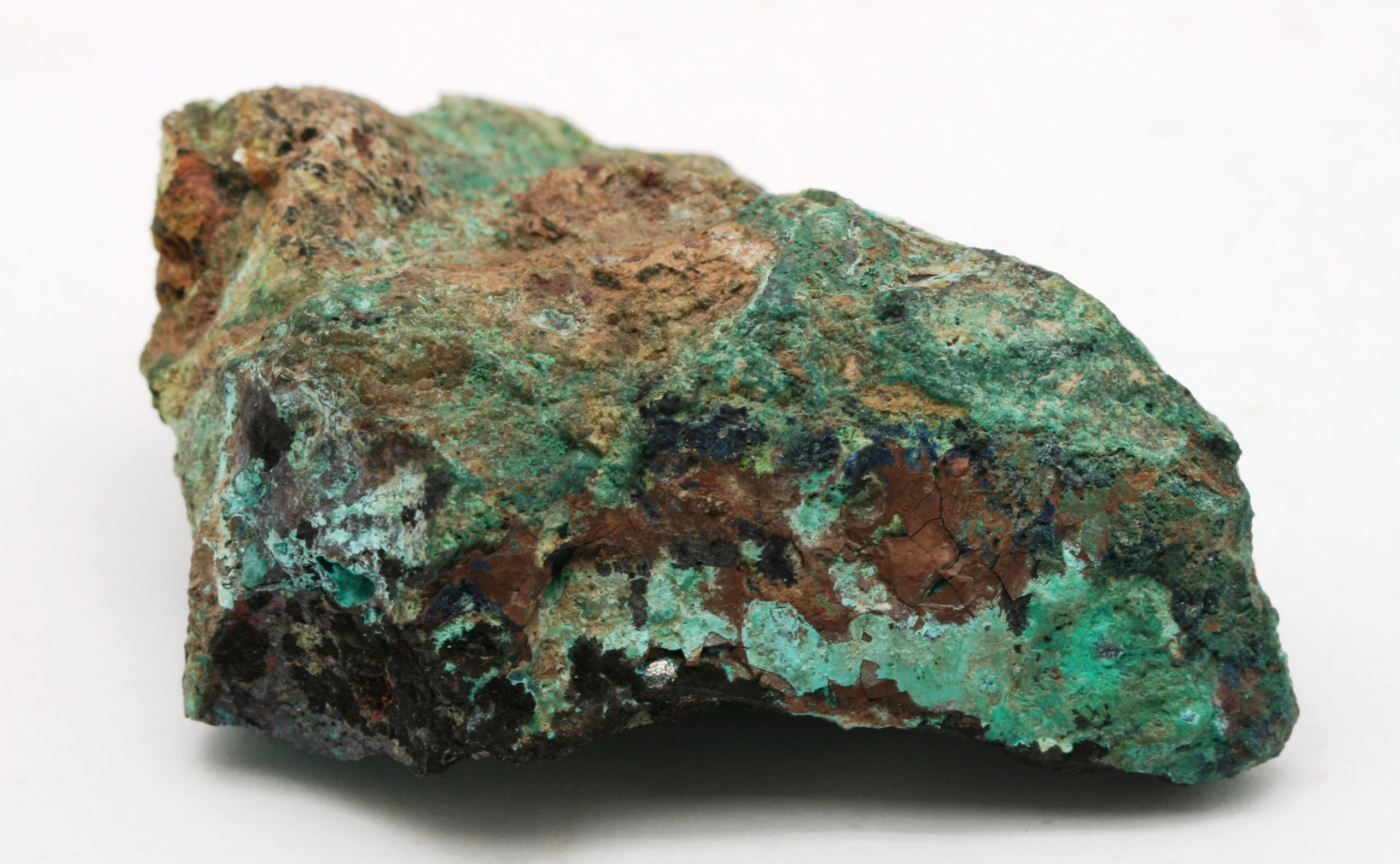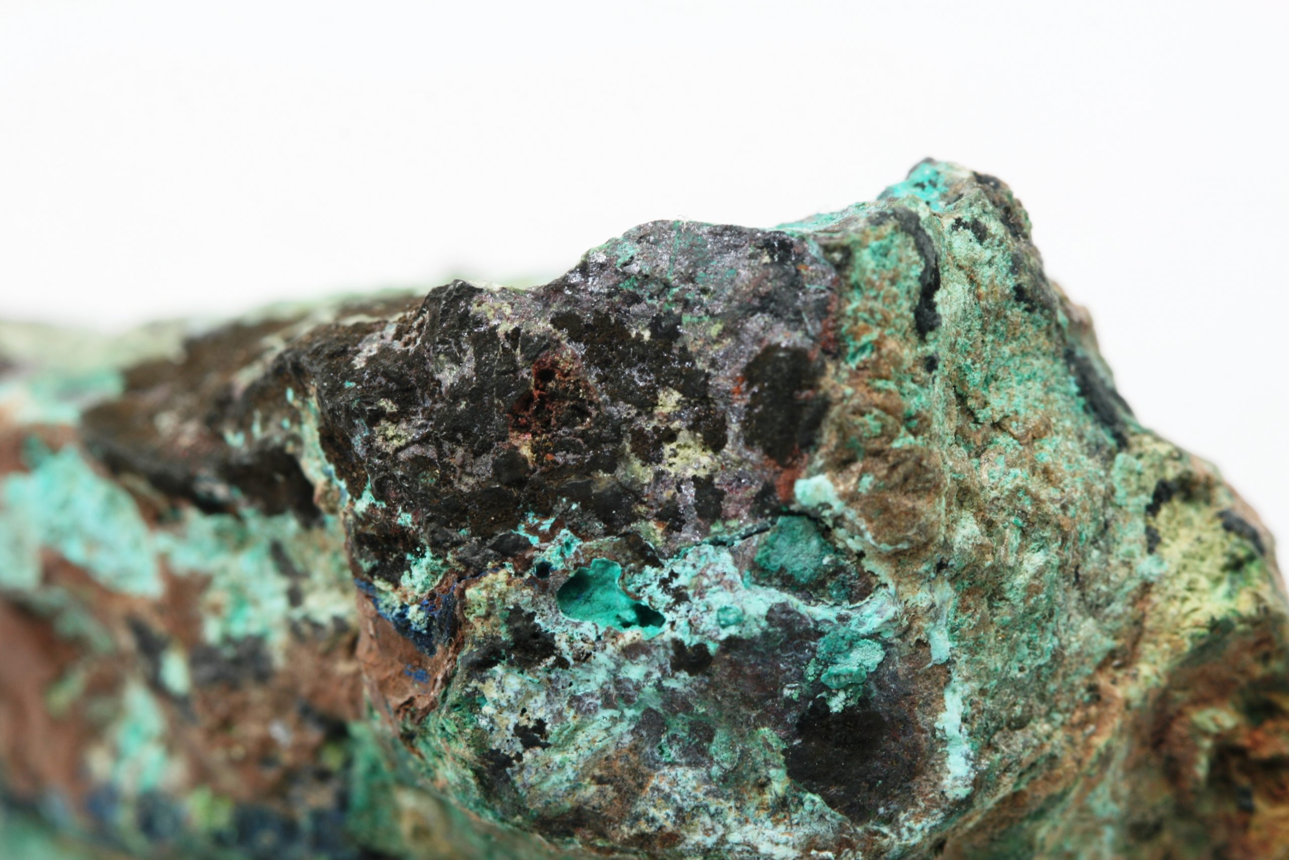 Beautiful specimen of black domeykite coating, blue azurite, and green malachite. The specimen comes from the well-known Bělovs.