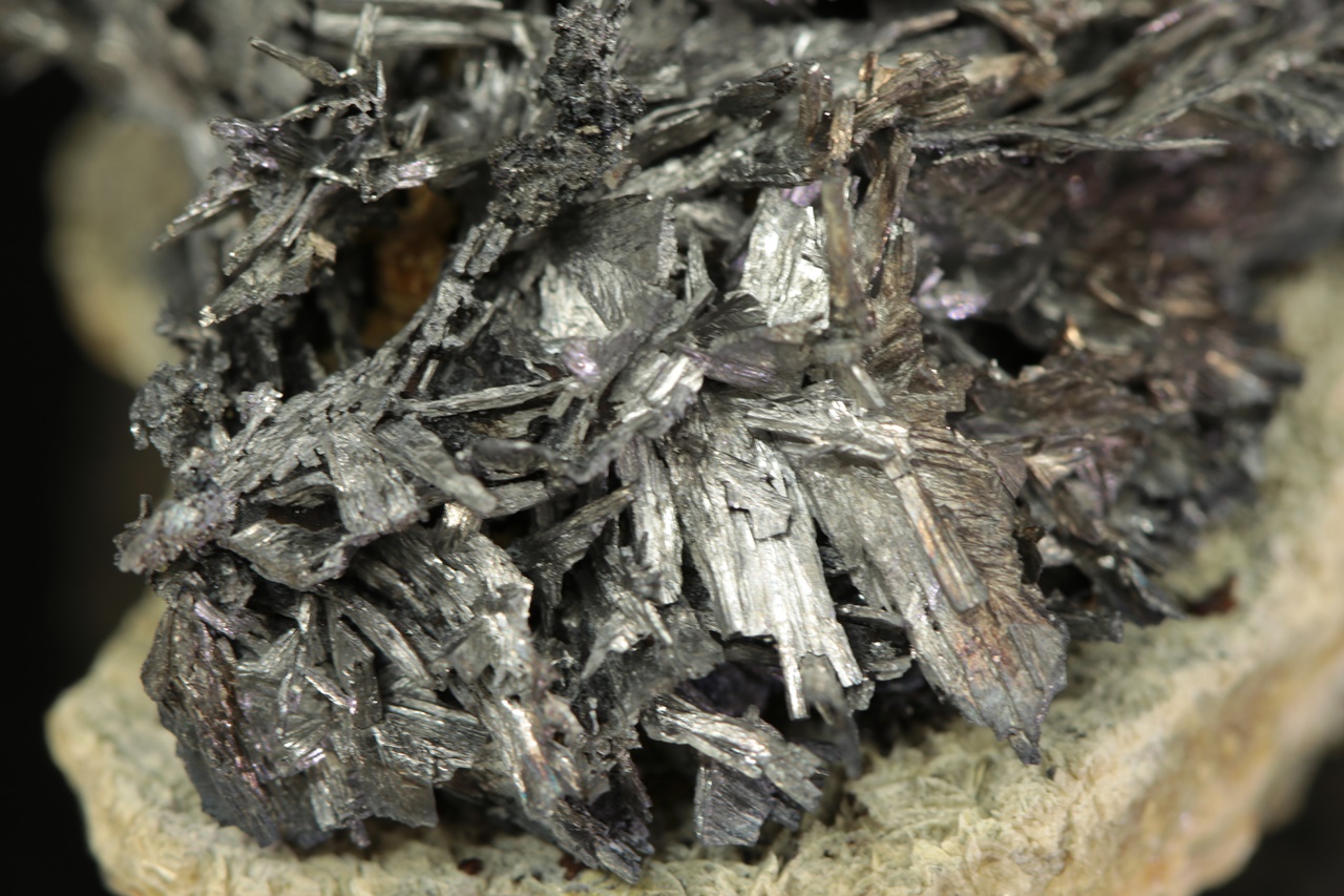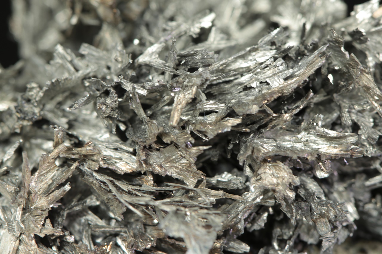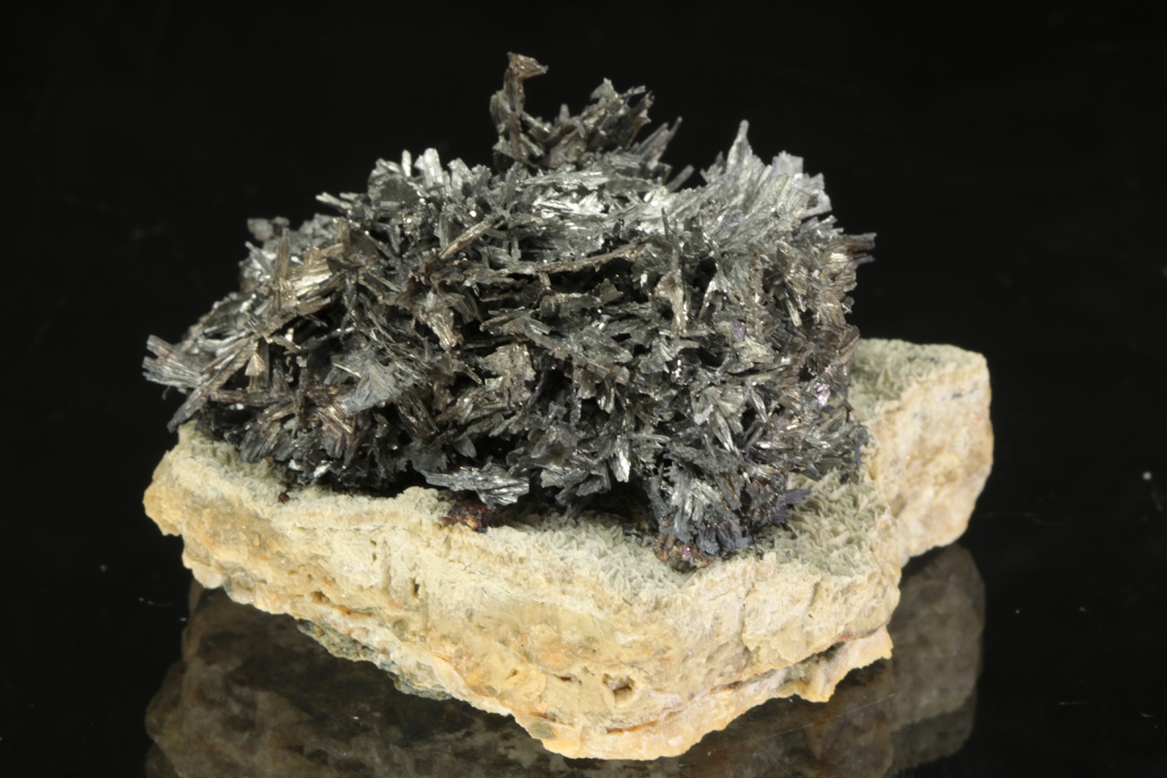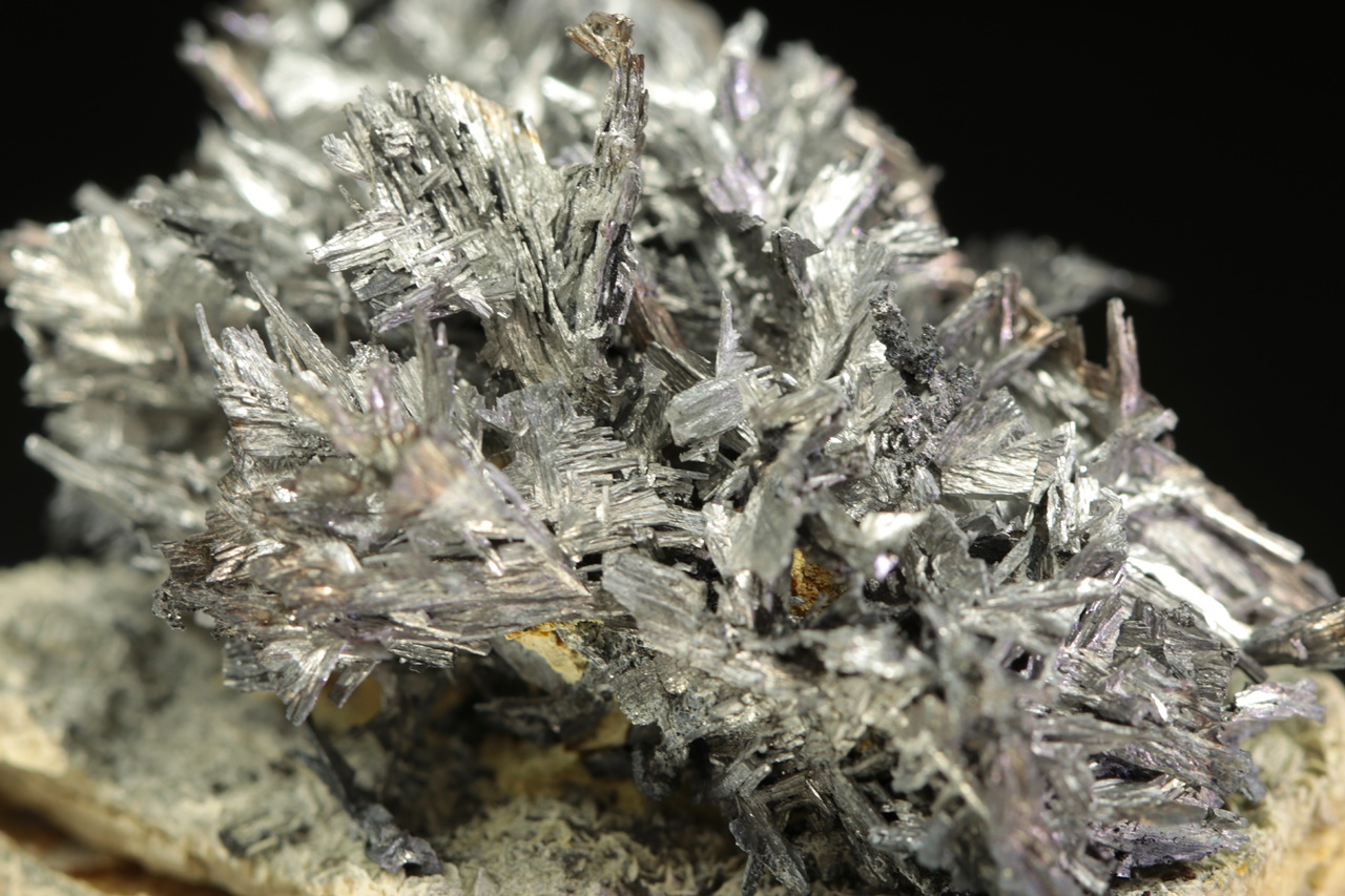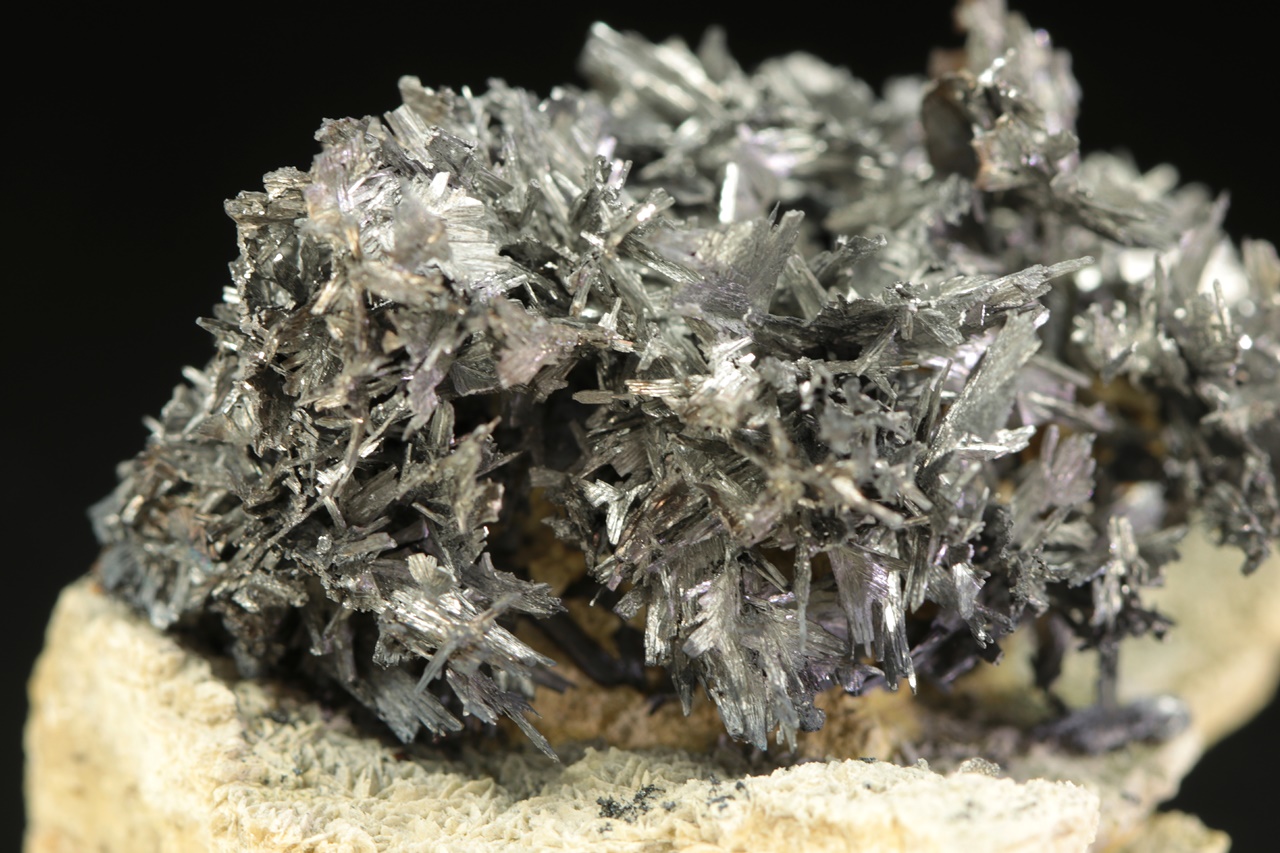 Druse of tabular to flaky, often twinned crystals of silver Dyskrazit on a carbonate matrix. The crystals are around 1 cm in size.