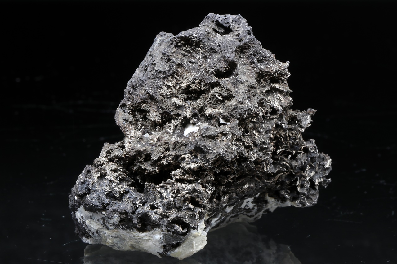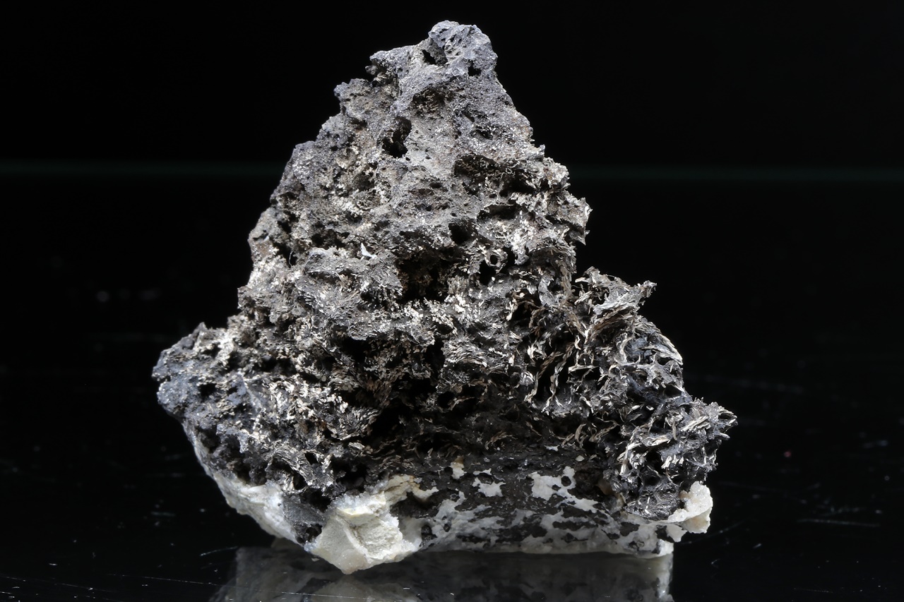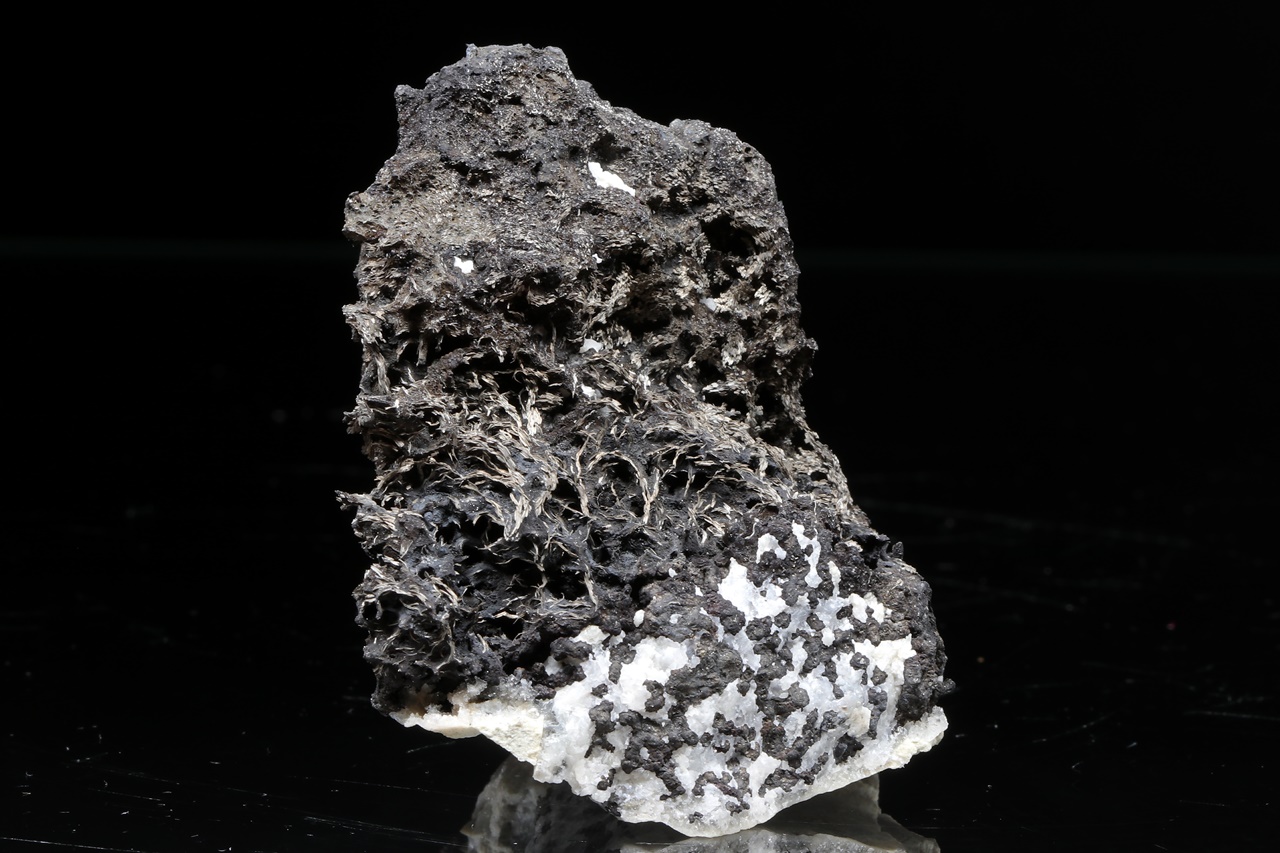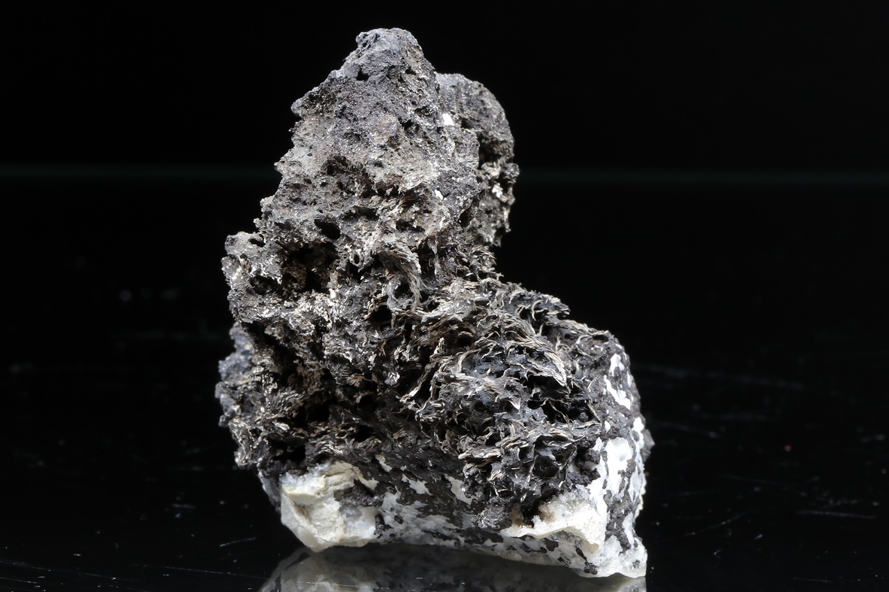 Dendritic crystals of metallic lustrous Dyskrazite in black Arsenic, which penetrate with white Quartz. The sample cannot be sent, it is only possible to pick it up personally in our store.
