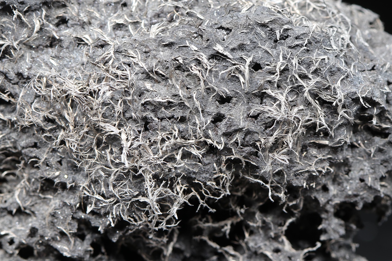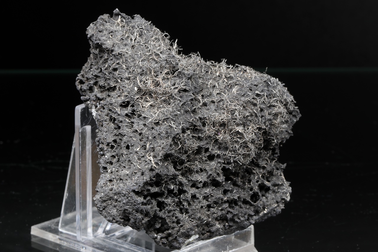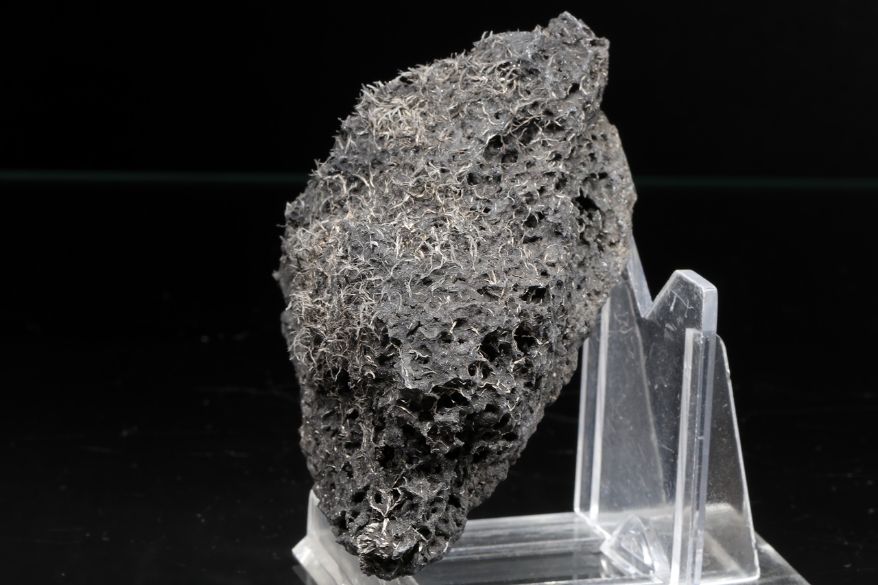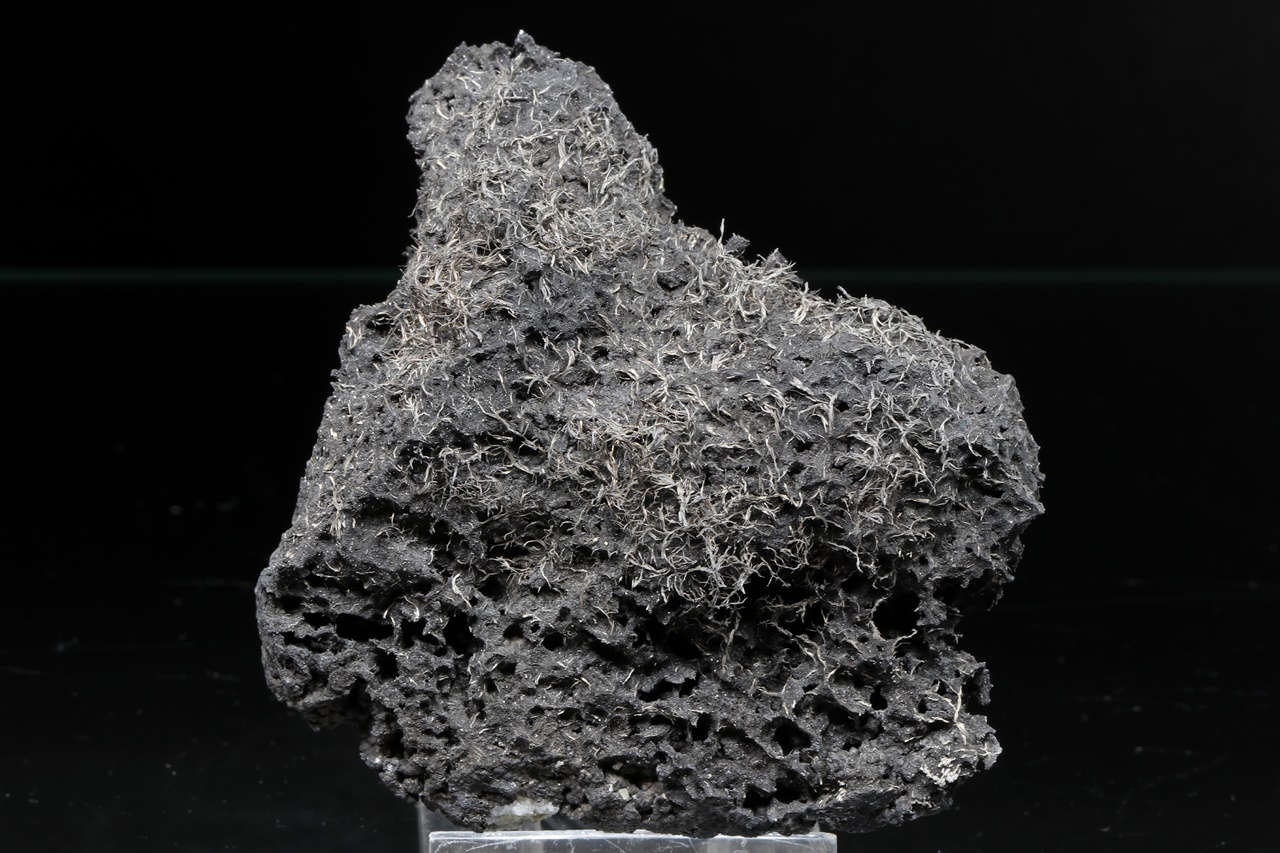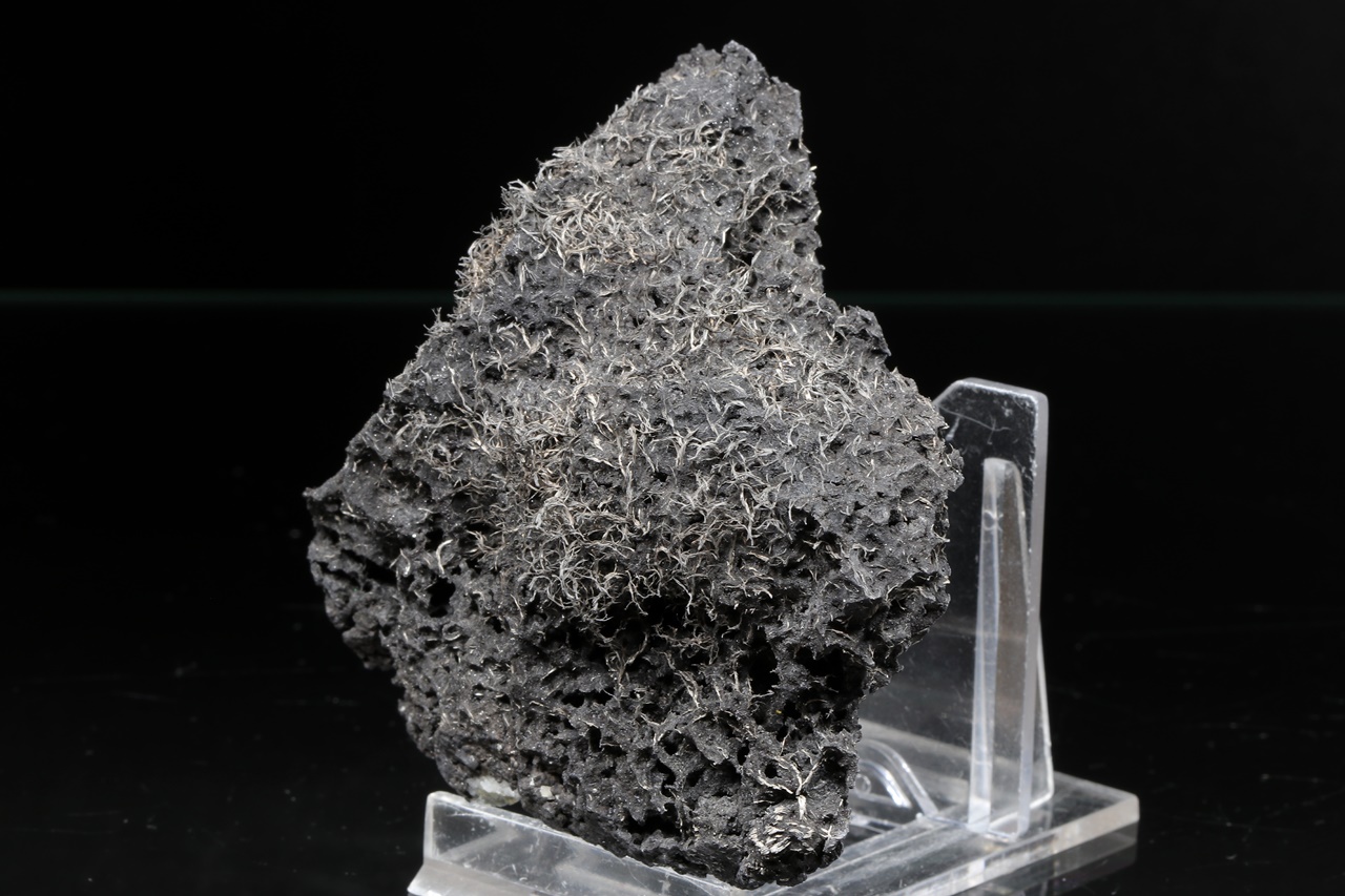 A rich specimen of dendritically grown dyskrazite in black Native Arsenic. The specimen cannot be shipped and is only available for pickup in our store.
