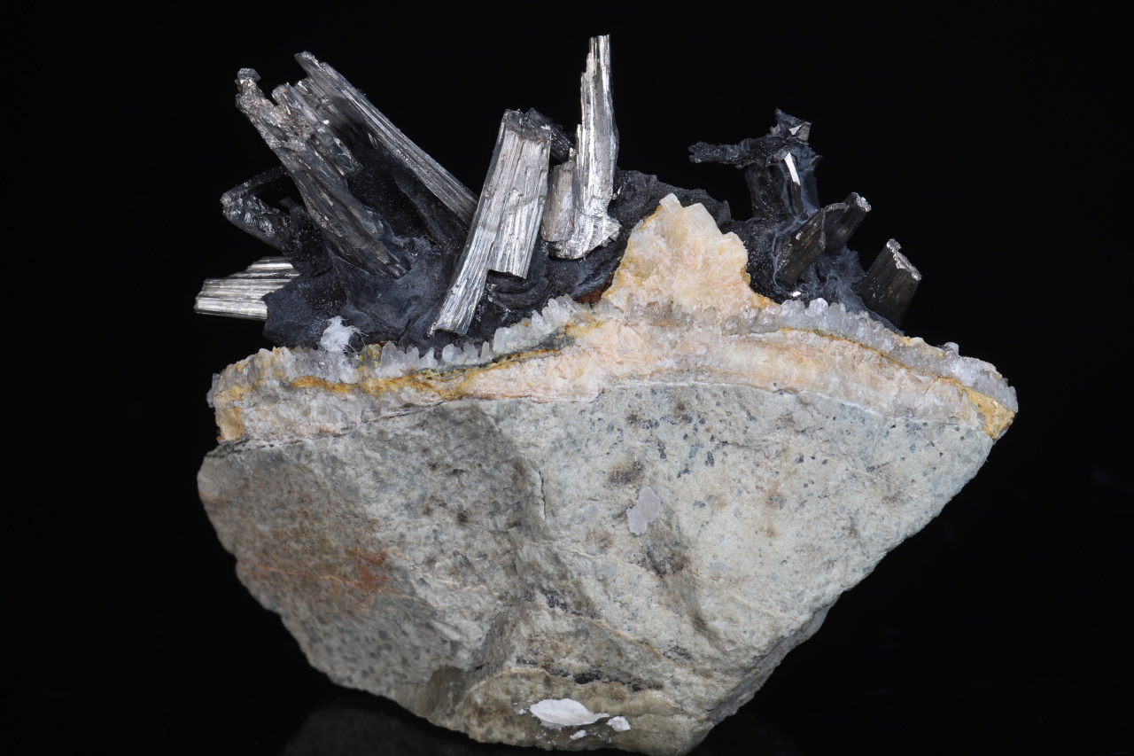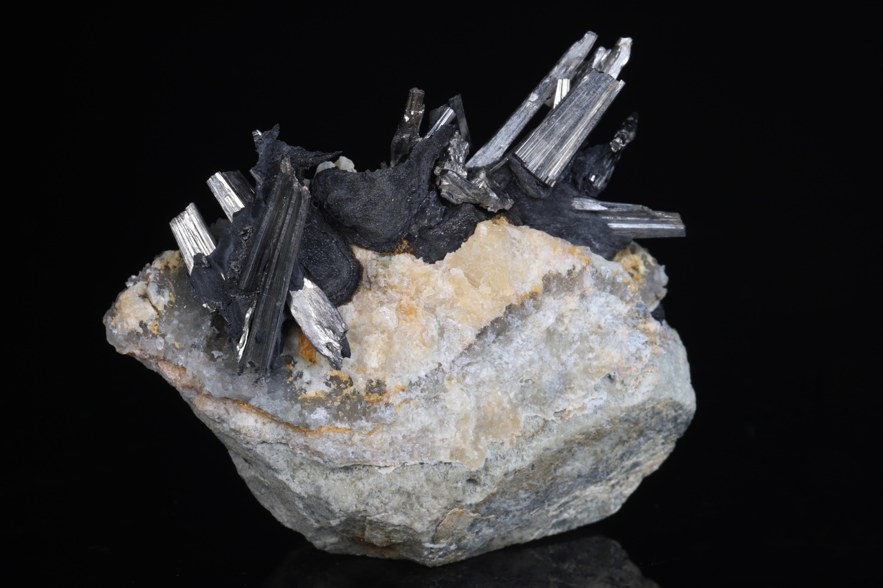 Menší ale velmi pěkná, odborně vyleptaná ukázka stříbrobílých lištovitých krystalů dyskrazitu vystupujících z černého arsenu. Vzorek pochází ze slavných nálezů z uranového dolu č. 21 v Příbrami. Krystaly dosahují délky až 13 mm.