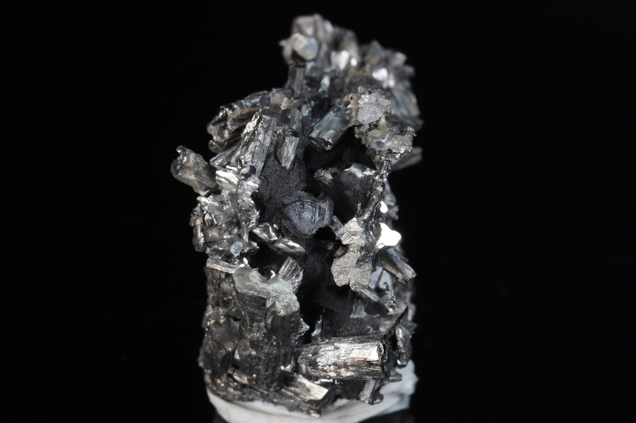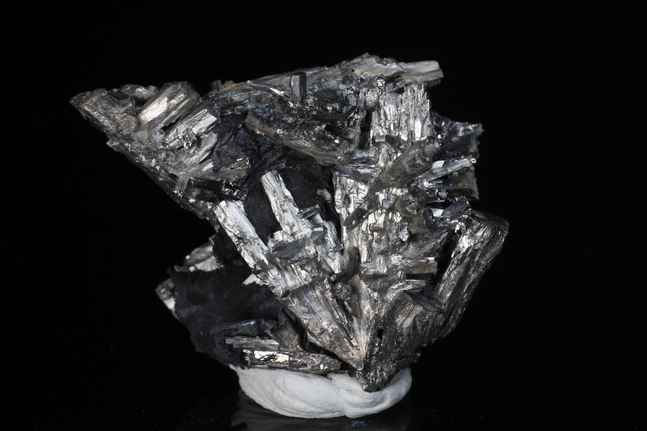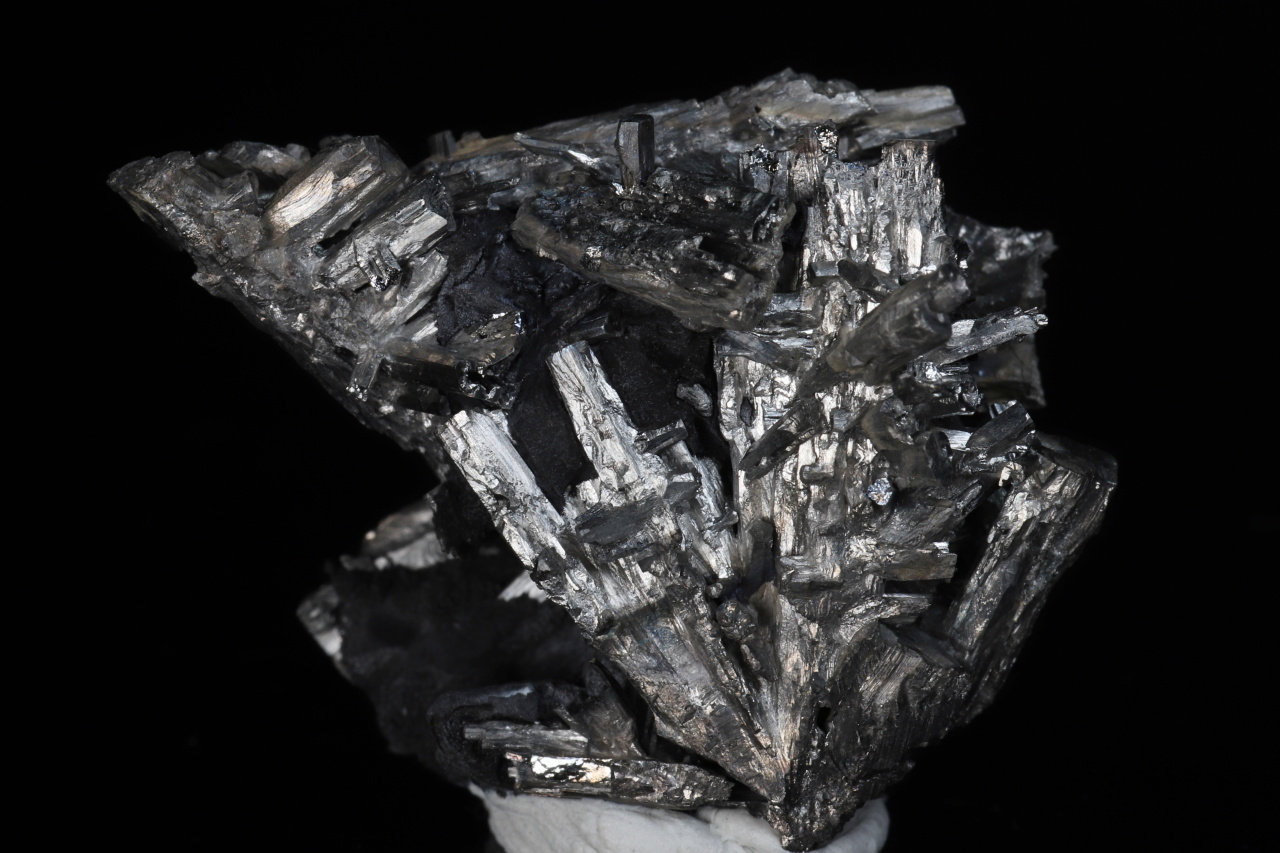 Menší, ale velmi bohatá estetická odborně vyleptaná ukázka stříbrobílých lištovitých krystalů dyskrazitu vystupujících z černého arsenu. Vzorek pochází ze slavných nálezů z uranového dolu č. 21 v Příbrami. Krystaly dosahují délky až 20 mm.