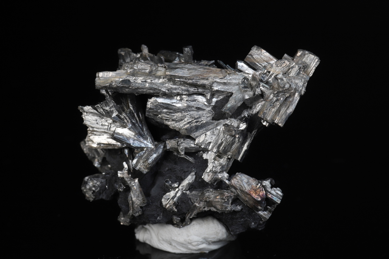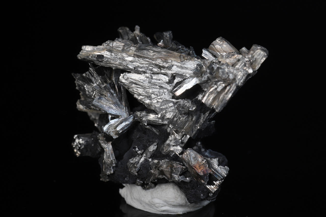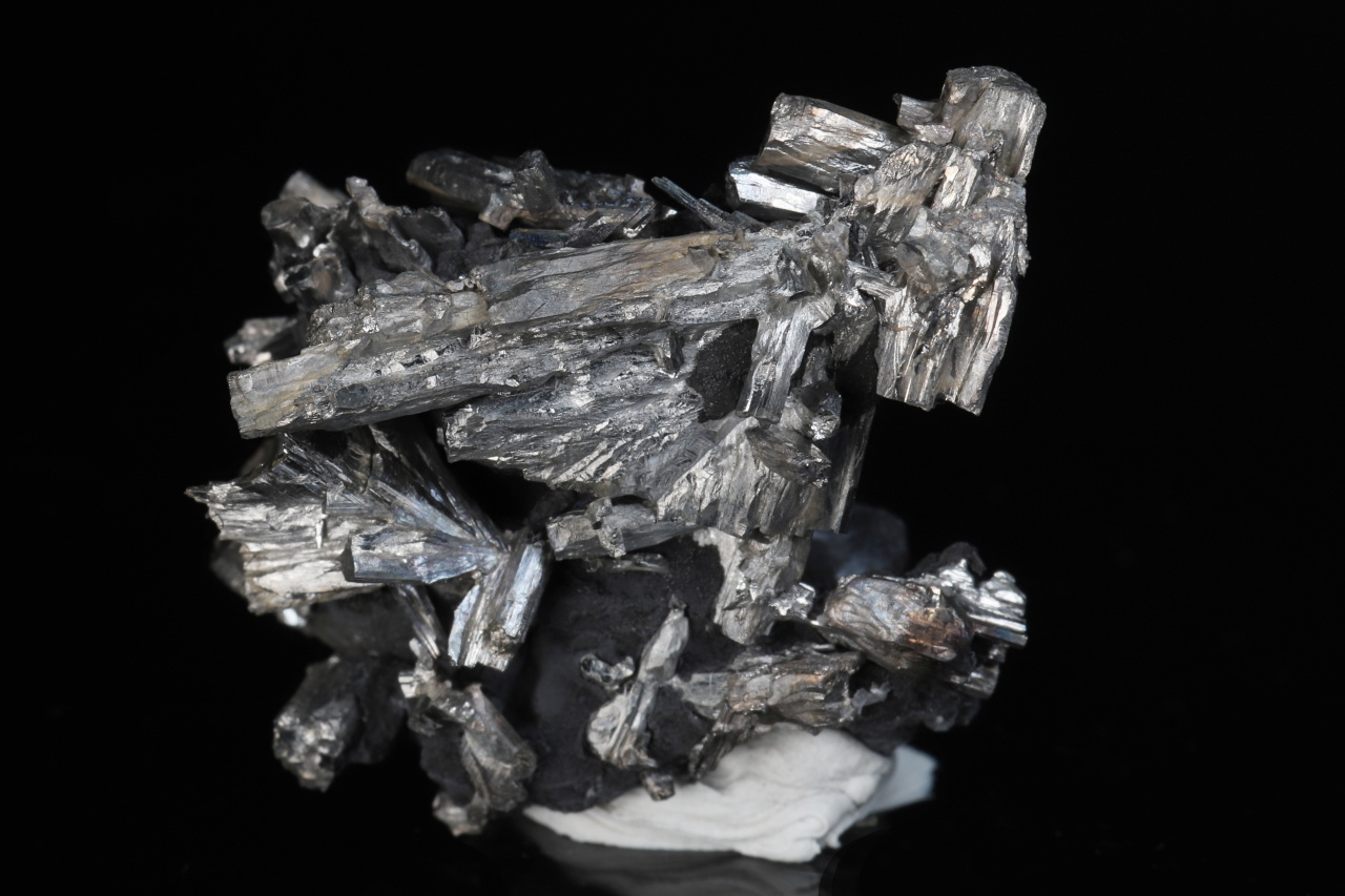 Menší, ale velmi bohatá estetická odborně vyleptaná ukázka stříbrobílých lištovitých krystalů dyskrazitu vystupujících z černého arsenu. Vzorek pochází ze slavných nálezů z uranového dolu č. 21 v Příbrami. Krystaly dosahují délky až 20 mm.