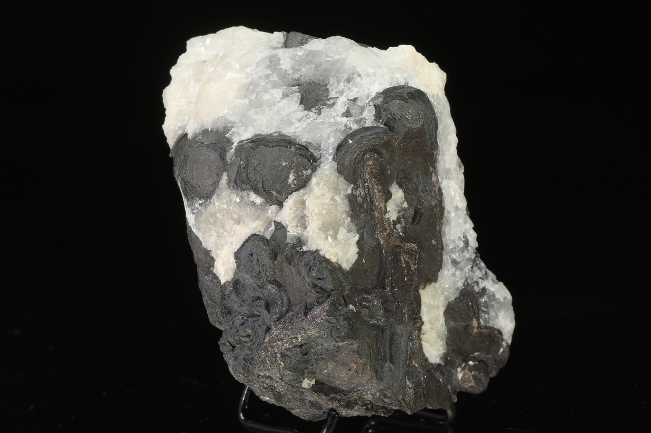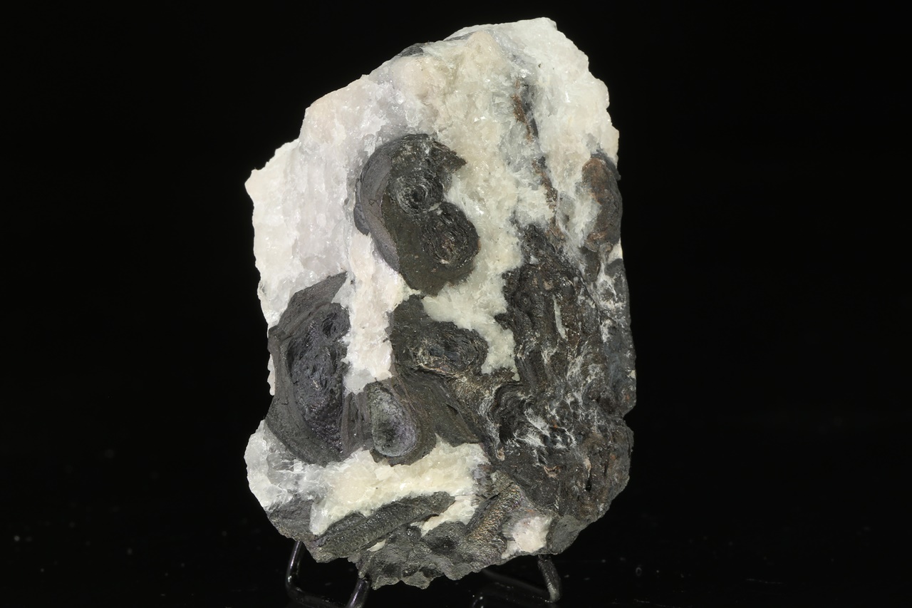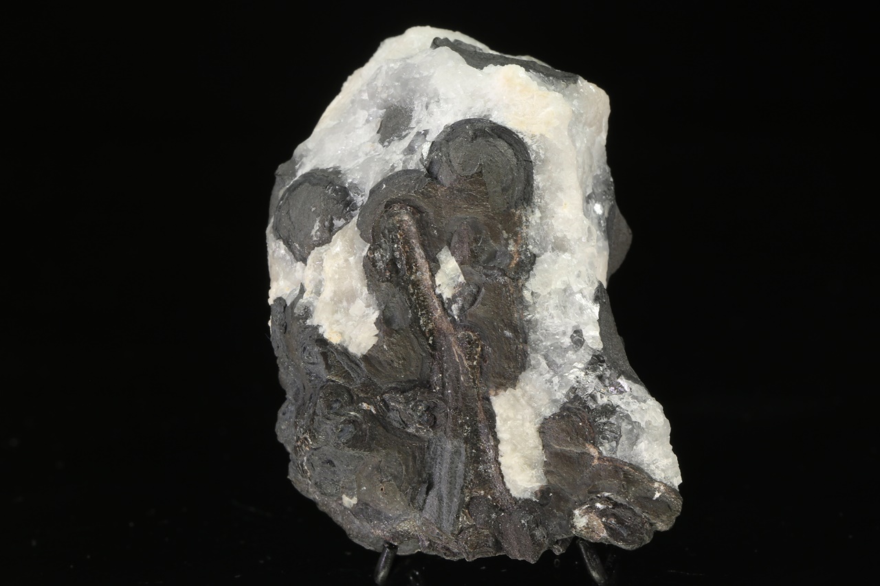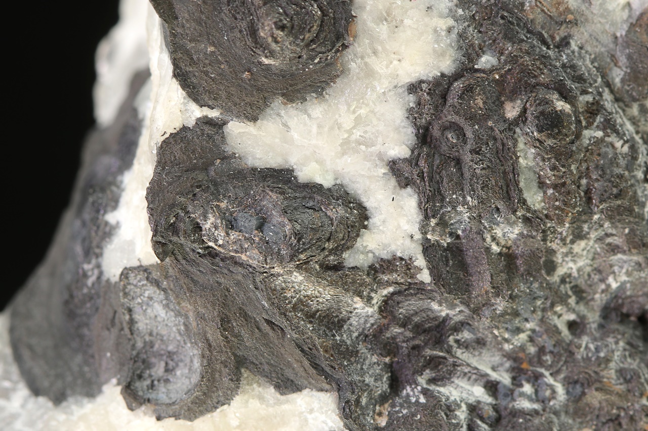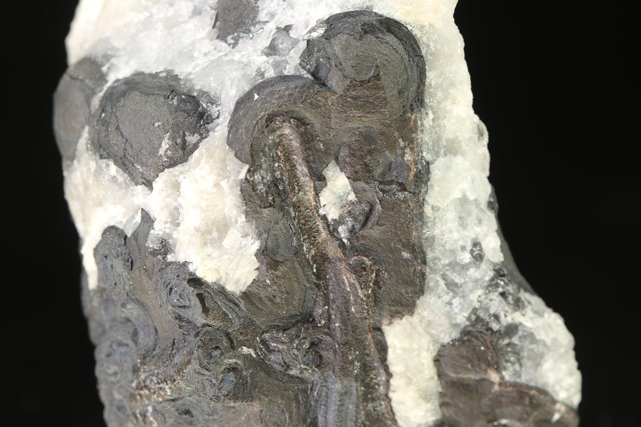Elongated blade-like crystals of metallic lustrous dyscrasite intergrown with black stalactitic aggregates of arsenic. Natural, unetched specimen.