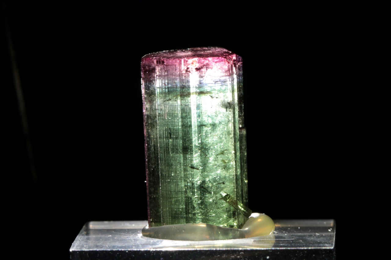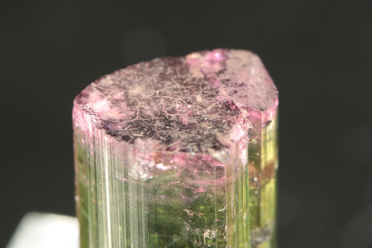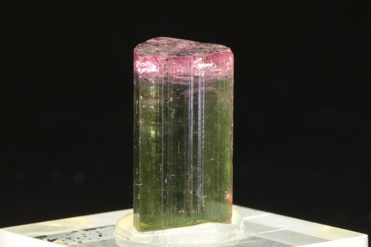 Beautiful translucent tourmaline crystal with a green base and intensely pink top.