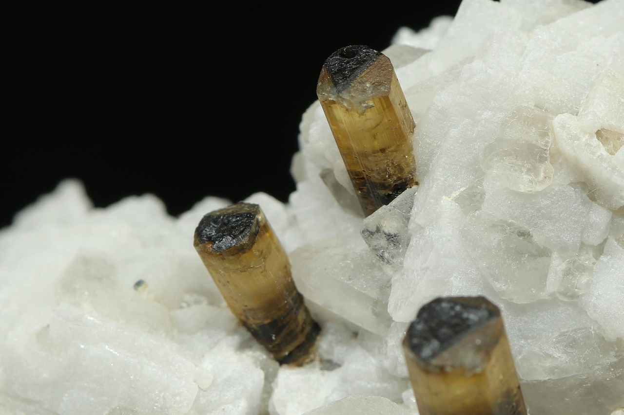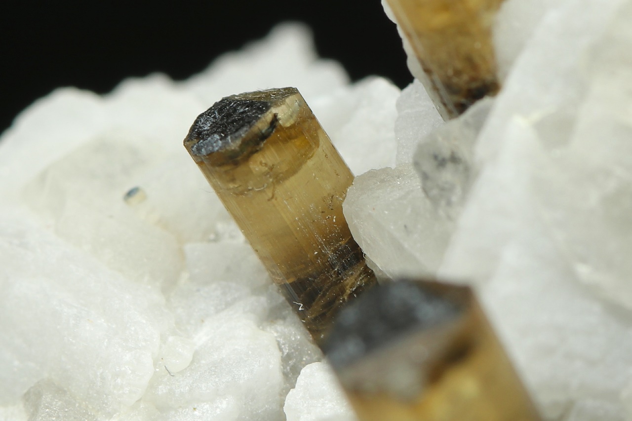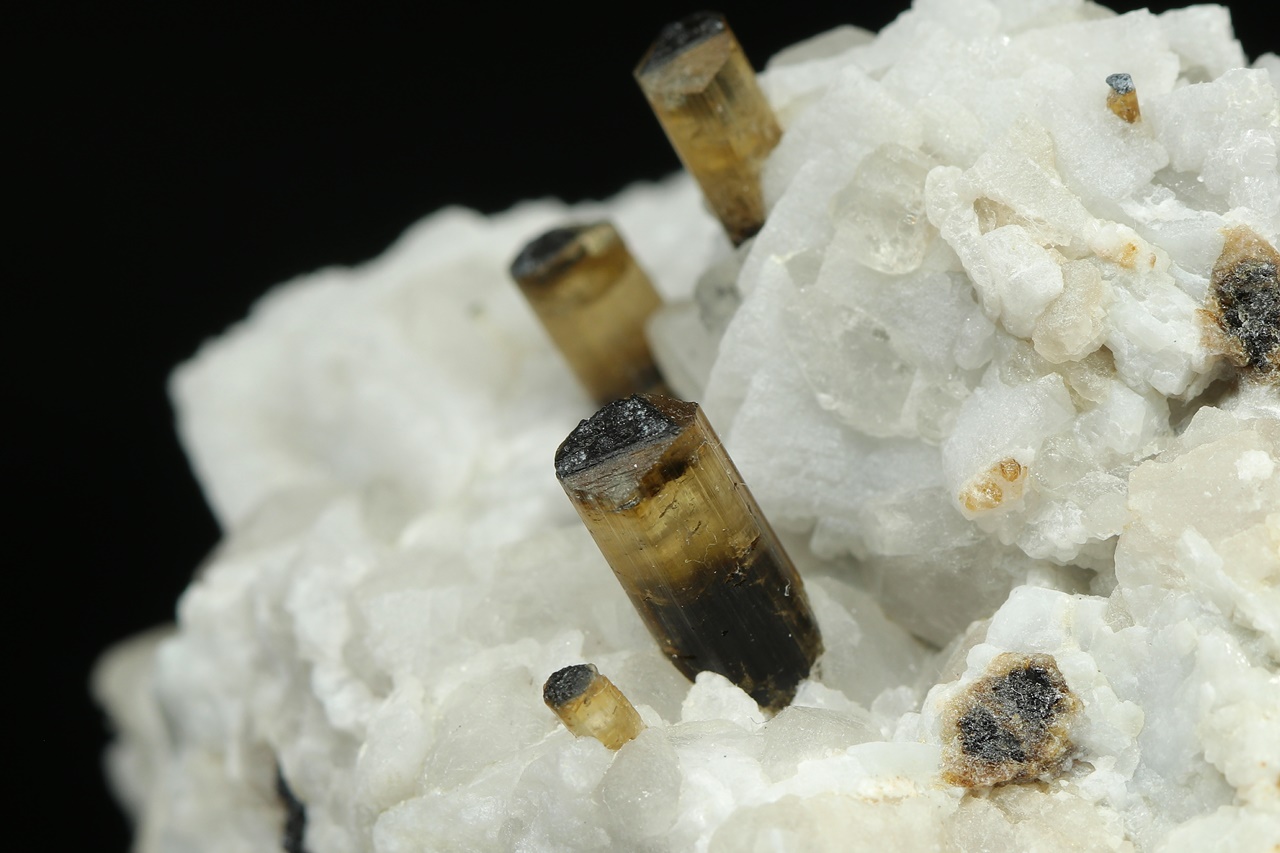 Columnar crystals of transparent tourmaline with pronounced zoning growing from an albite base. The largest tourmaline crystal is 10 mm in size. The sample is truncated at the bottom.