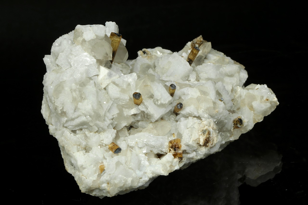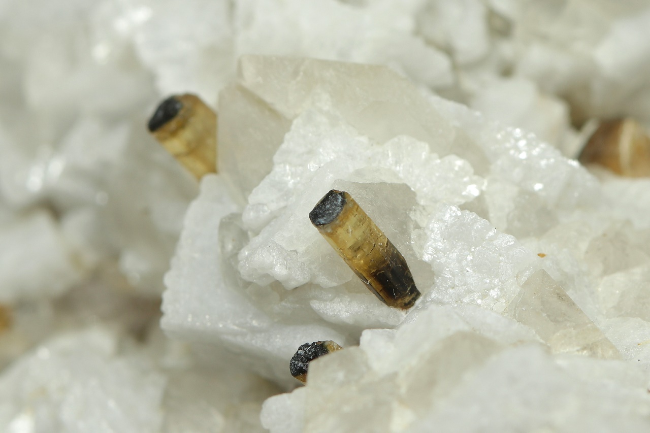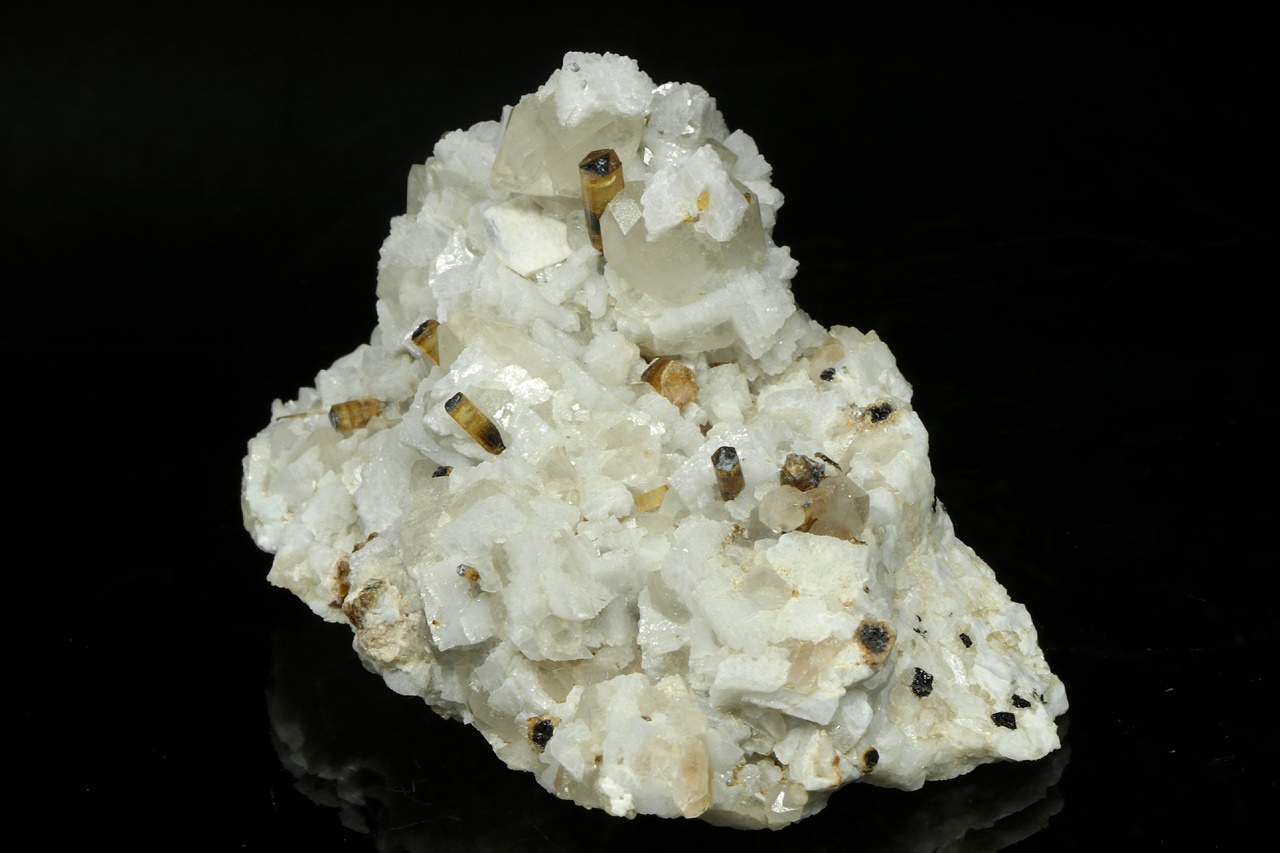 An aesthetic druse of intergrown albite and quartz with transparent crystals of elbaite showing distinct zoning. The largest elbaite crystal is 10 mm in size.