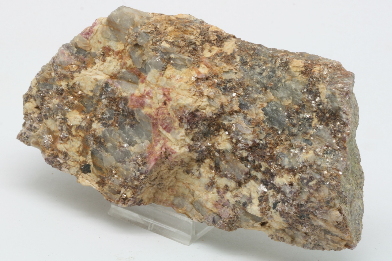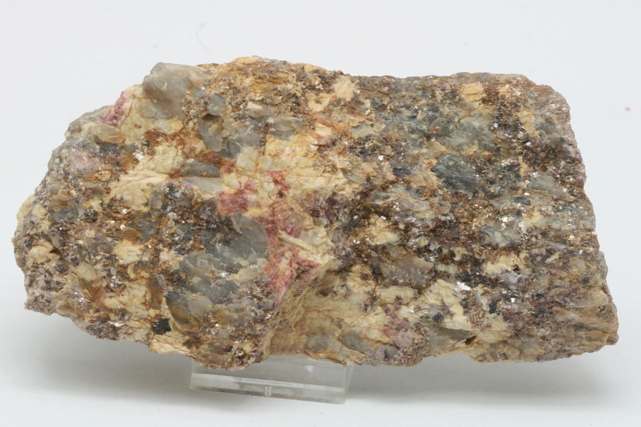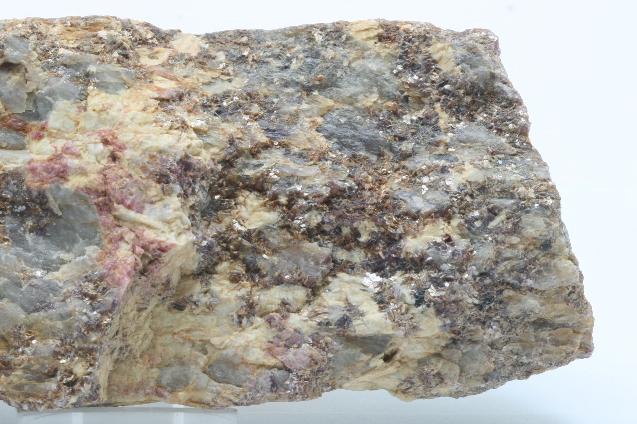 Several grains of pink tourmaline with a black grain of cassiterite and lepidolite