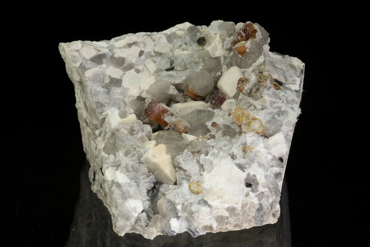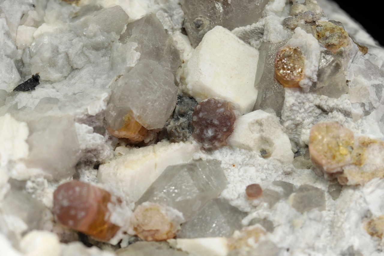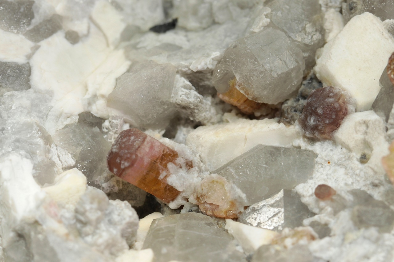 Crystals of colored tourmaline growing into a cavity formed by white Orthoclase and grayish Quartz. The tourmaline crystals are subsequently covered with fine-grained albite. The largest tourmaline crystal is 1 cm in size.