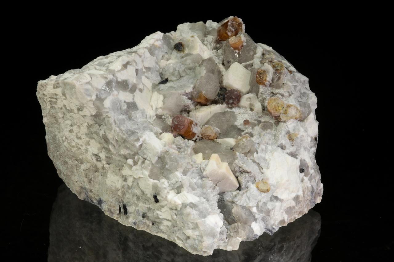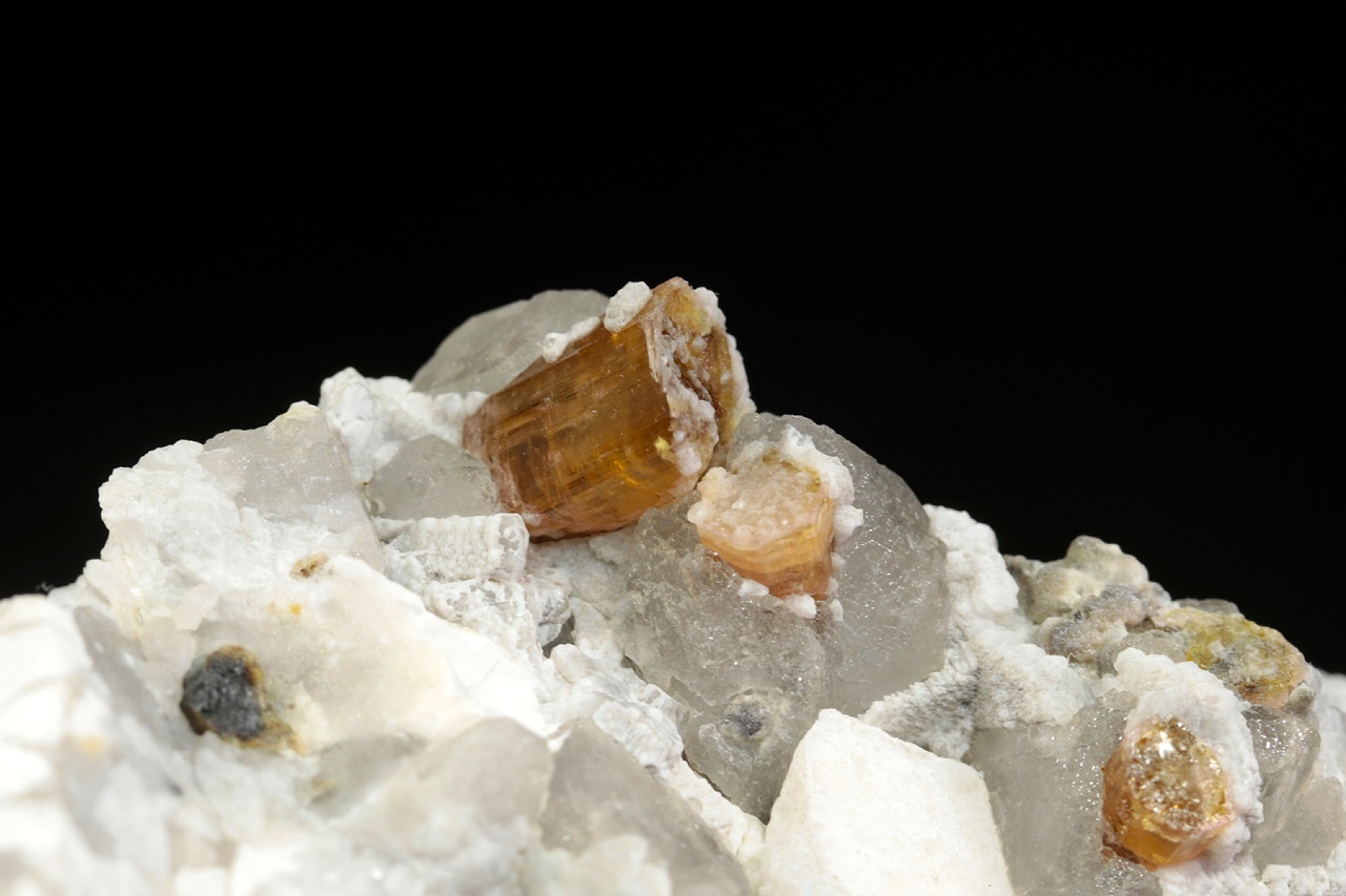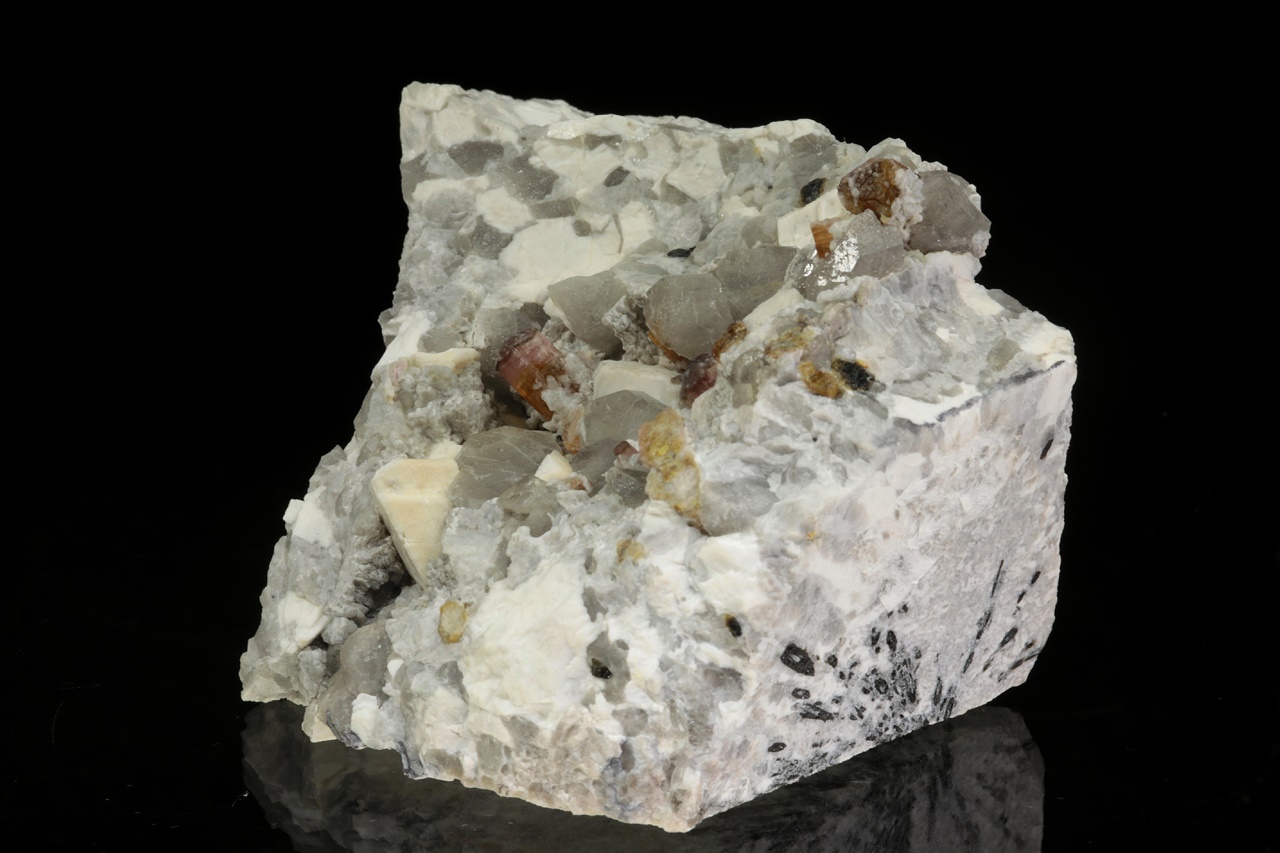 Crystals of colored tourmaline growing into a cavity formed by white Orthoclase and grayish Quartz. The tourmaline crystals are subsequently covered with fine-grained albite. The largest tourmaline crystal is 1 cm in size.