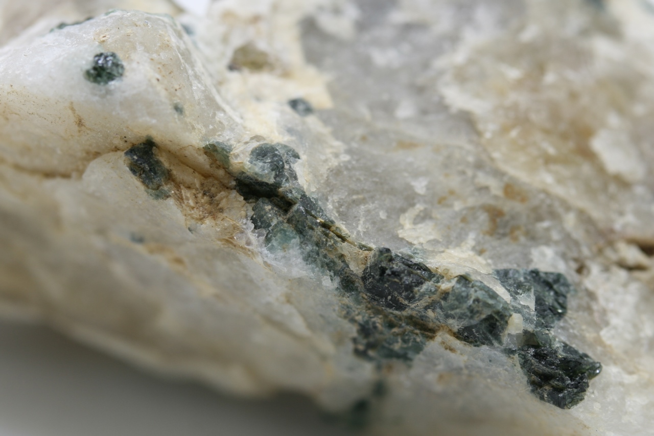 Grains of green tourmaline with dark brown zircon from the Chvalovice pegmatite. The largest grain of elbaite is 9 mm in size.