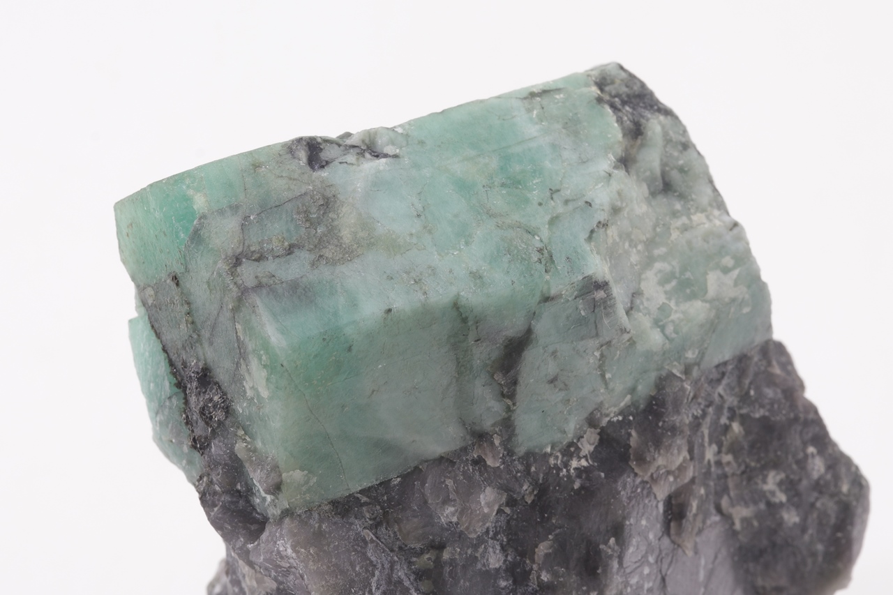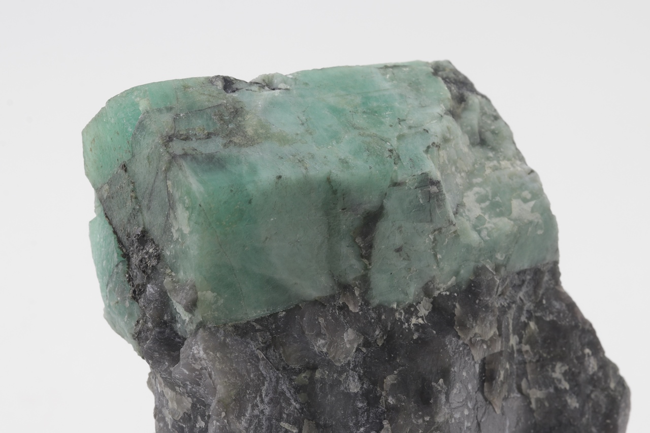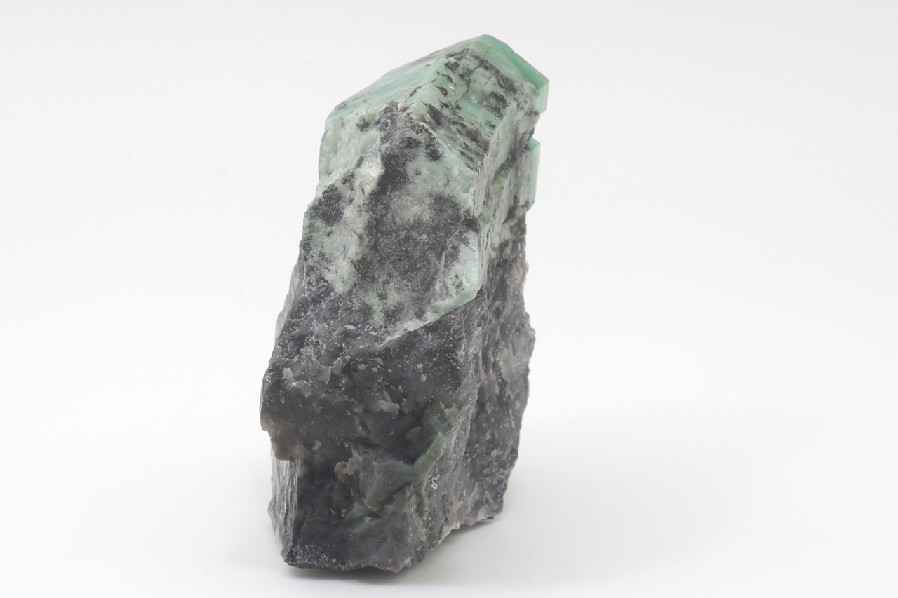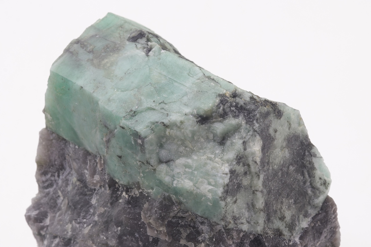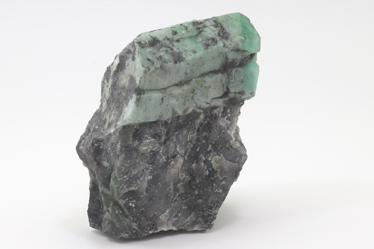 A large emerald crystal embedded in black calcite. The size of the crystal is 69 mm.