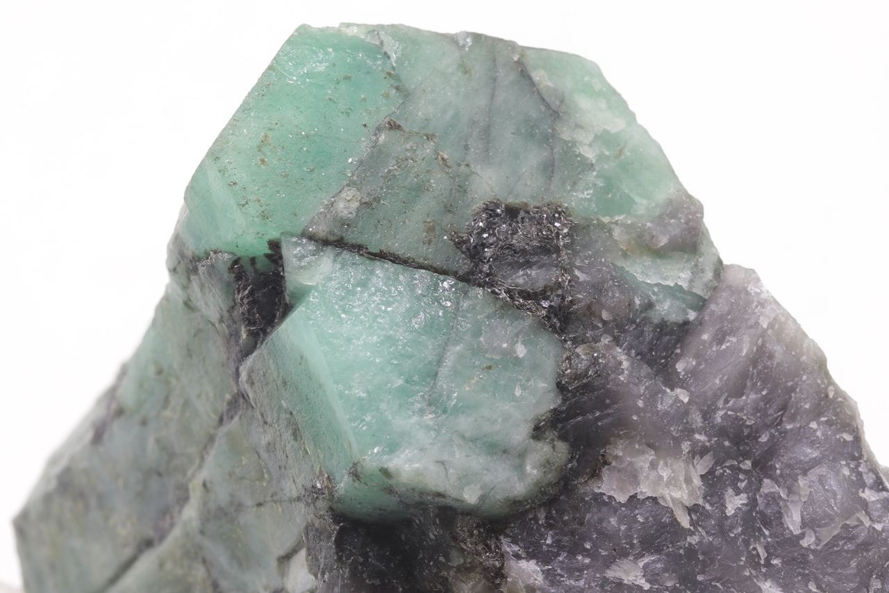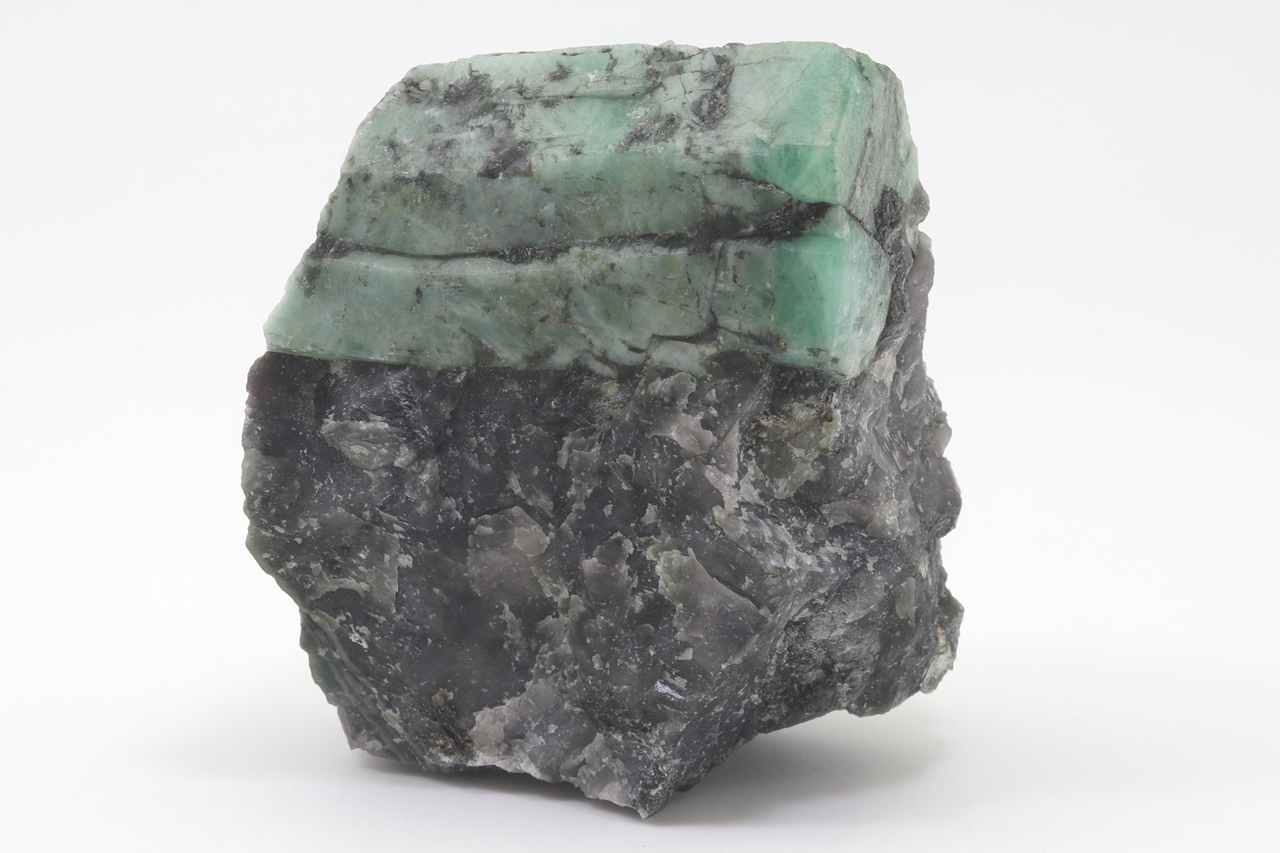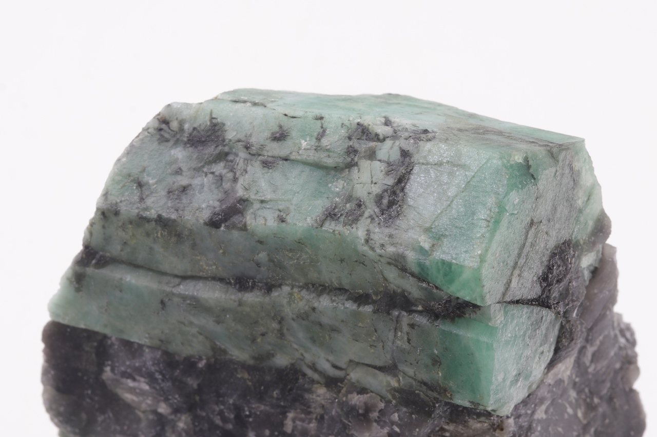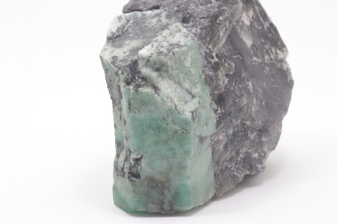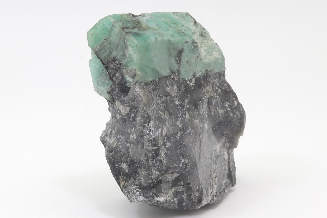 A large emerald crystal embedded in black calcite. The size of the crystal is 69 mm.