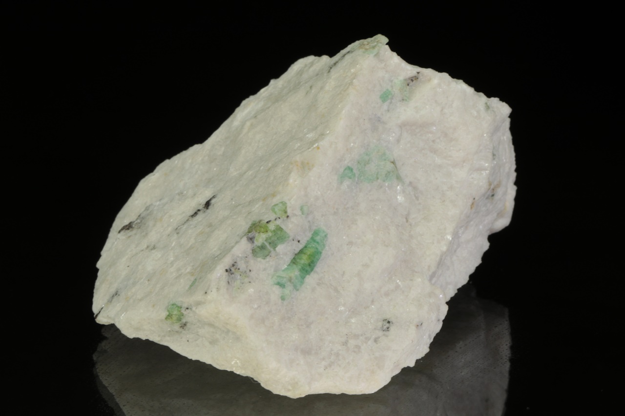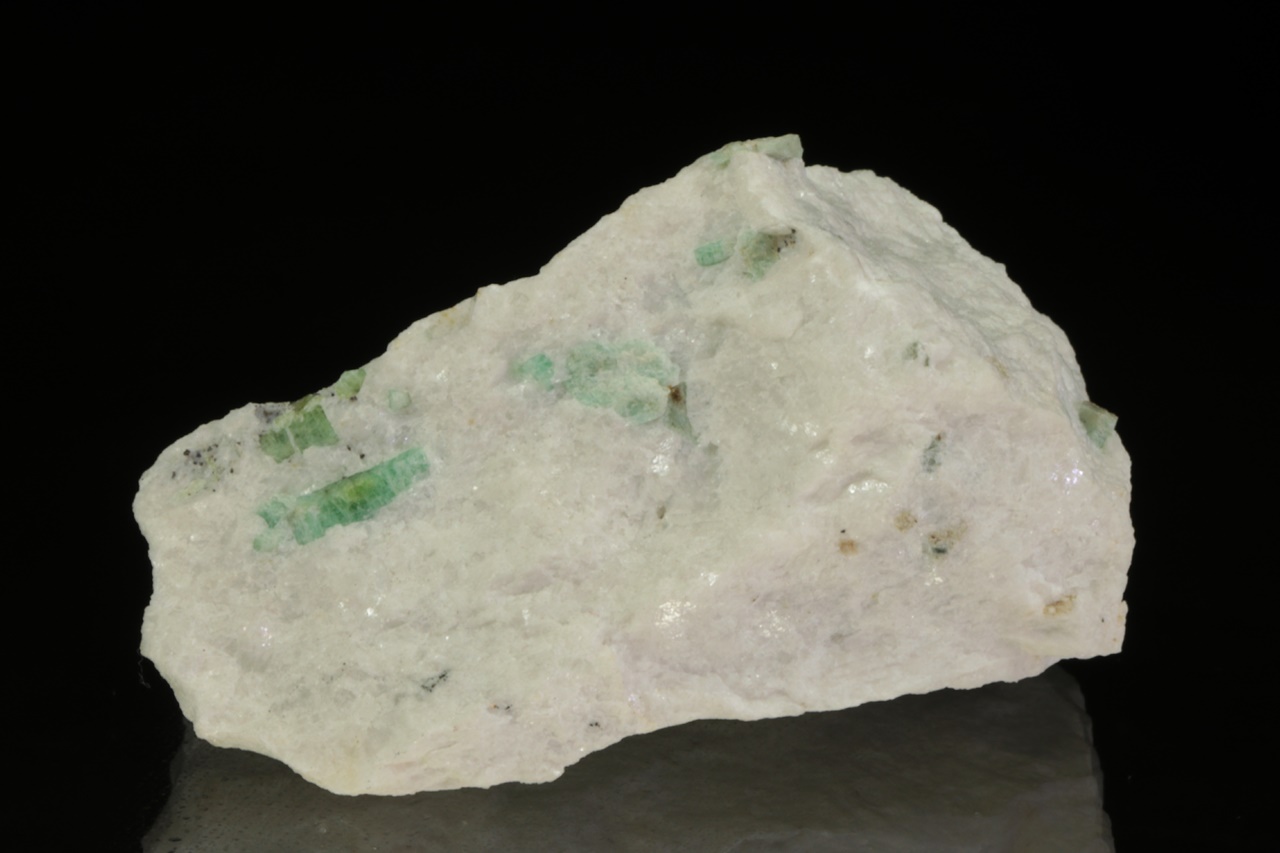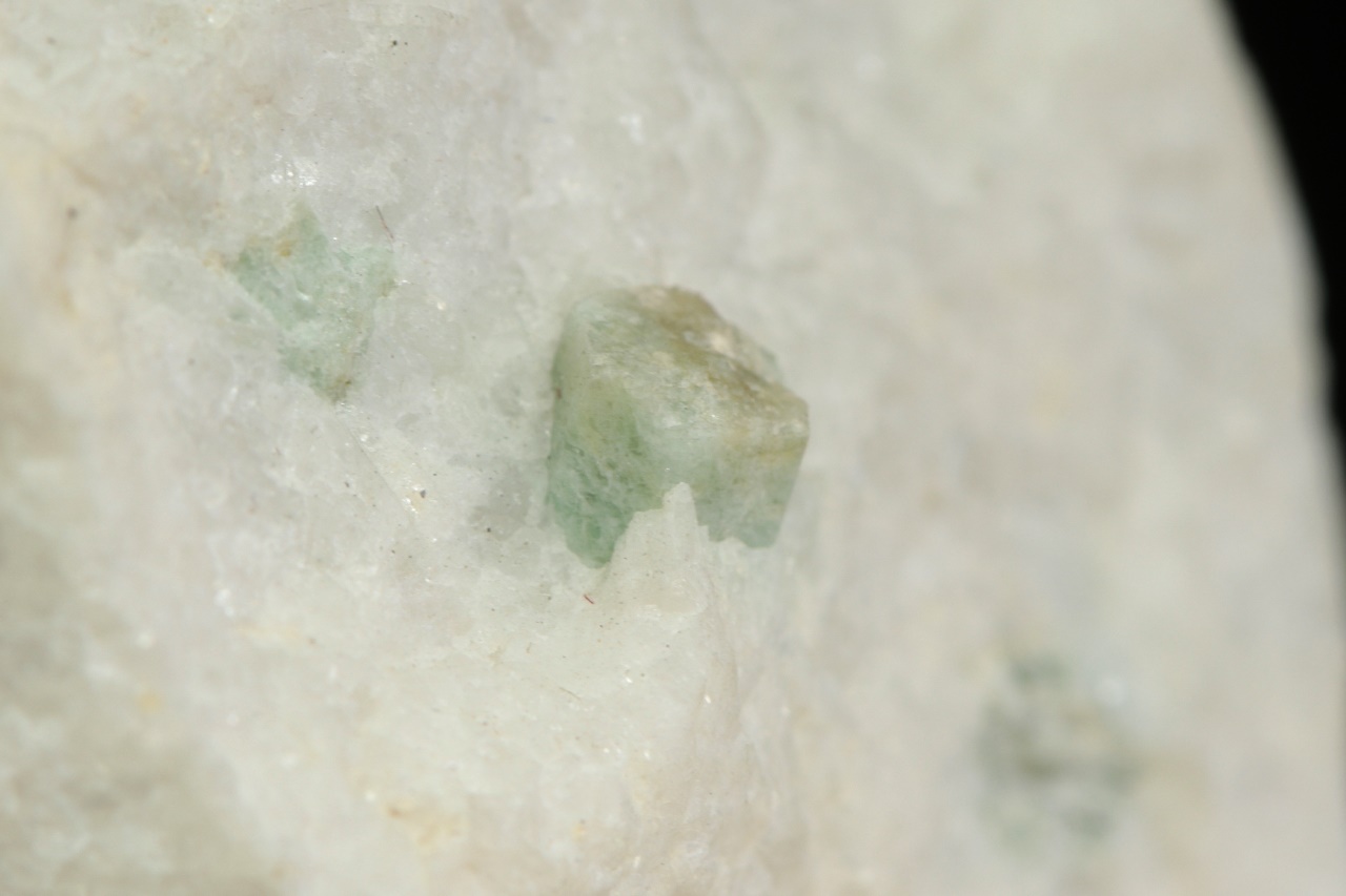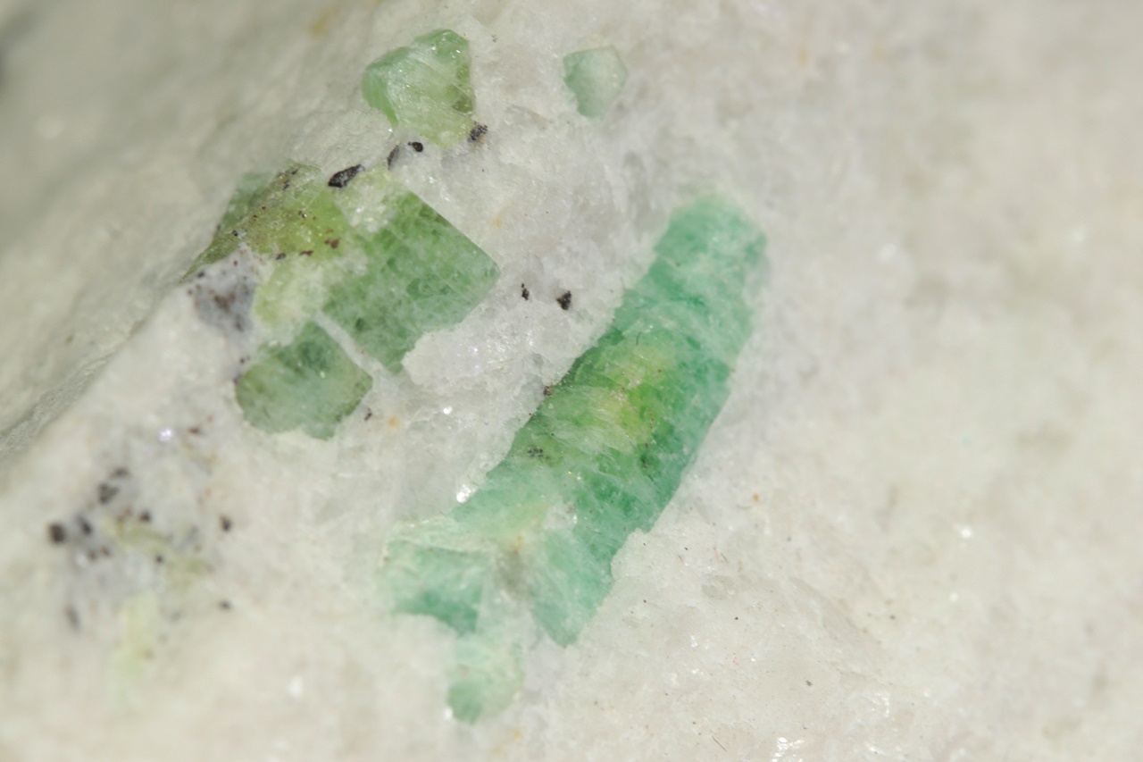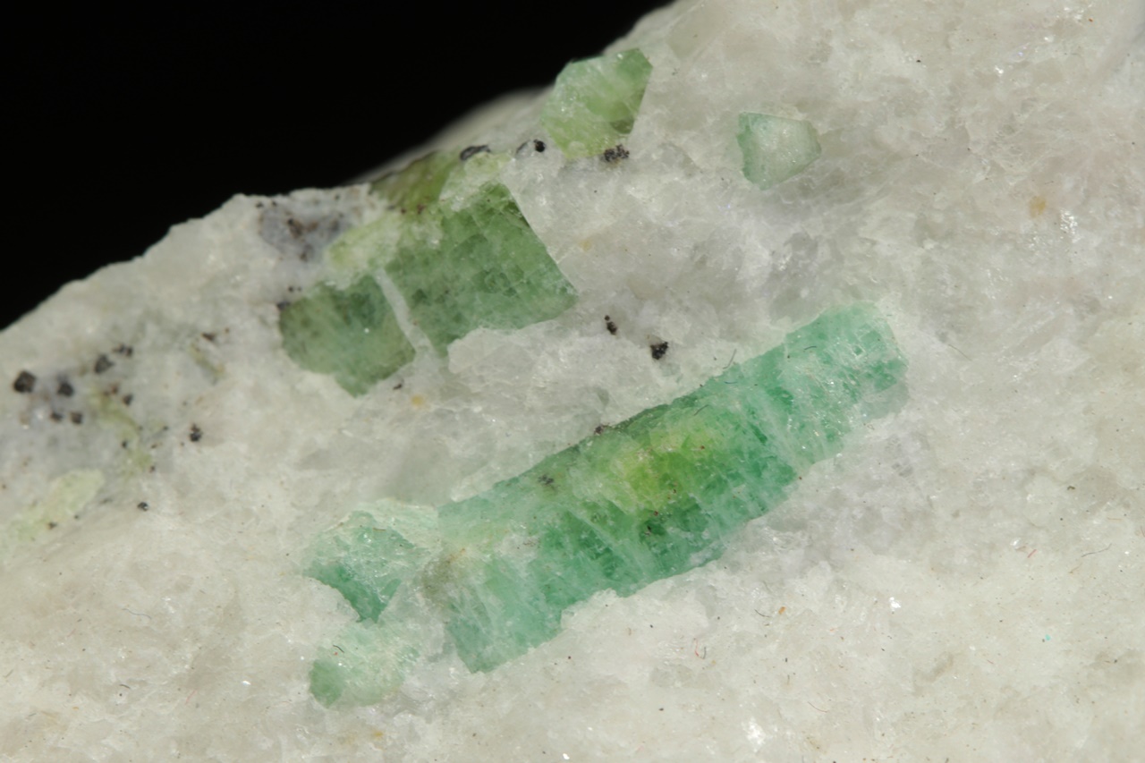Pale green beryl crystals in a calcite rock. The largest crystal is 14 mm in size.