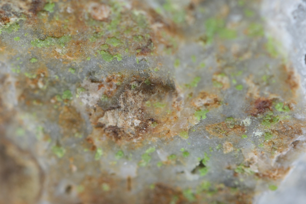 Tiny coatings of green Emmonsit. Rare oxide of tellurium and iron.