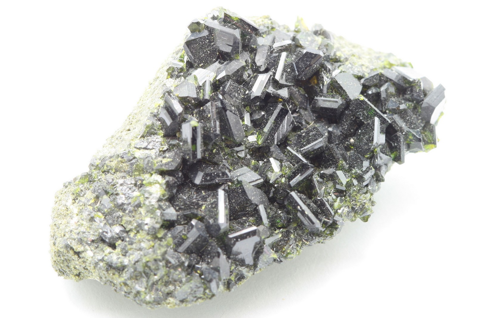 Až 8 mm velké krystaly epidotu.