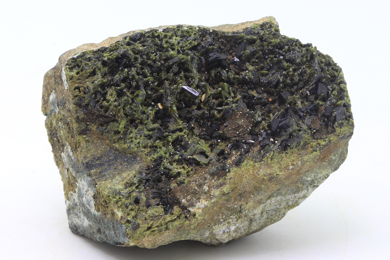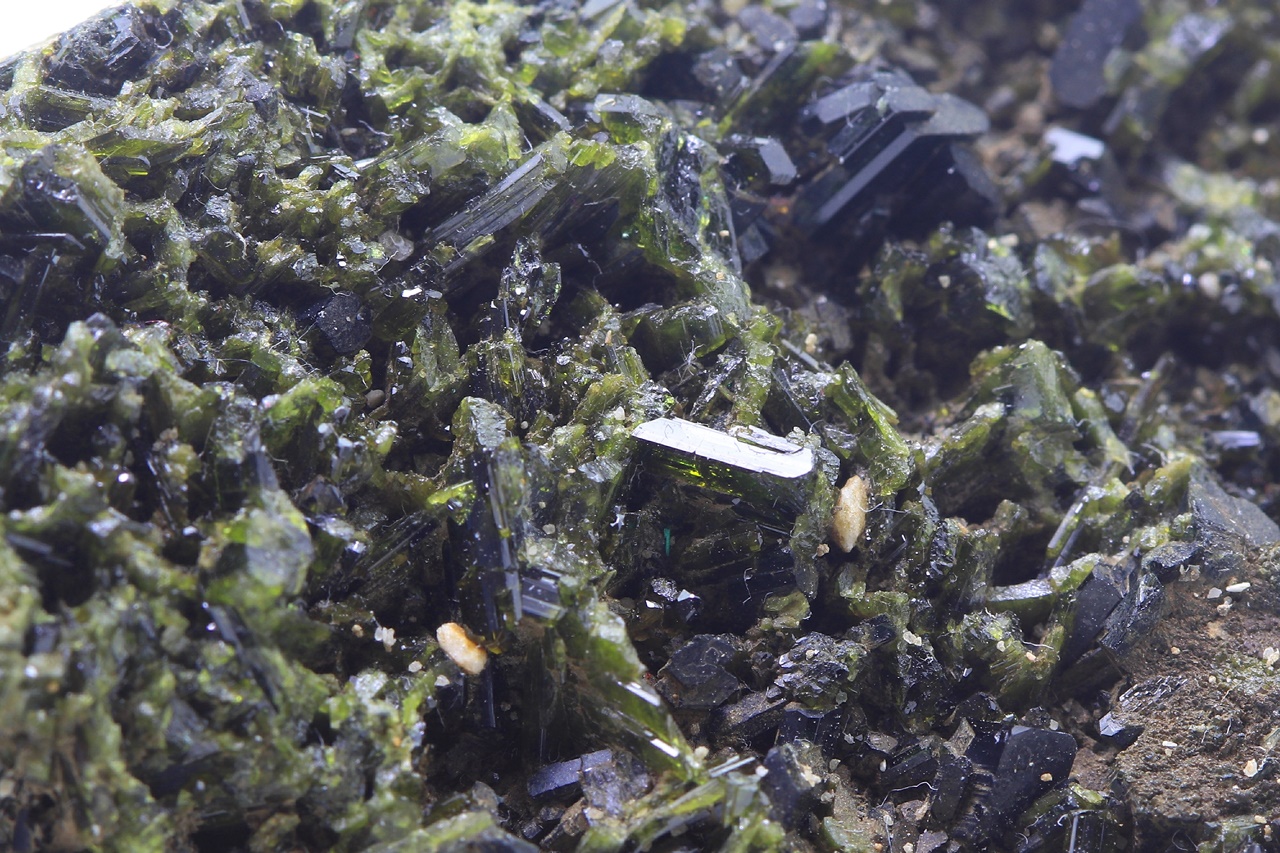 Druse of epidote crystals with strong green-brown pleochroism, this variety is referred to as “Pistacite”.