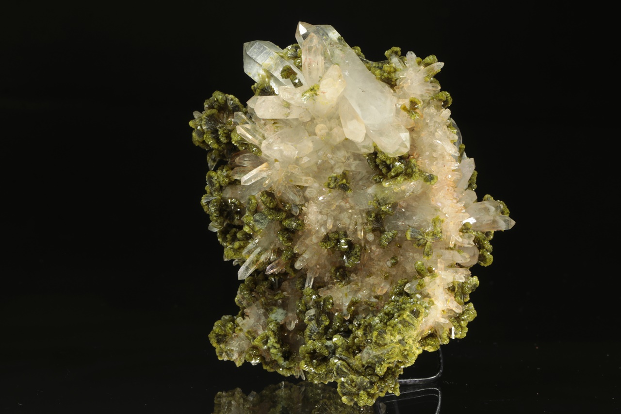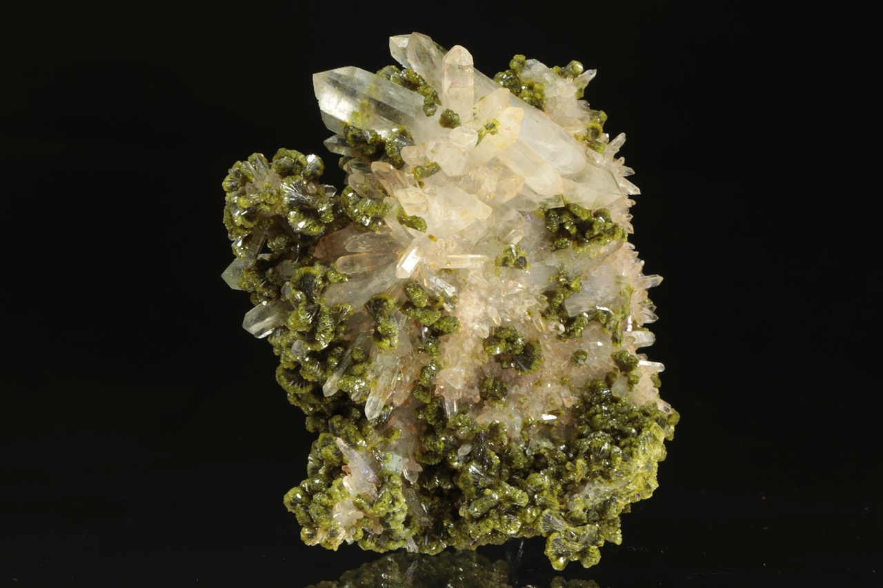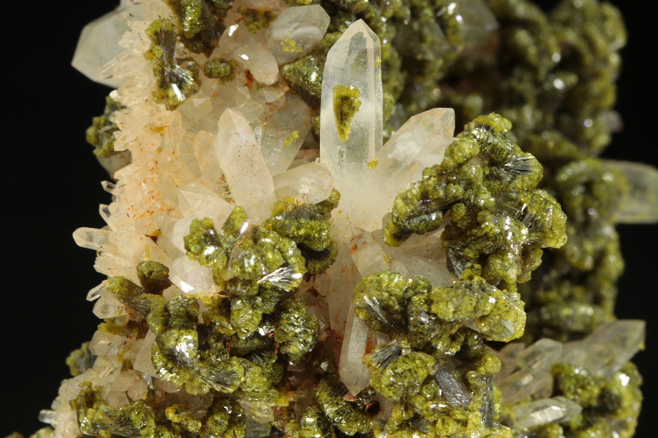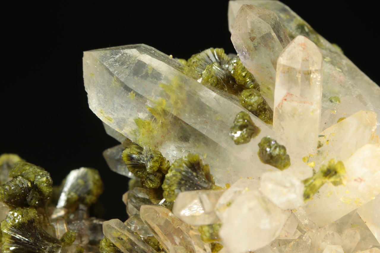 Cluster of clear quartz crystals up to 4 cm in length covered with fans of intensely green epidote, the tips of which transition into light green. The size of the epidote crystals in the fans is up to 4 mm.