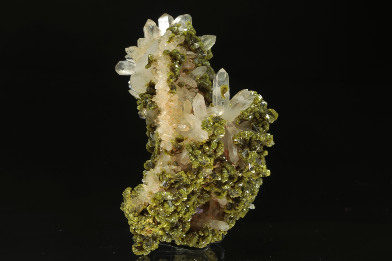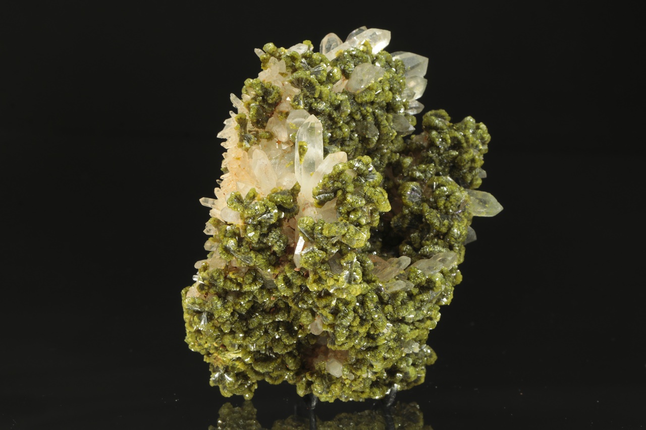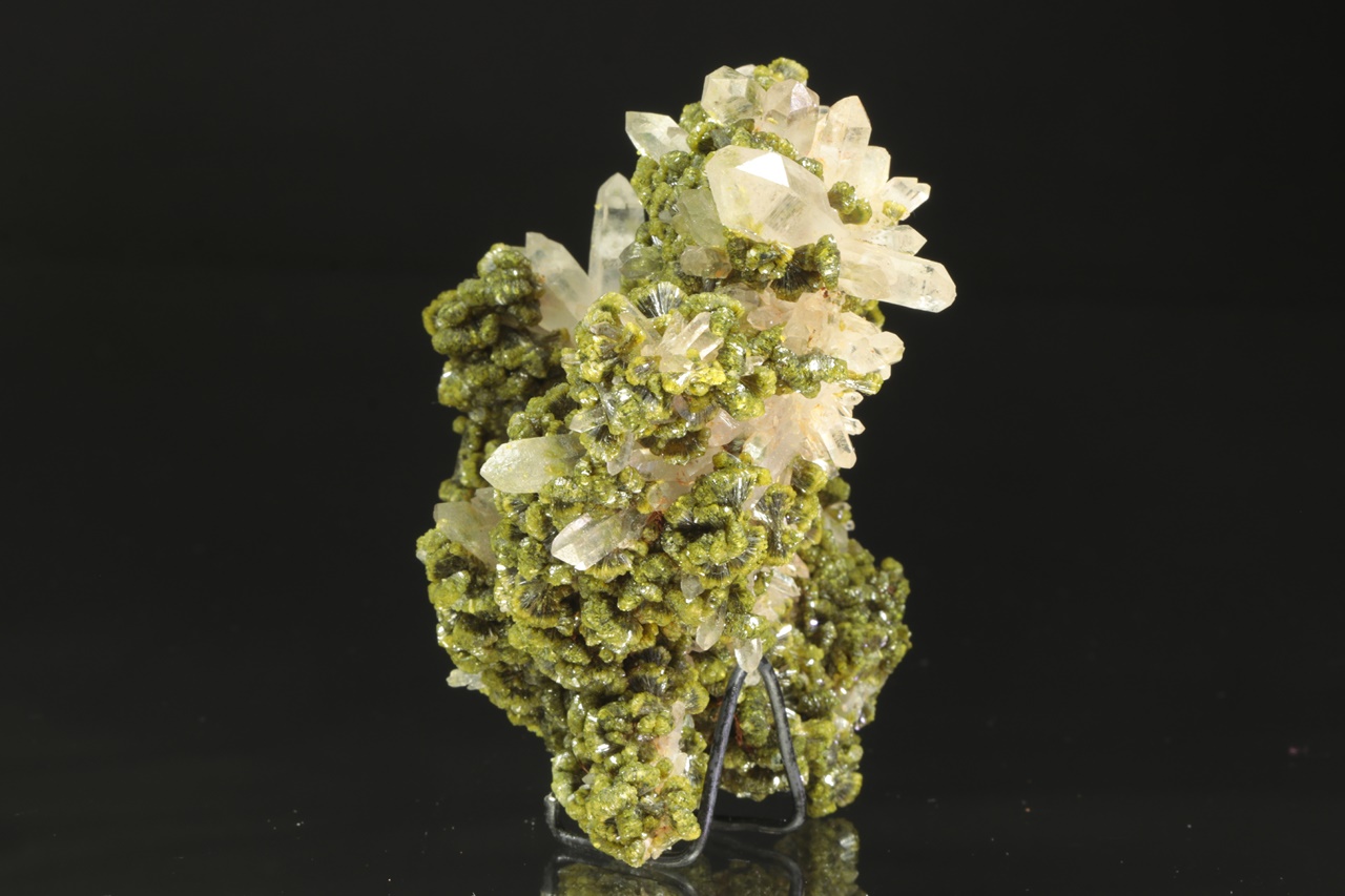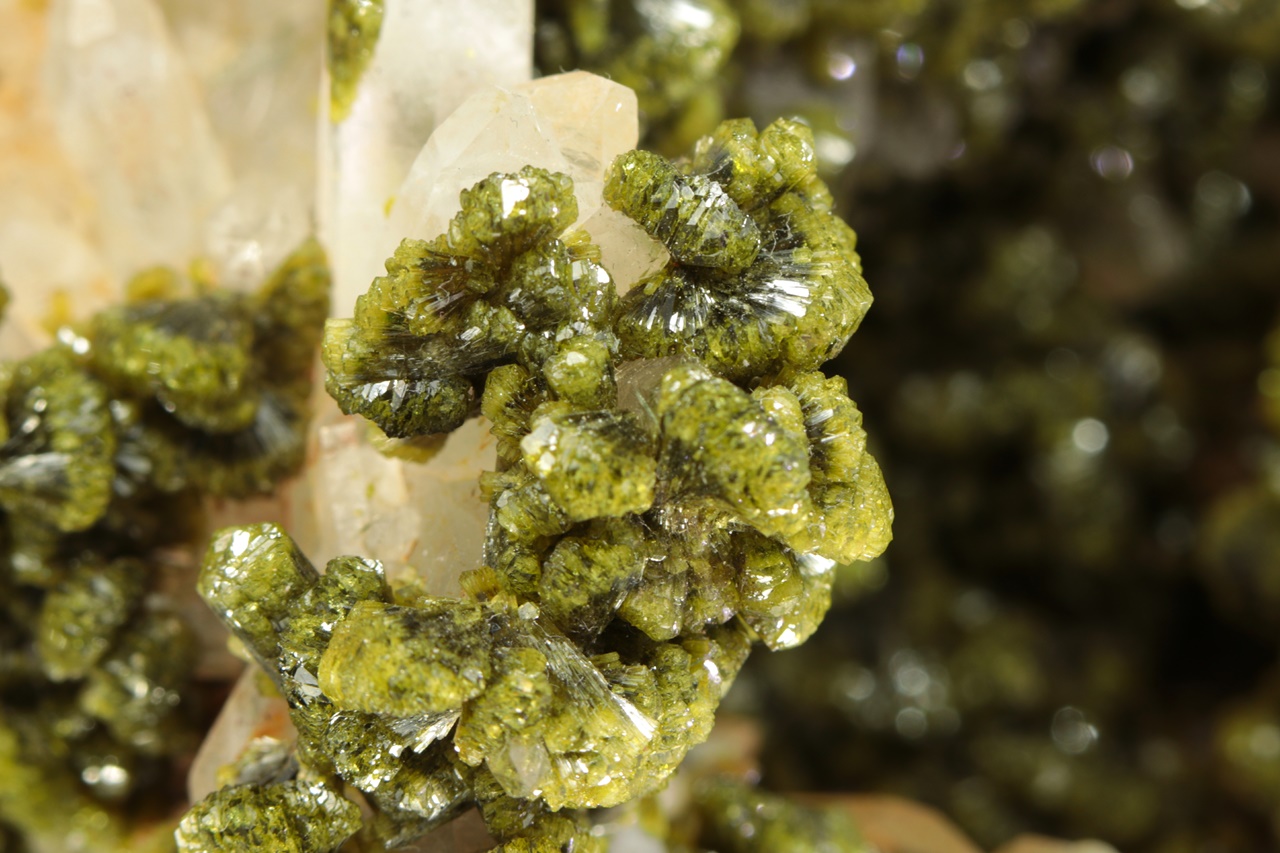 Cluster of clear quartz crystals up to 4 cm in length covered with fans of intensely green epidote, the tips of which transition into light green. The size of the epidote crystals in the fans is up to 4 mm.
