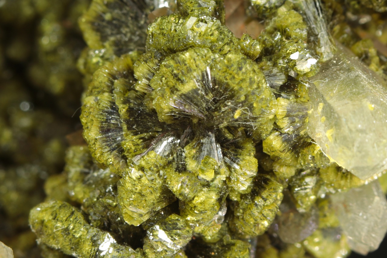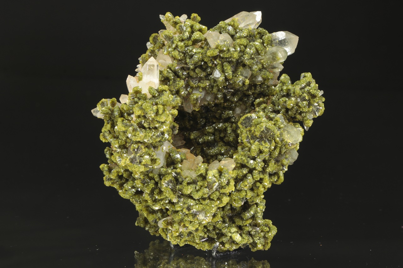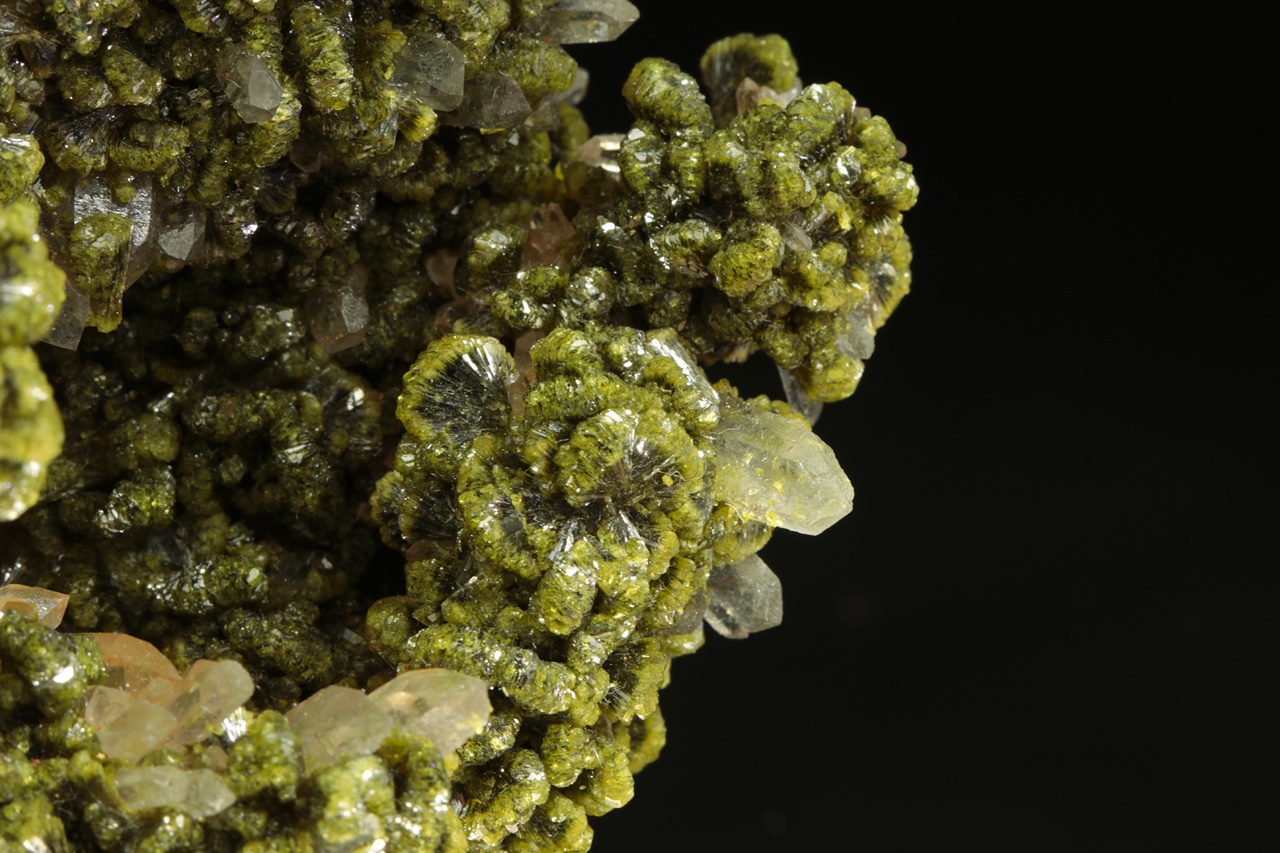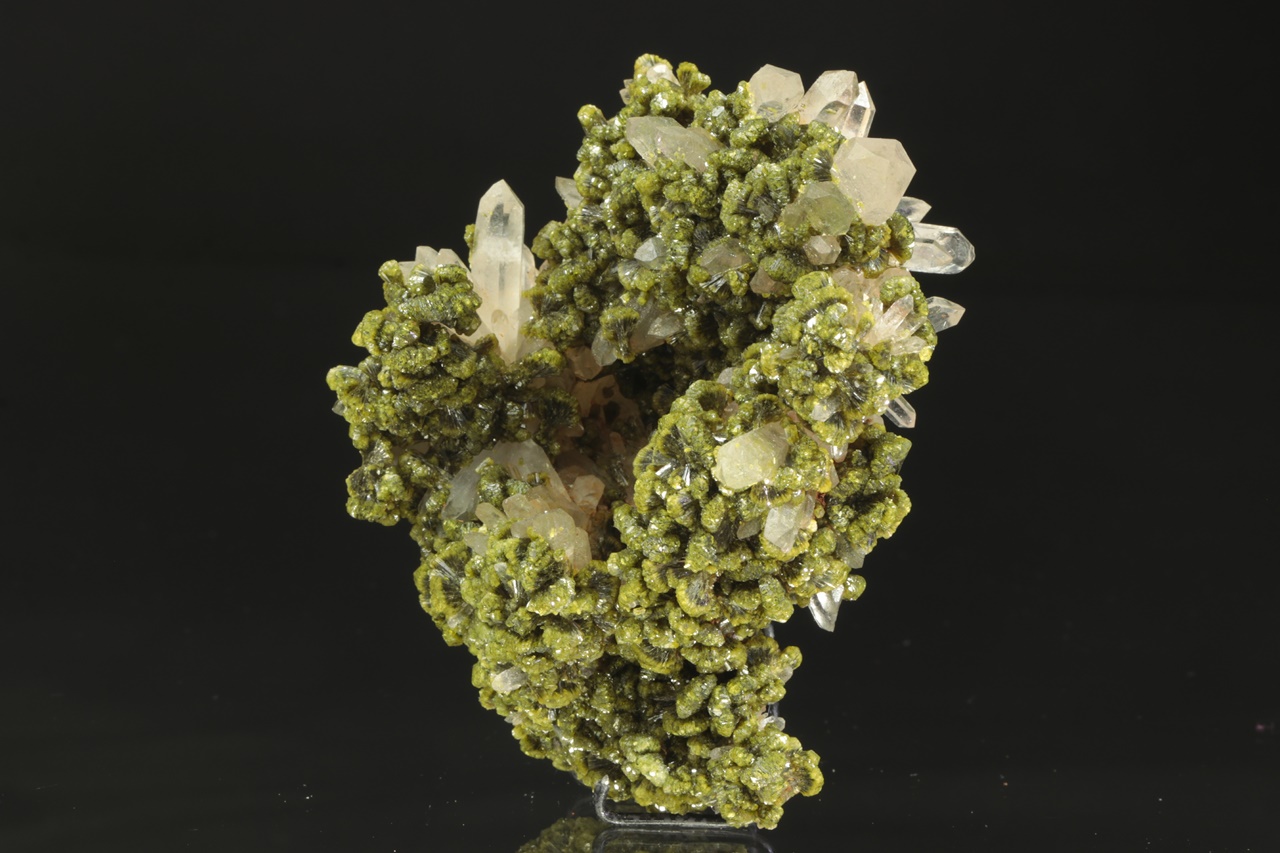 Cluster of clear quartz crystals up to 4 cm in length covered with fans of intensely green epidote, the tips of which transition into light green. The size of the epidote crystals in the fans is up to 4 mm.
