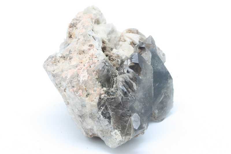 A specimen of foliated crystals of eudidymite, a rare beryllium silicate, from Malawi. White eudidymite crystals embedded in quartz and brownish