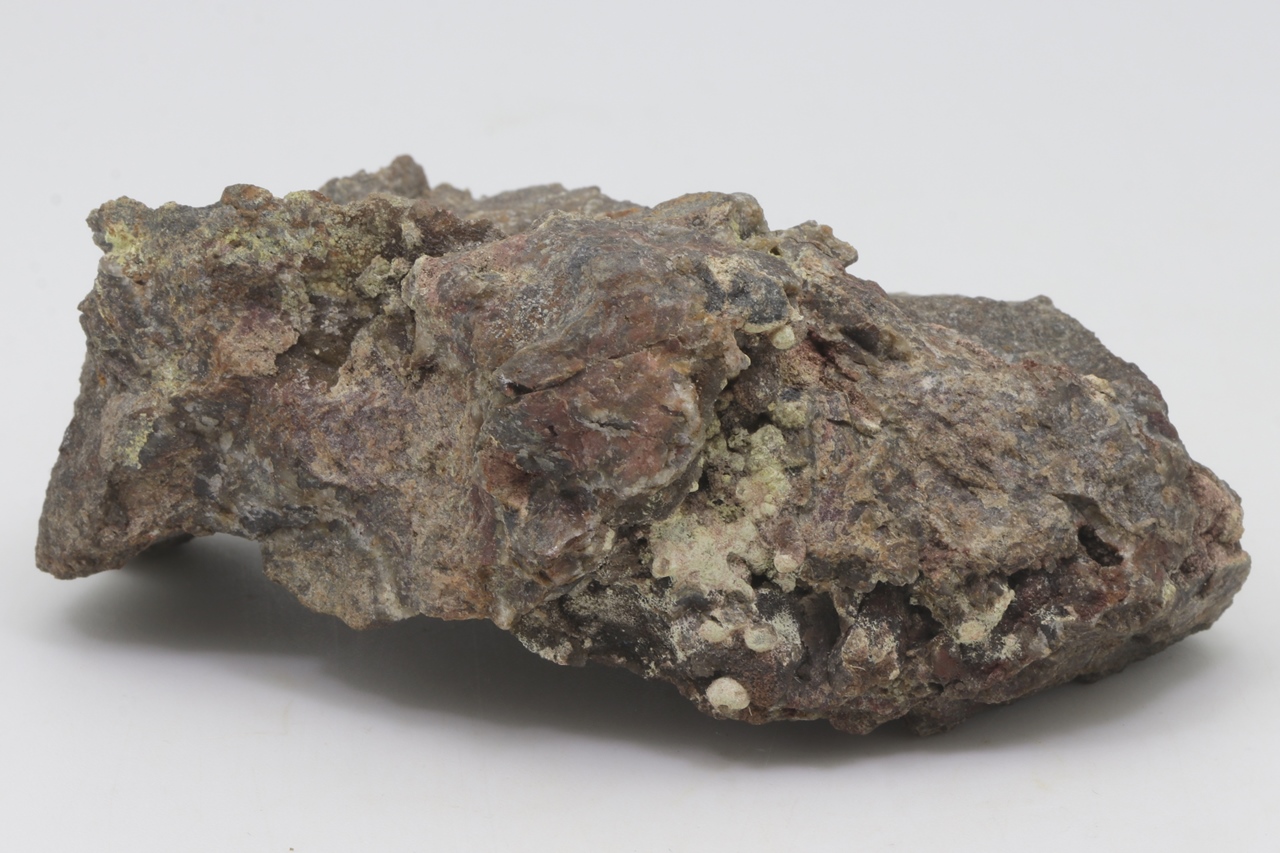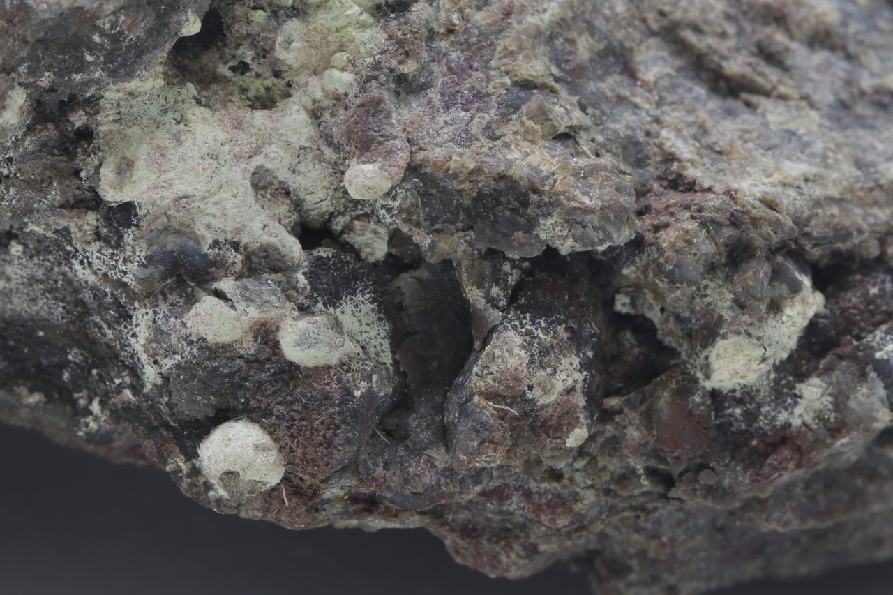 Balls of black eulytine 2 – 3 mm in size (the largest is an incomplete ball on the edge of a cavity, which is 5 mm in size) covered with a “dust” of the rare light bayerite.