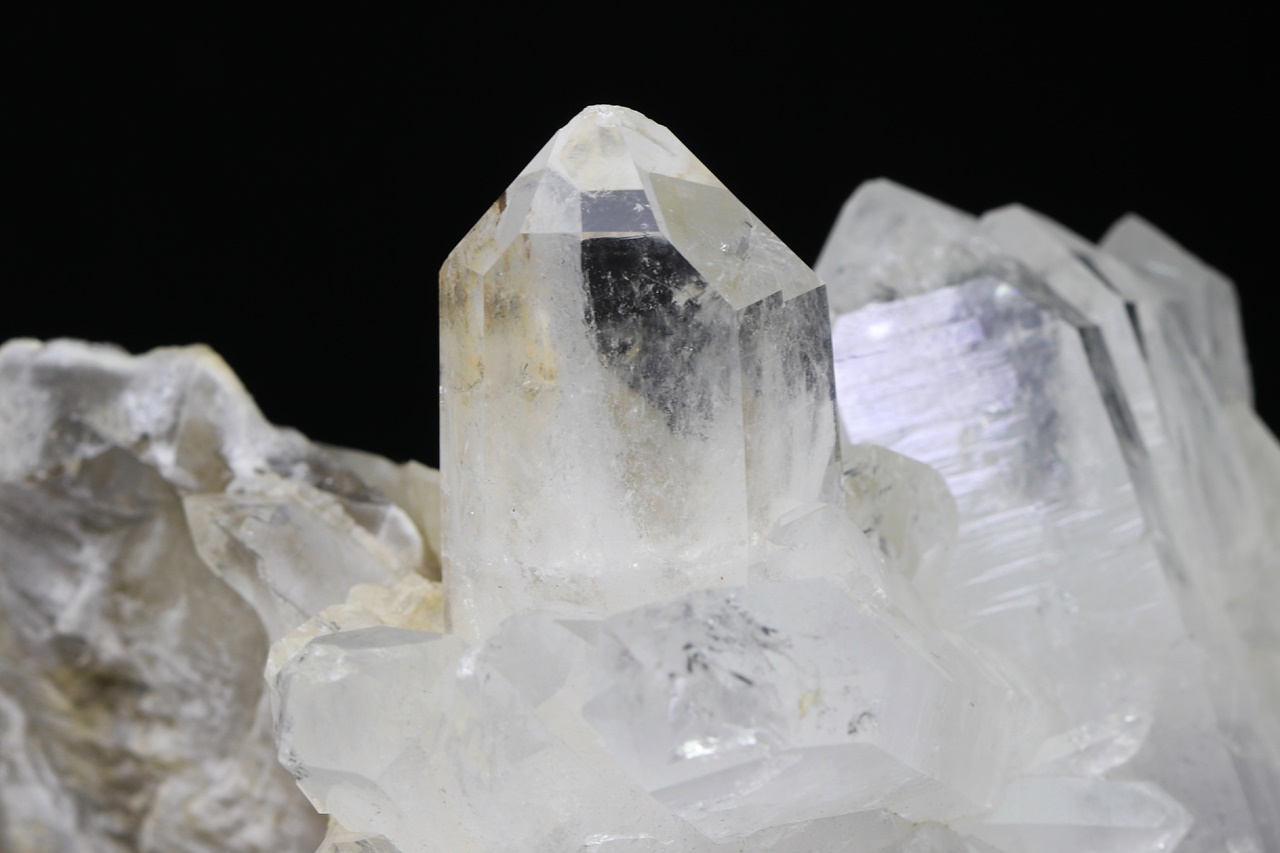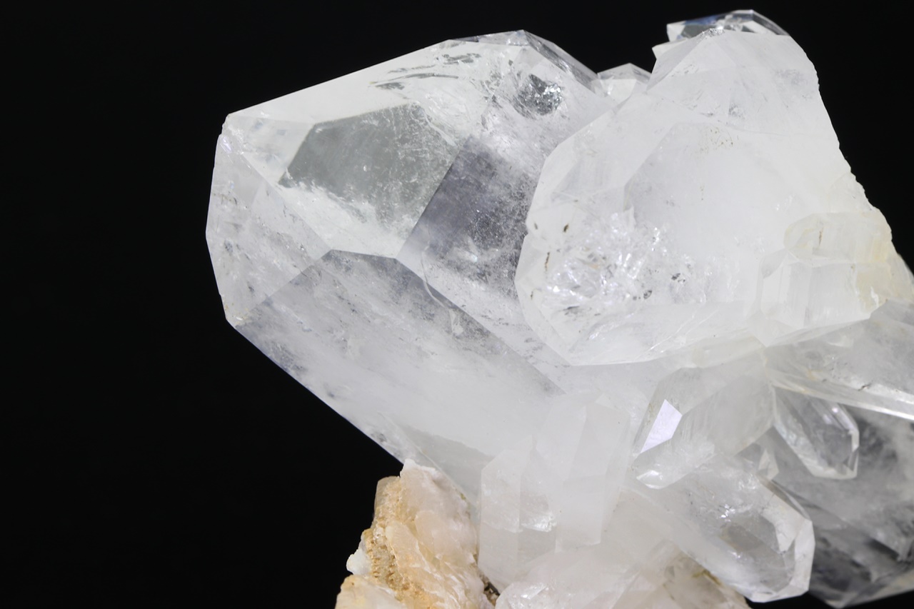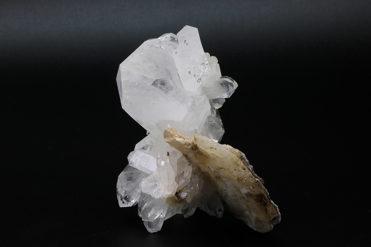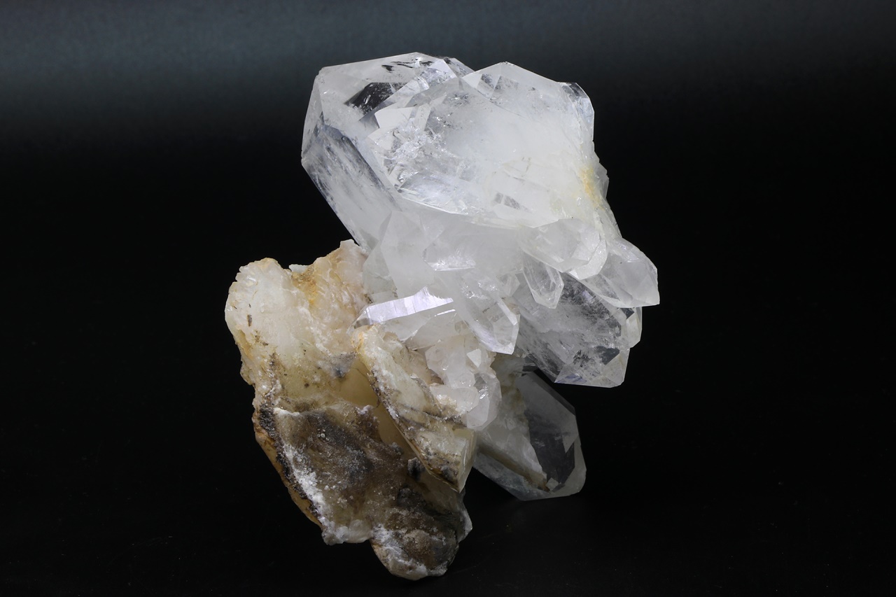 Cluster of clear quartz crystals with an unusual tabular habit grown on calcite. The largest crystal is 9.5 cm in size.