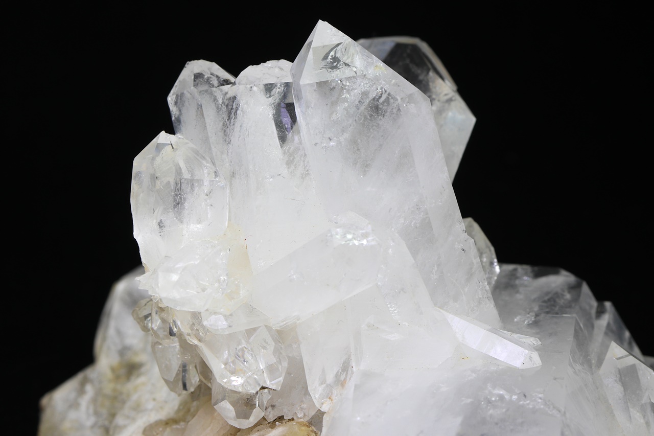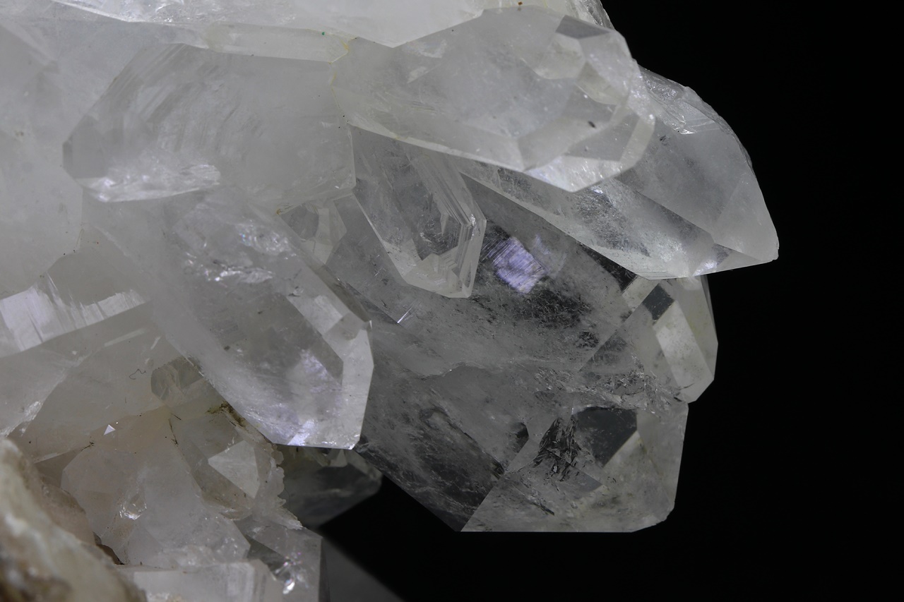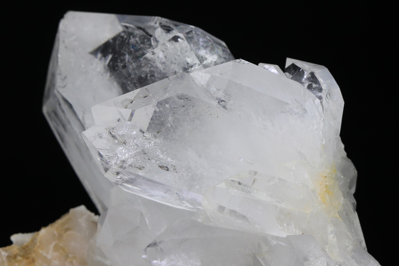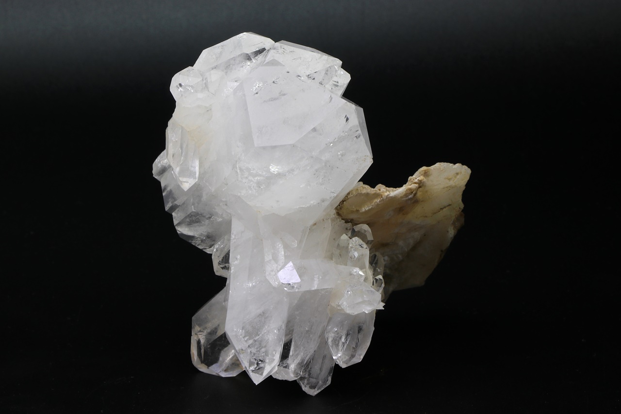 Cluster of clear quartz crystals with an unusual tabular habit grown on calcite. The largest crystal is 9.5 cm in size.