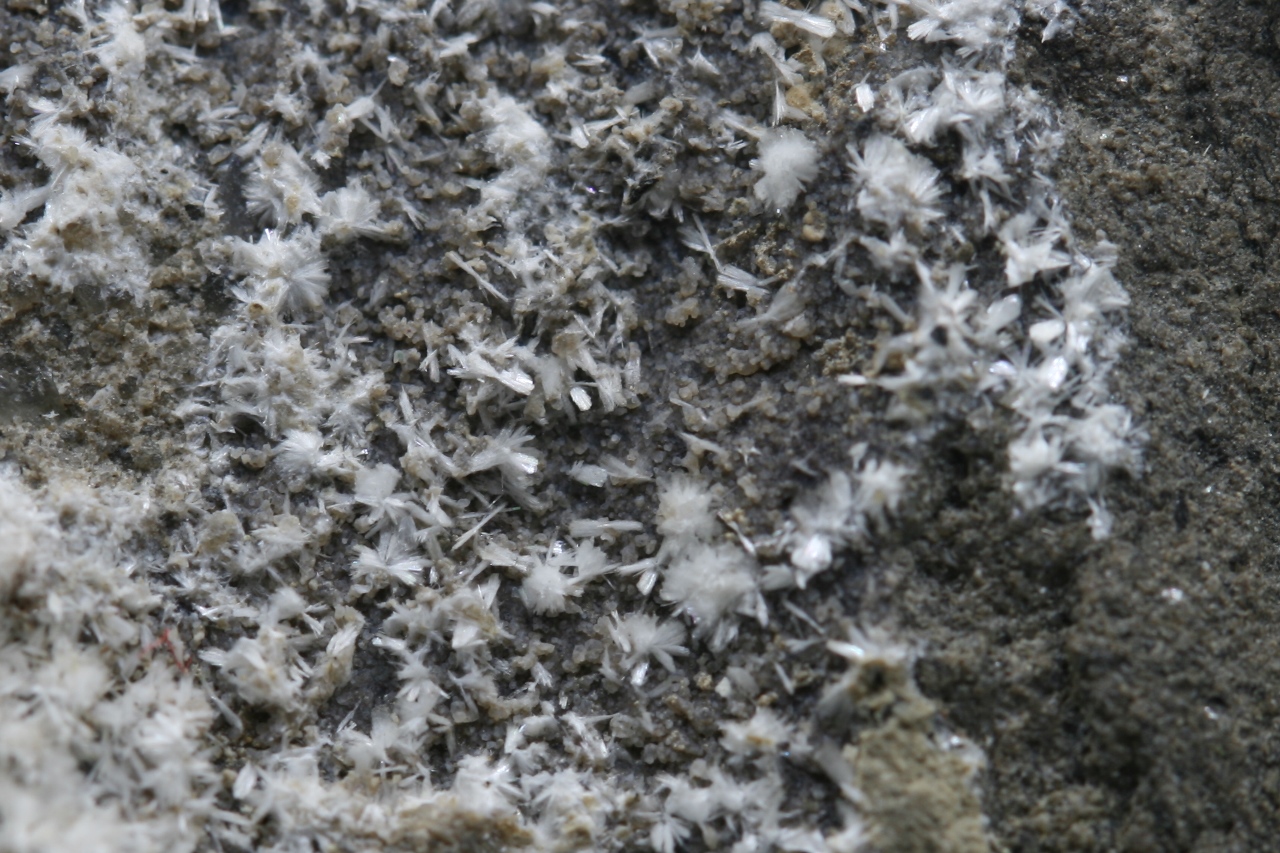 Tiny columnar and fan-shaped clusters of ferrierite with the ammonium member. Newly described mineral.