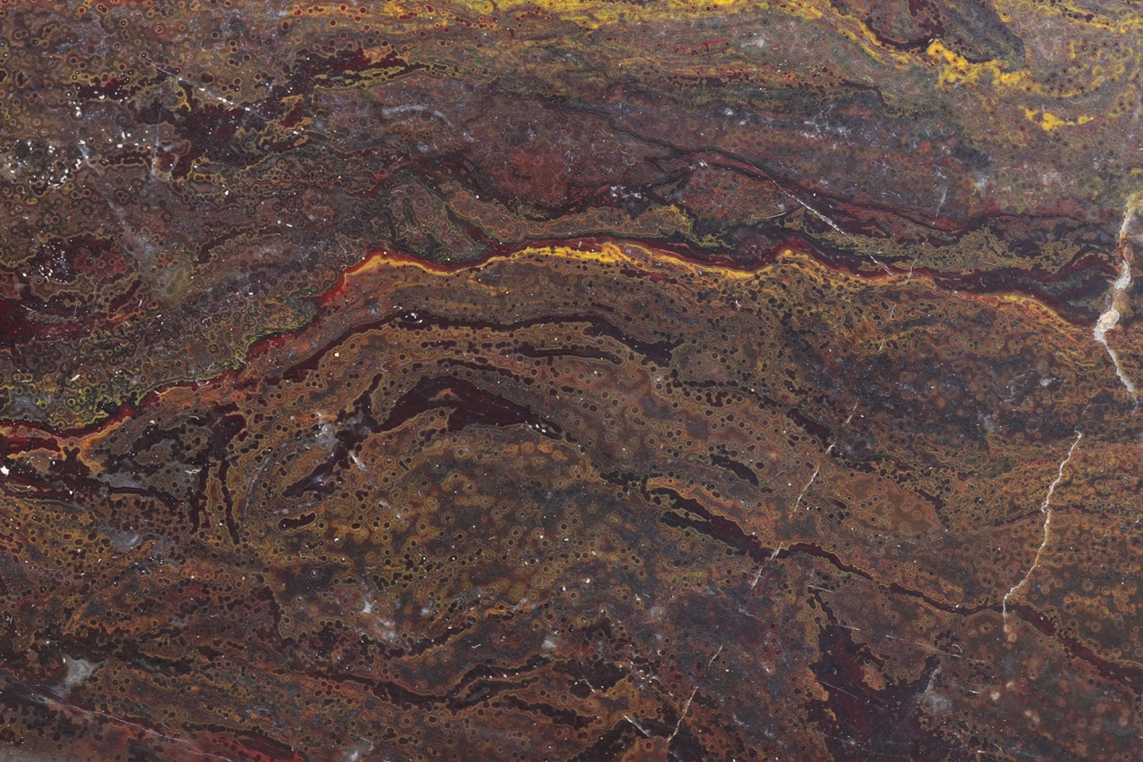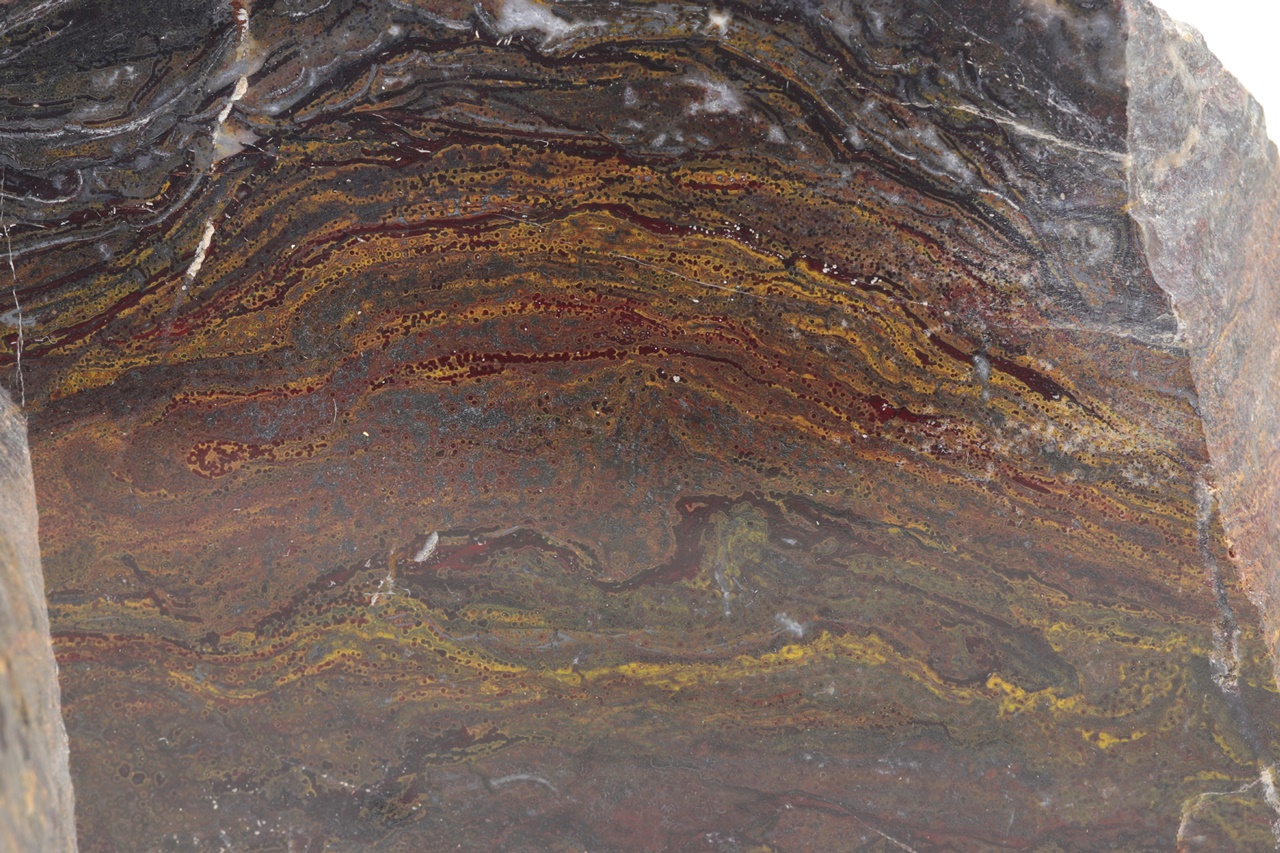 Dark ferrous quartz with bands of hematite and small pisoids.
