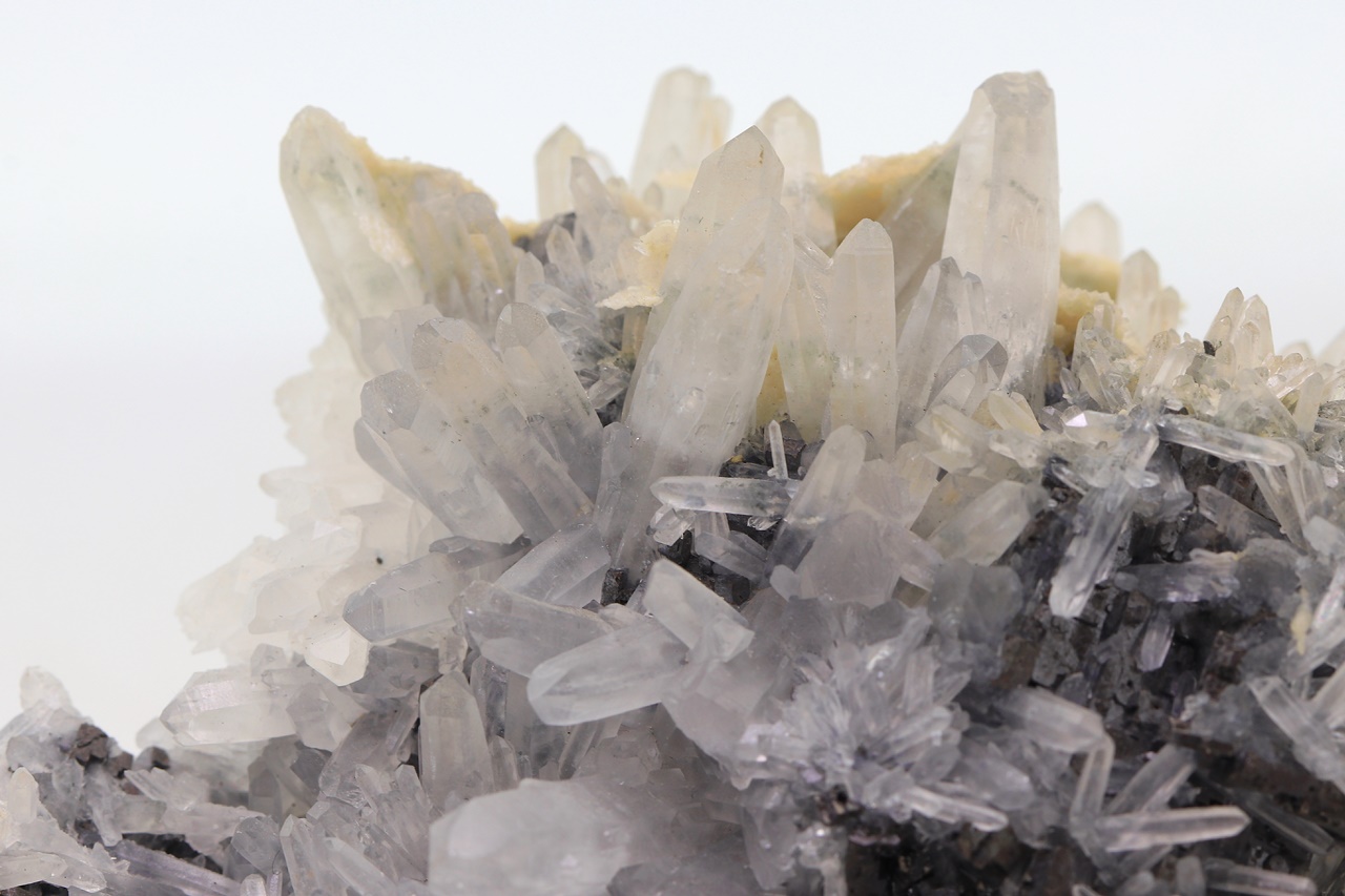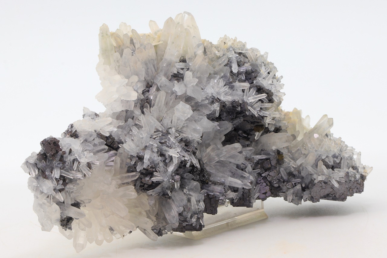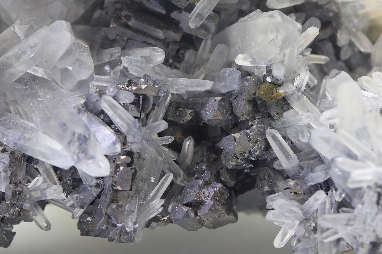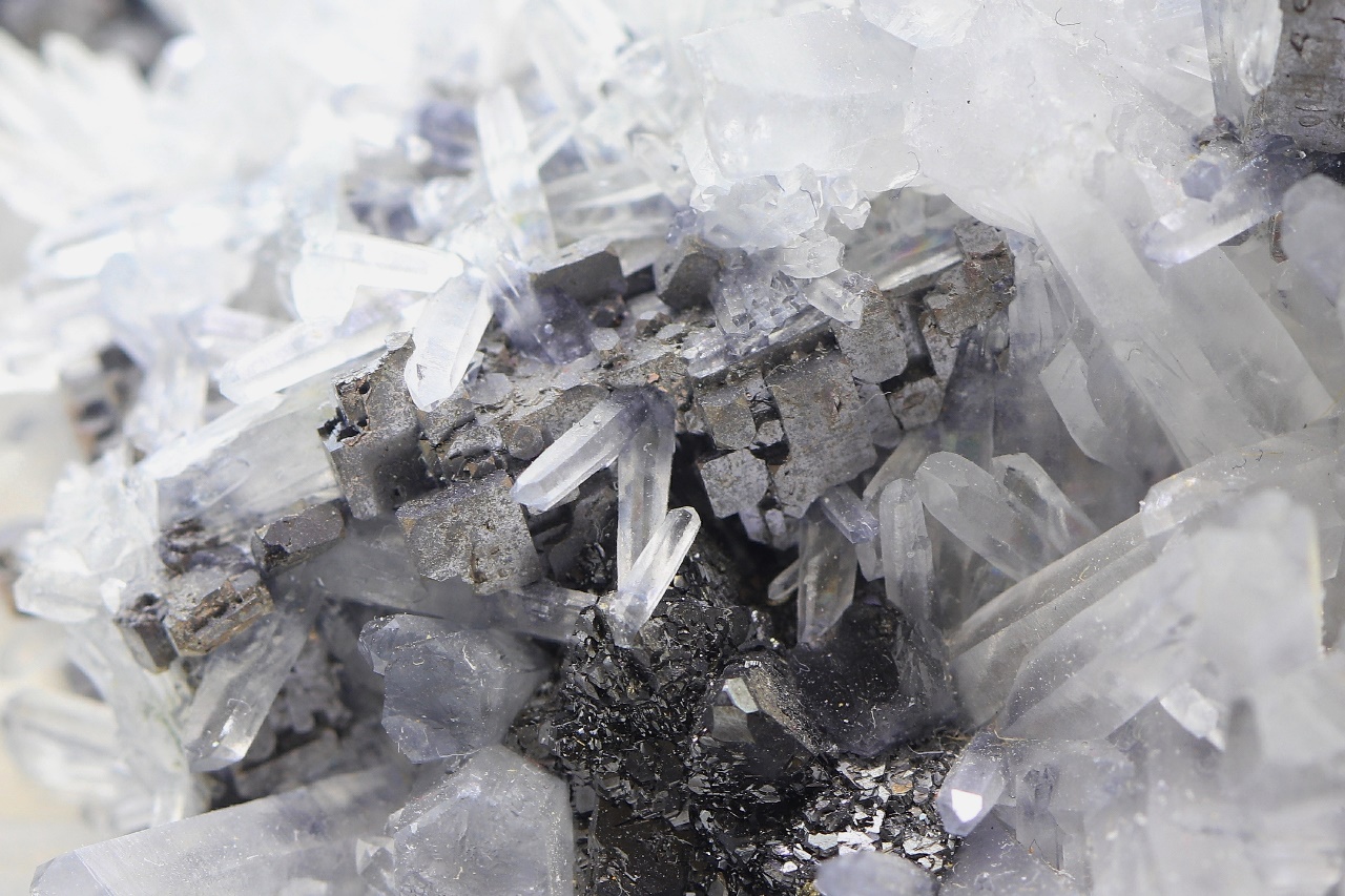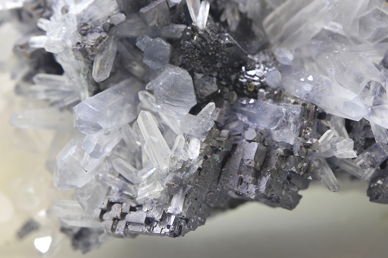 Cubic, skeleton-like grown crystals of galena (the largest is 2.5 cm big) overgrown with smaller crystals of quartz.