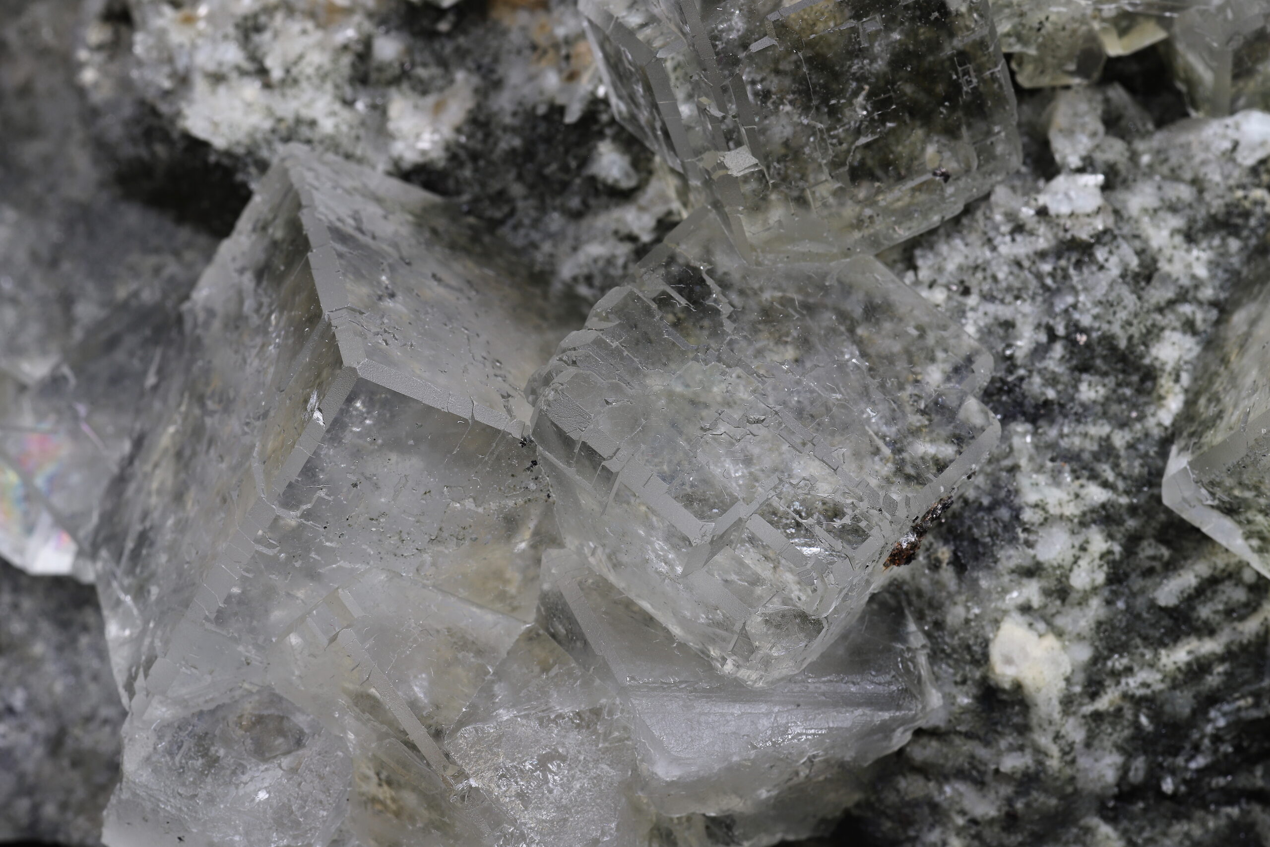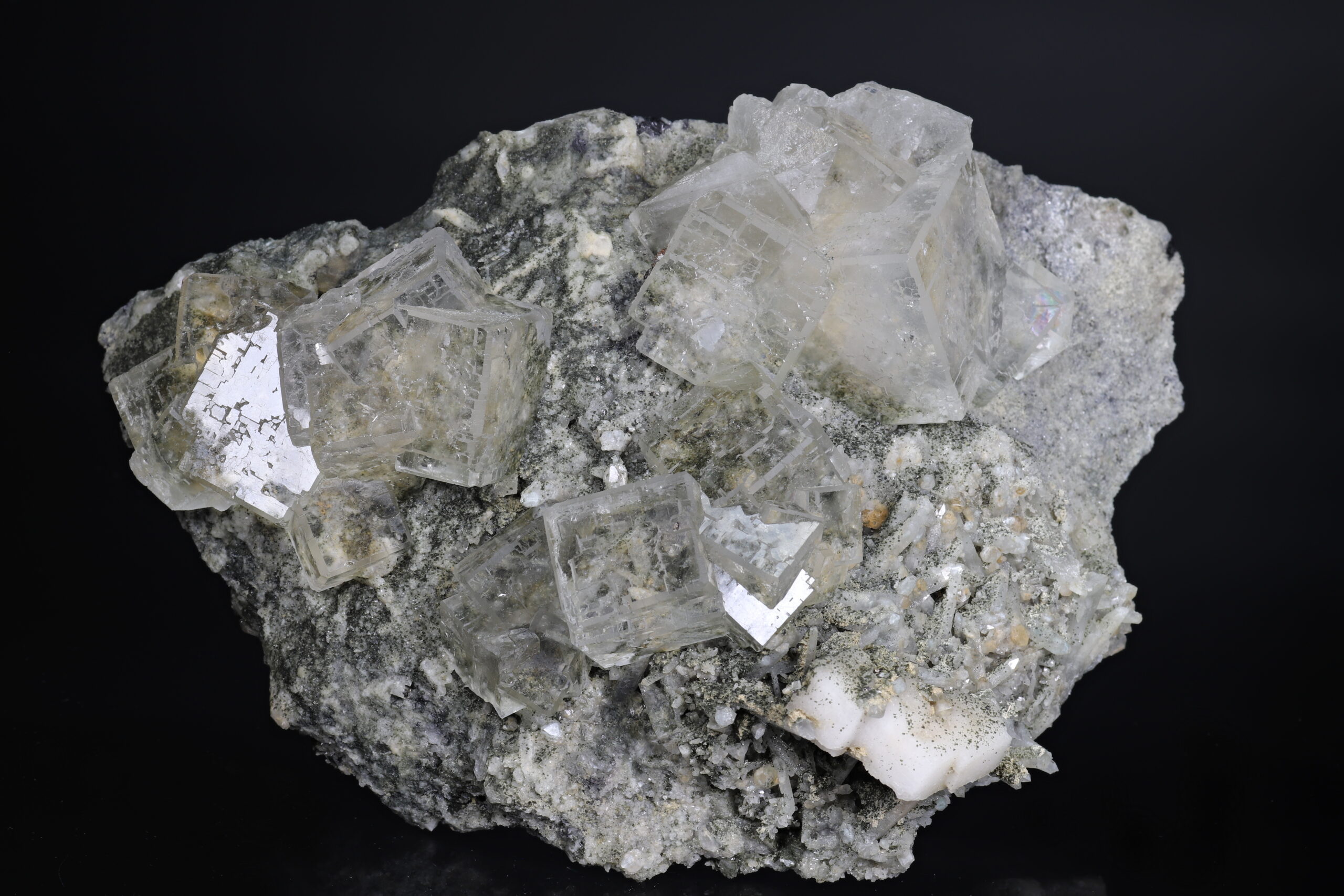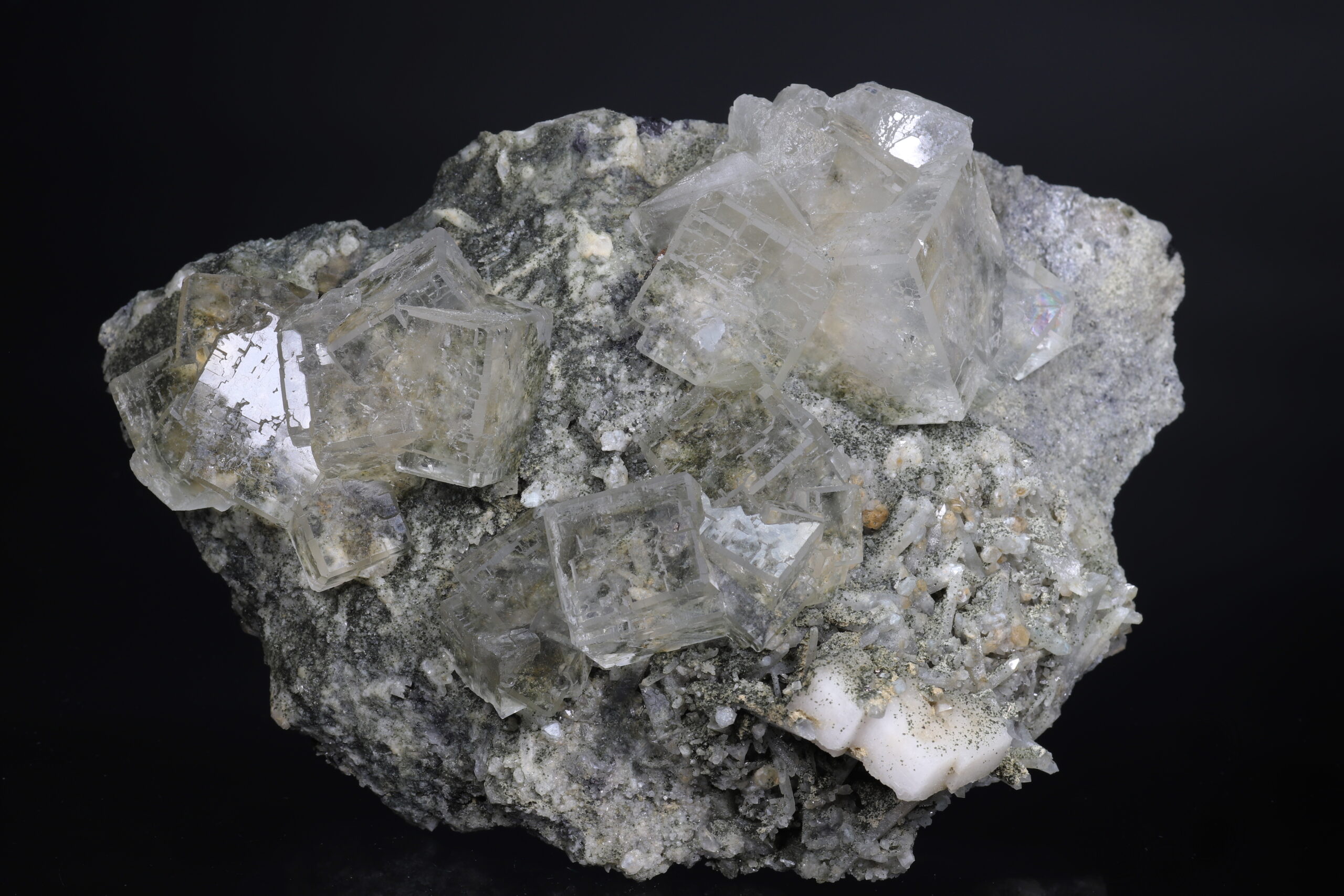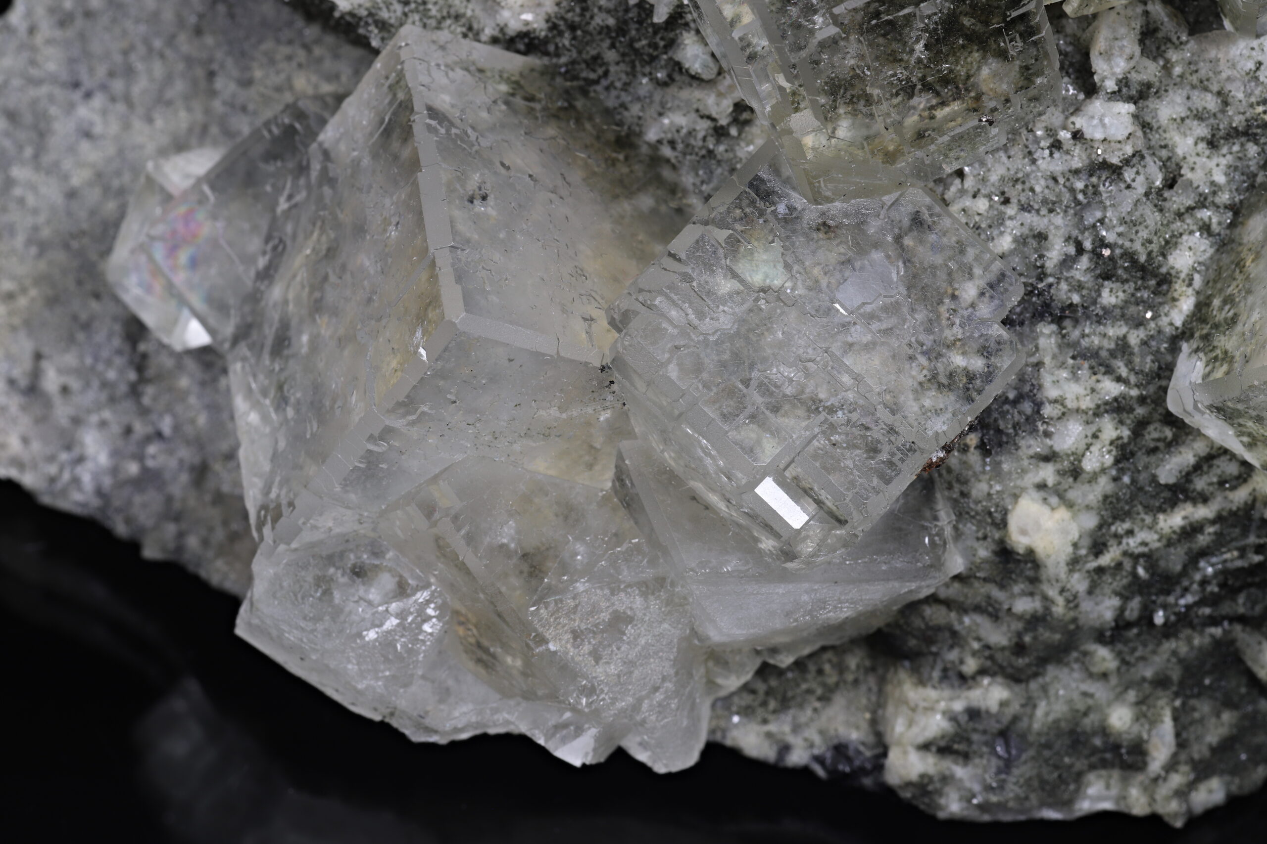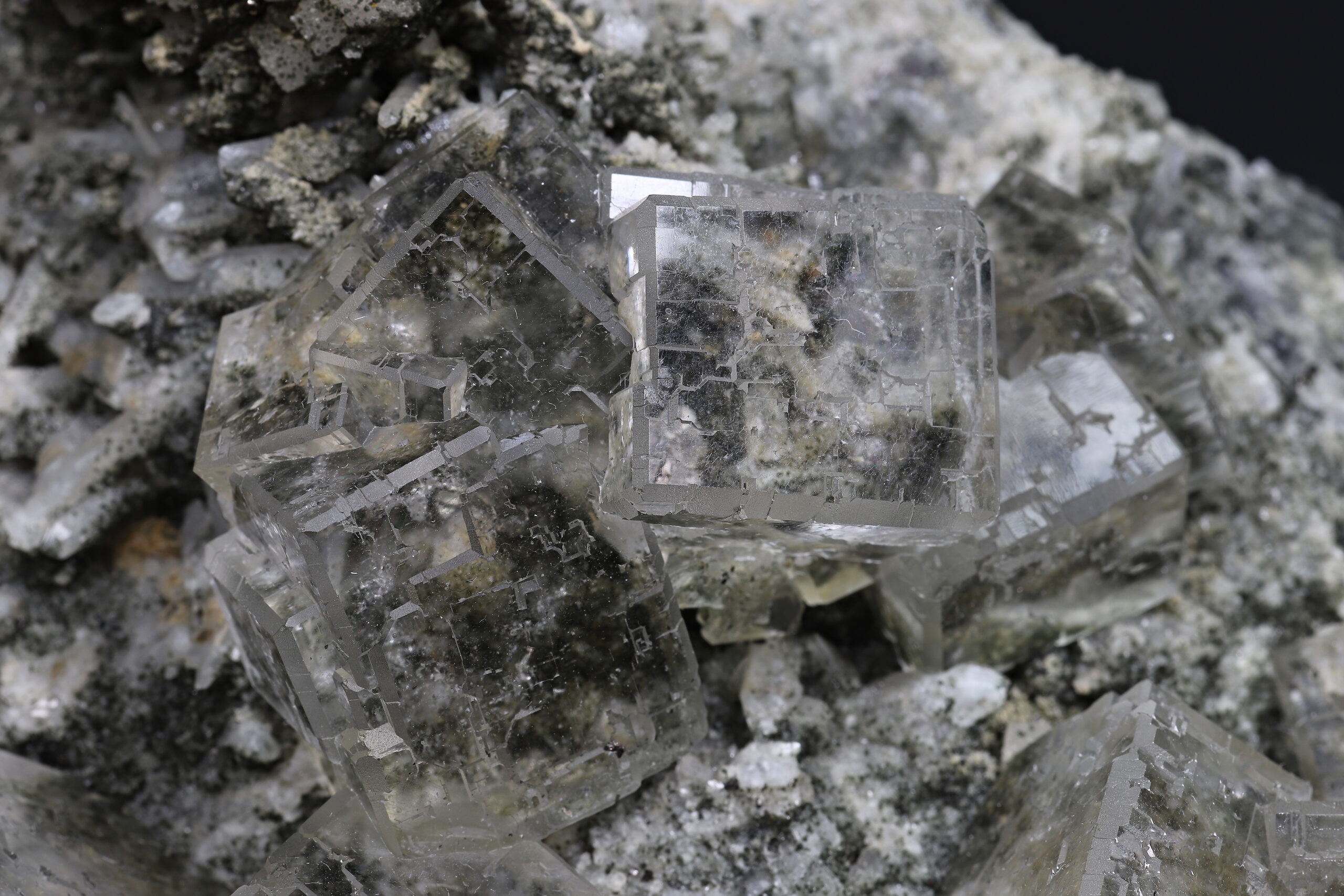Sbírkový vzorek dokonale průhledného, tzv. “optického” fluoritu z Dalněgorska. Nepoškozené, krychlovité krystaly dosahují velikosti až 3 x 3 x 3 cm. Vzorek je ze dvou stran řezaný a broušený (řízlé plochy nejsou rovné).