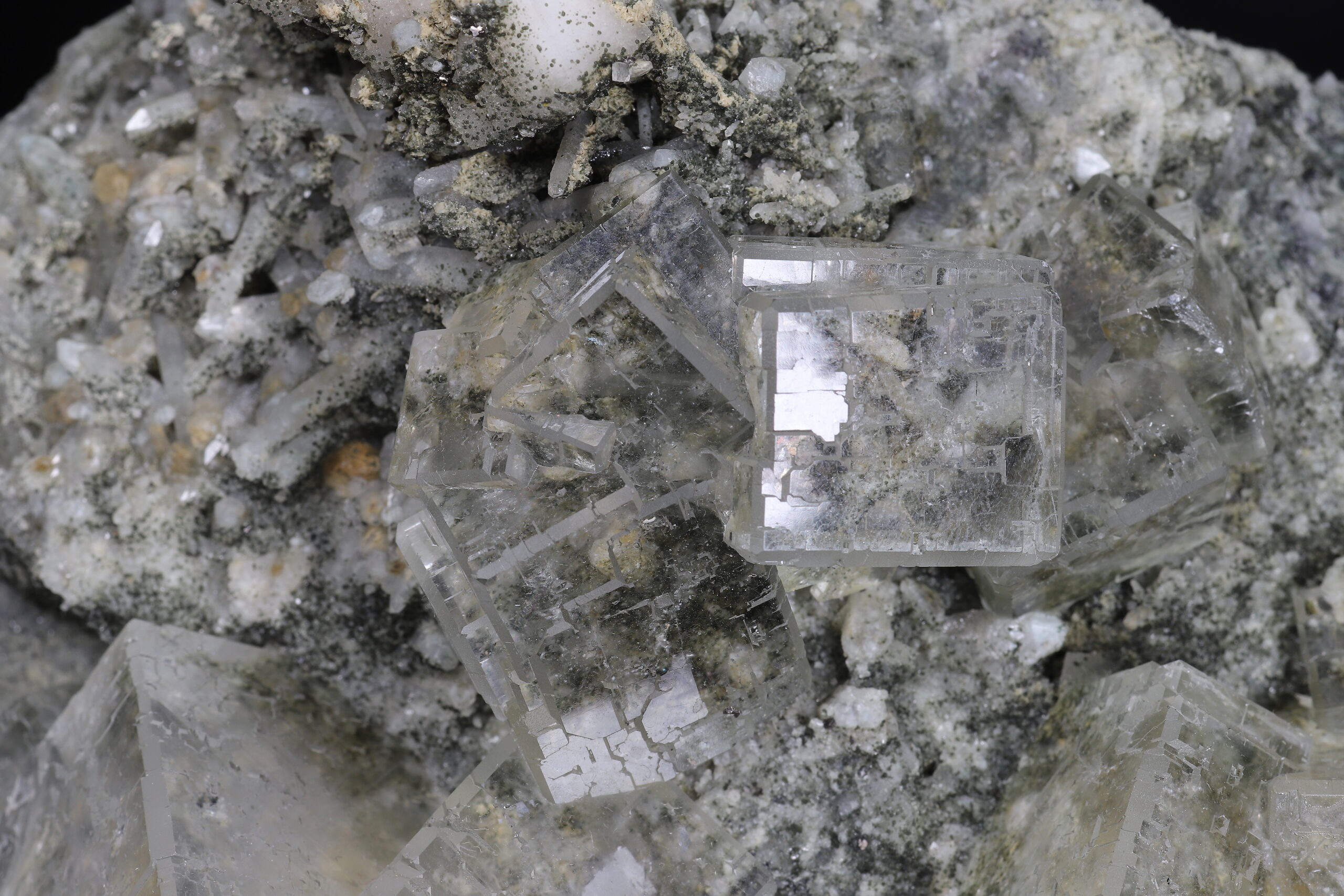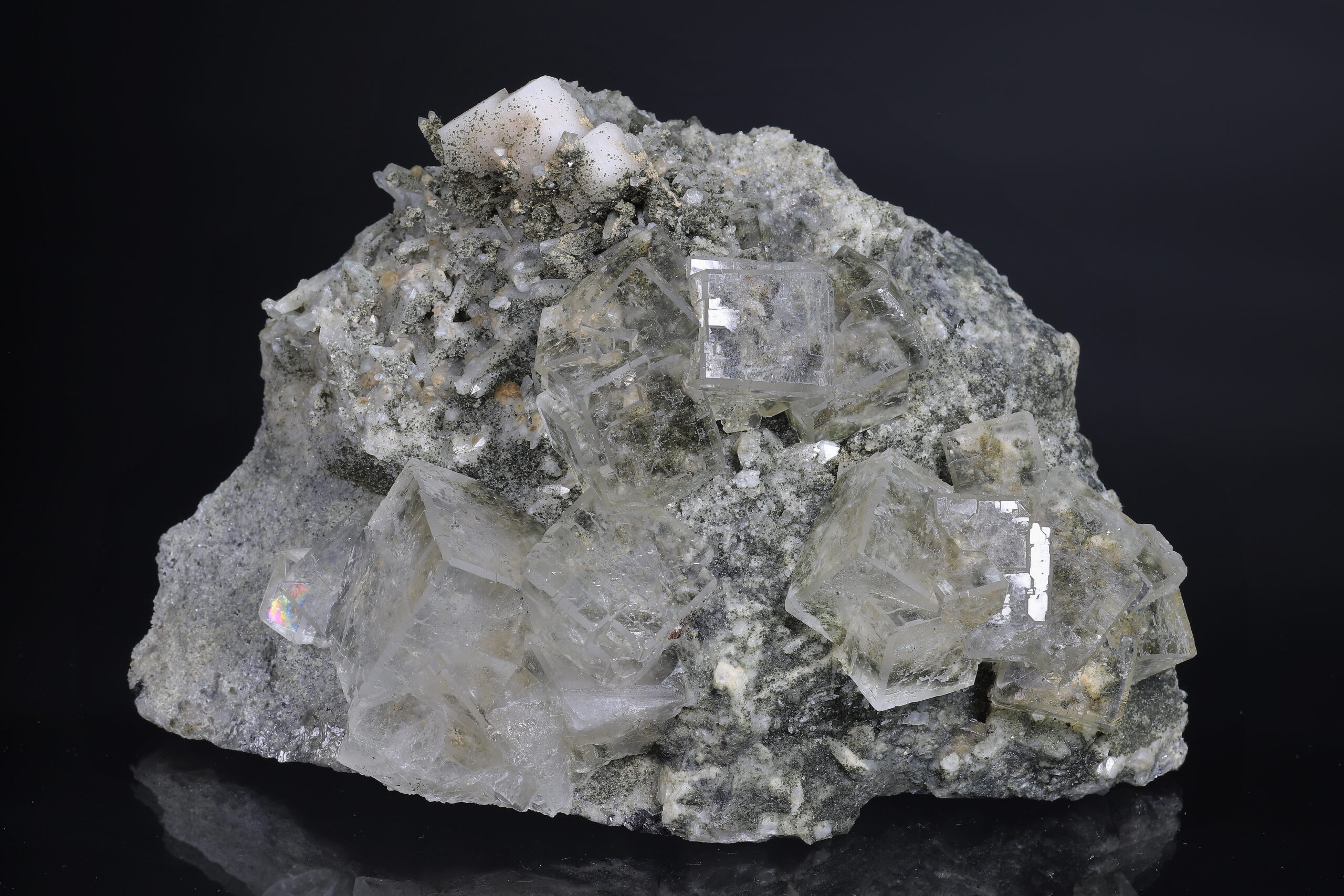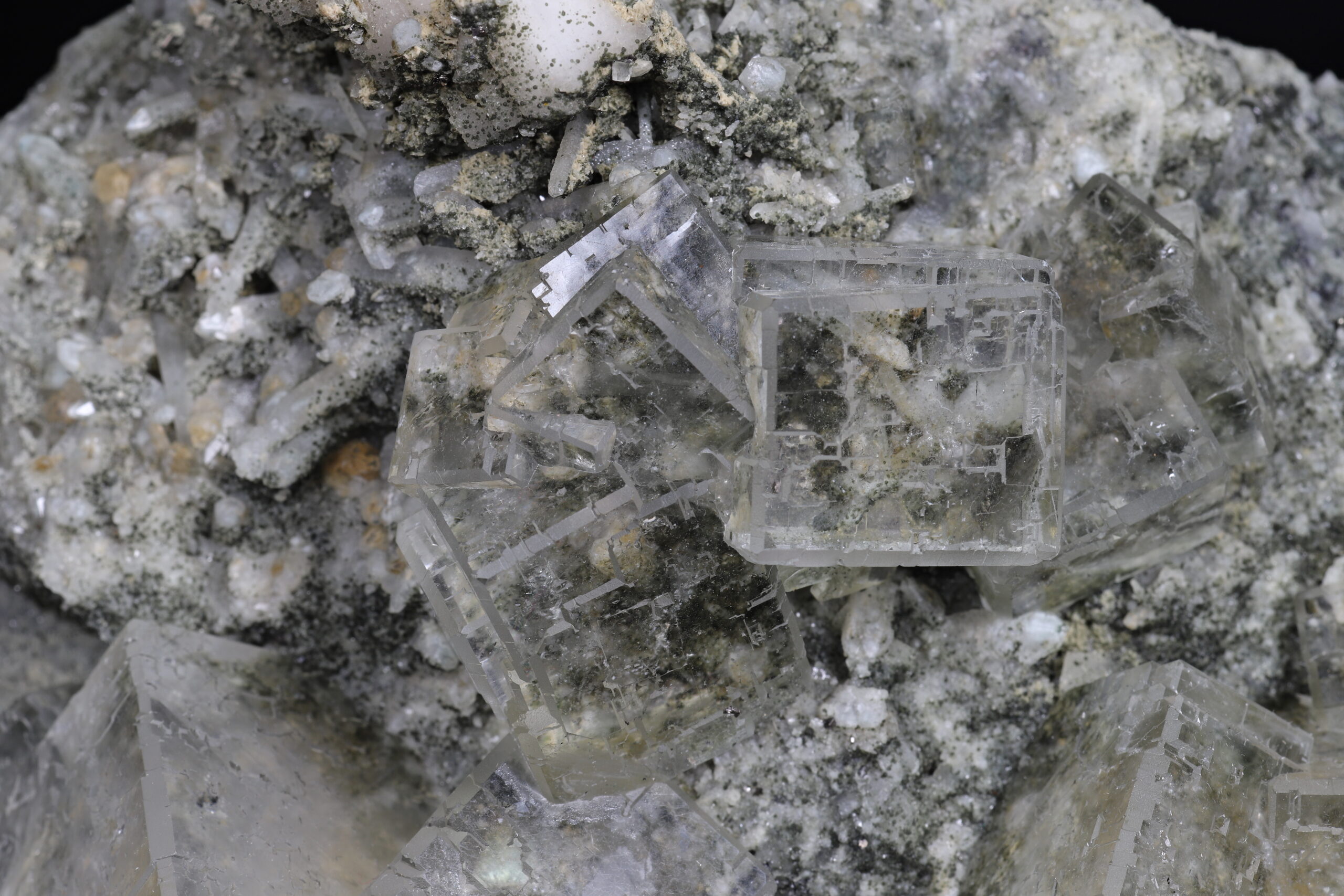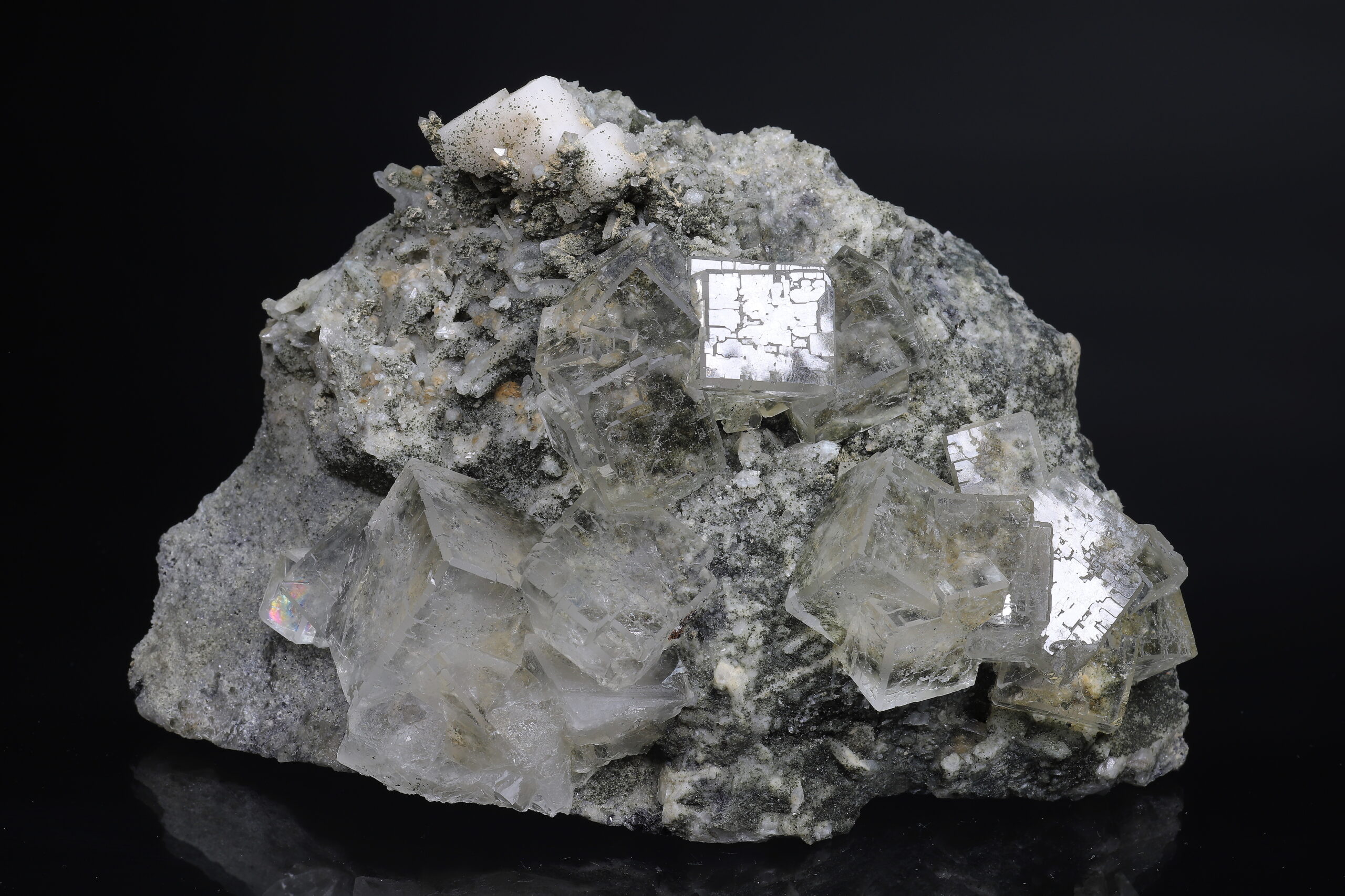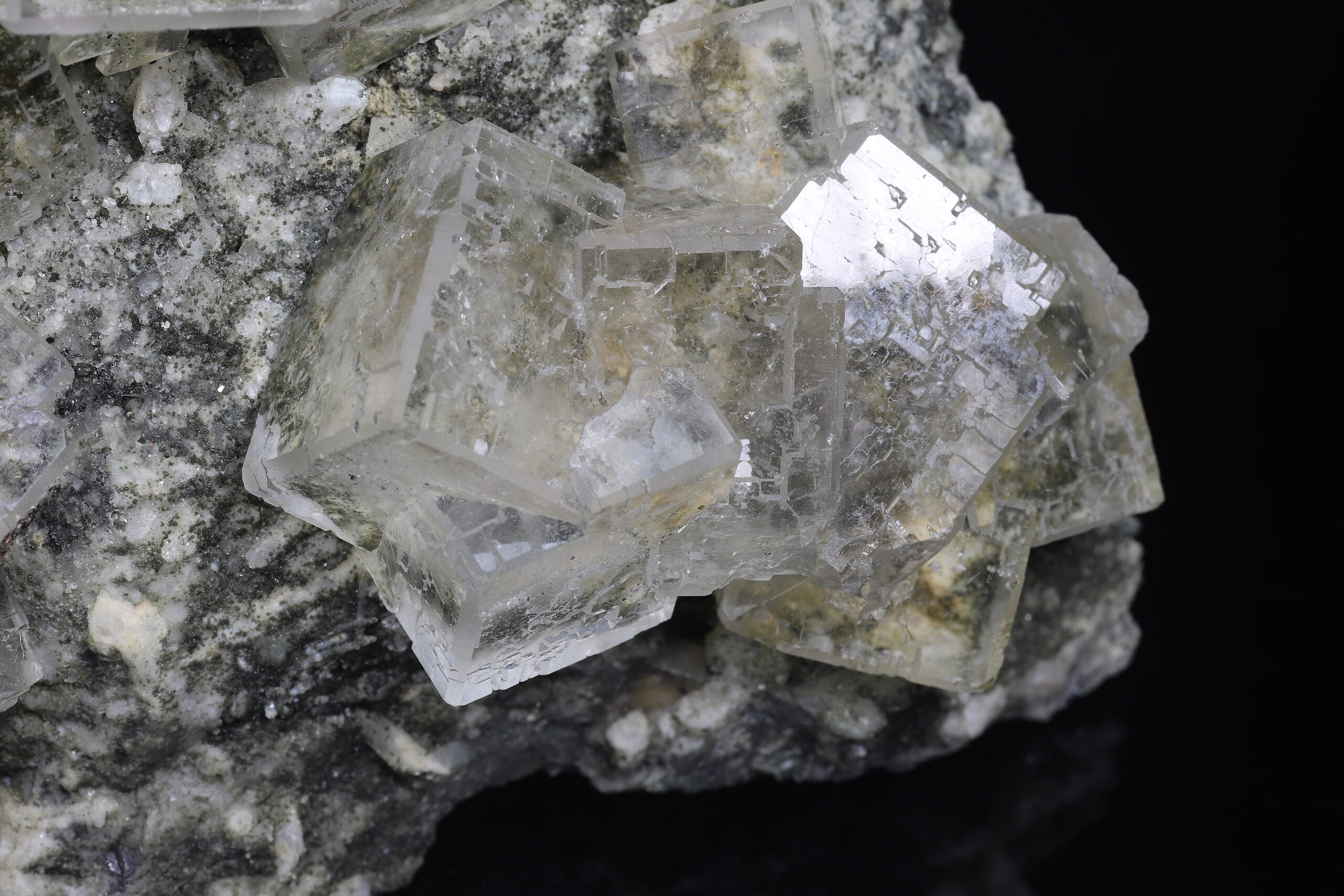 Sbírkový vzorek dokonale průhledného, tzv. “optického” fluoritu z Dalněgorska. Nepoškozené, krychlovité krystaly dosahují velikosti až 3 x 3 x 3 cm. Vzorek je ze dvou stran řezaný a broušený (řízlé plochy nejsou rovné).