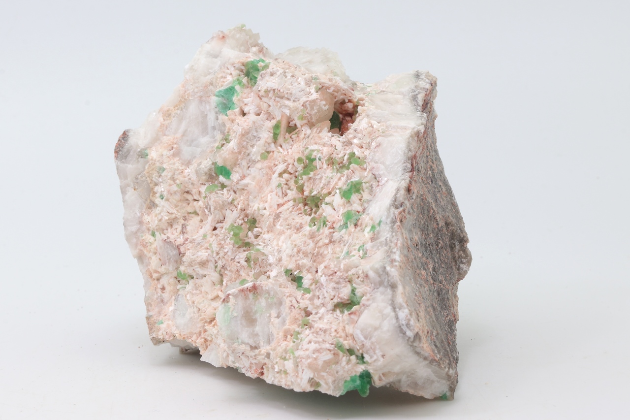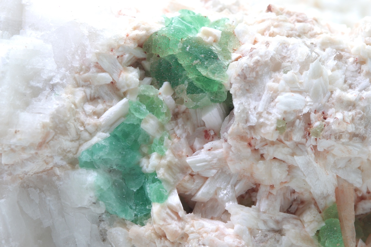 Fluorite on this specimen forms emerald green, glassy crystals that reach a size of 5 mm. Fluorite occurs on the specimen together with elongated whitish to slightly pinkish crystals that reach a size of 5 cm. Both minerals grow on a base formed by massive pinkish calcite. The combination of whitish laumontite and emerald green fluorite makes this sample aesthetically pleasing. The sample comes from the Czech locality of Litice.
