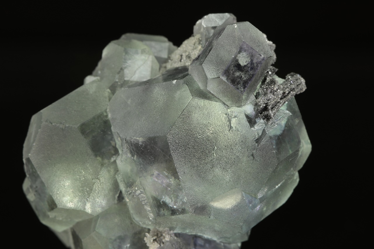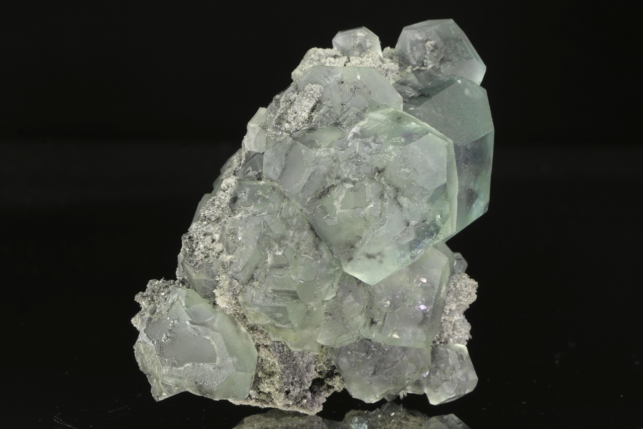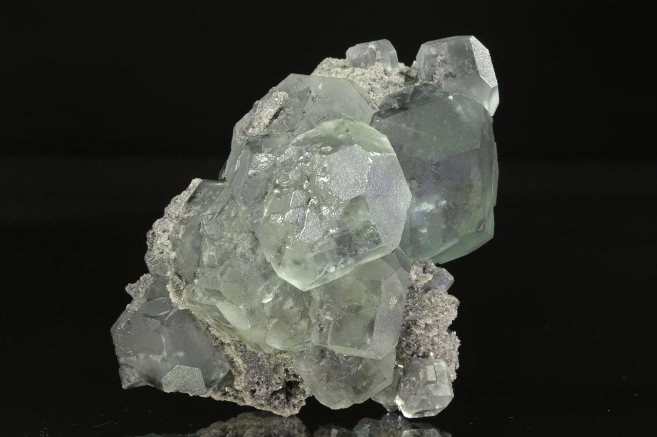 Cluster of transparent crystals of gray-green fluorite forming cube and dodecahedron junctions. The largest fluorite crystal is 3 cm in size.