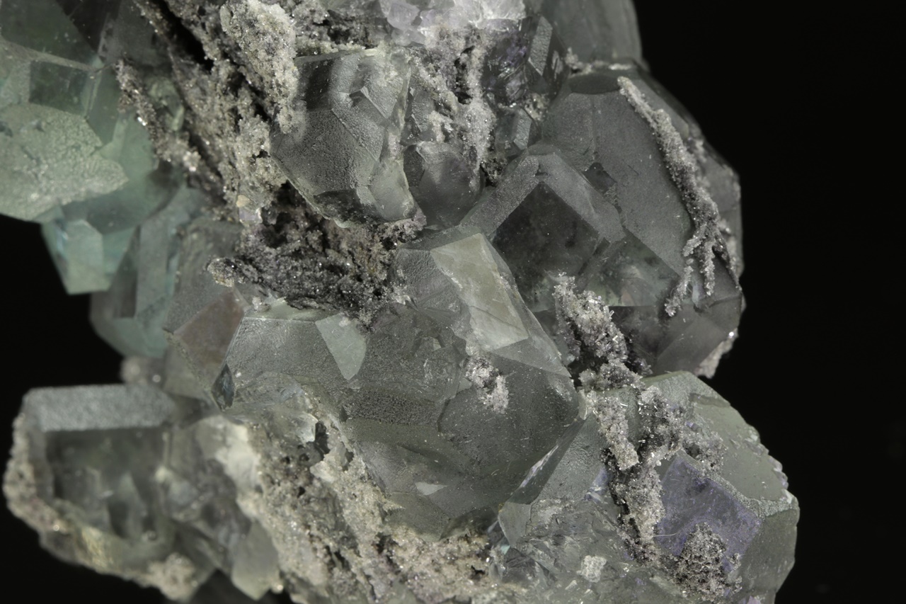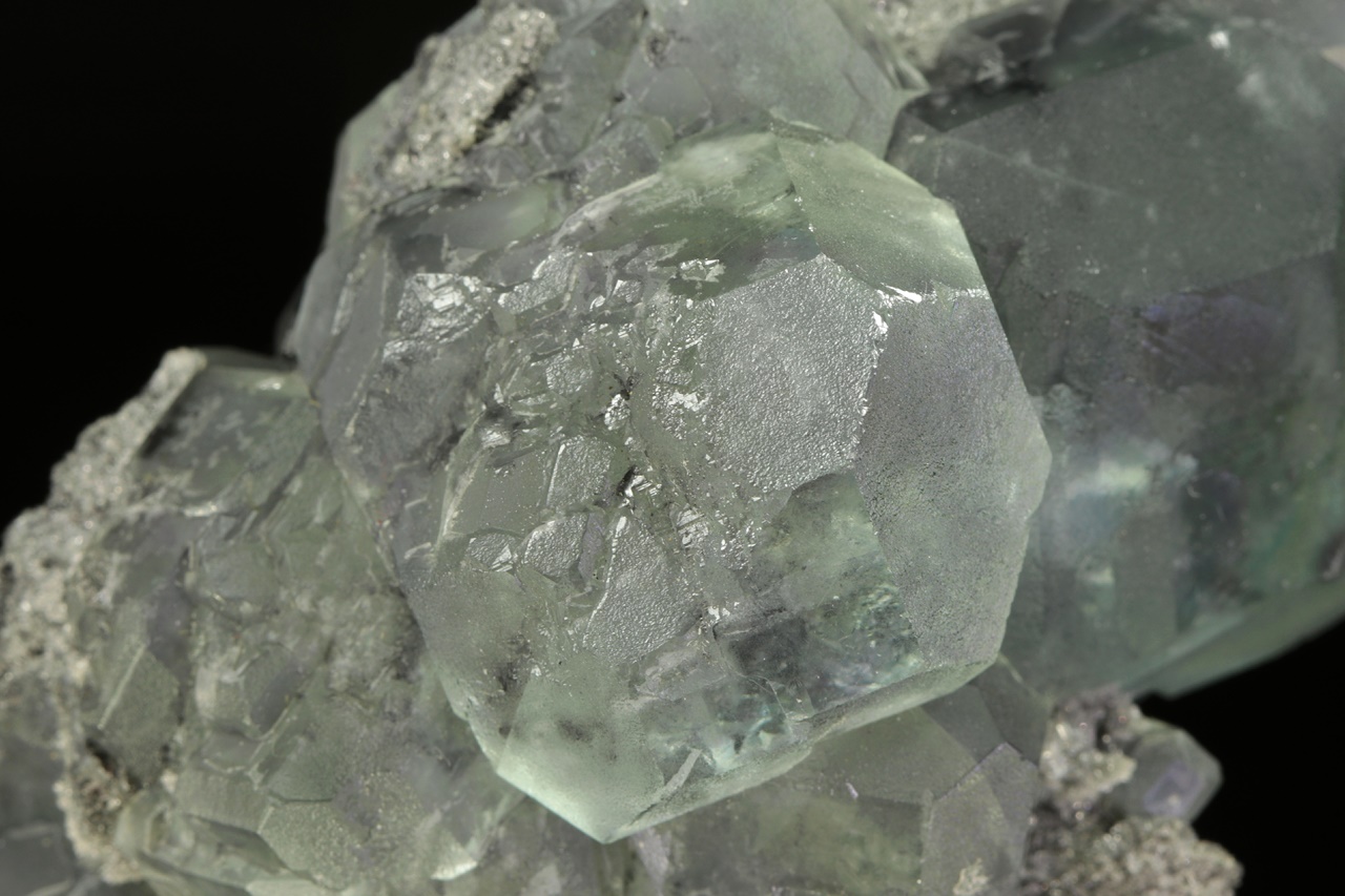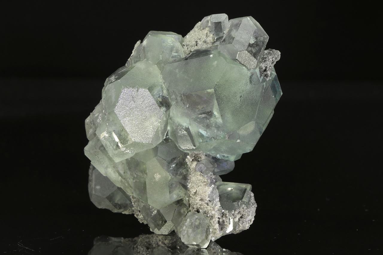 Cluster of transparent crystals of gray-green fluorite forming cube and dodecahedron junctions. The largest fluorite crystal is 3 cm in size.