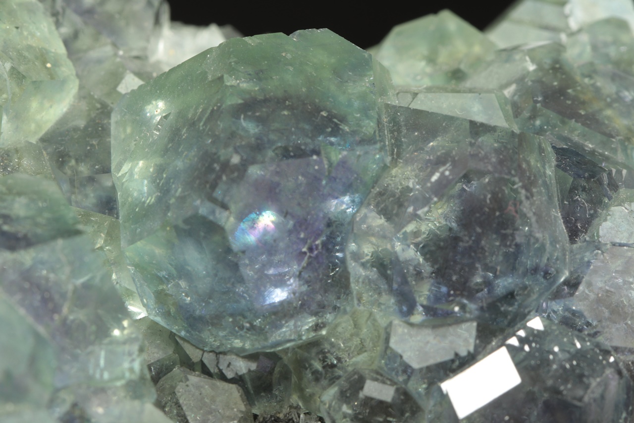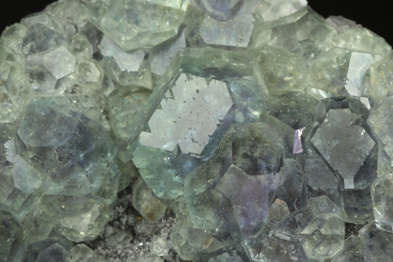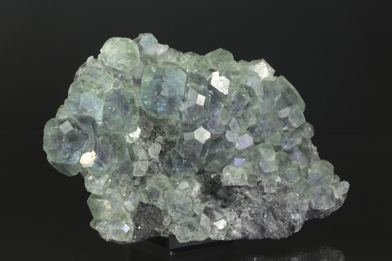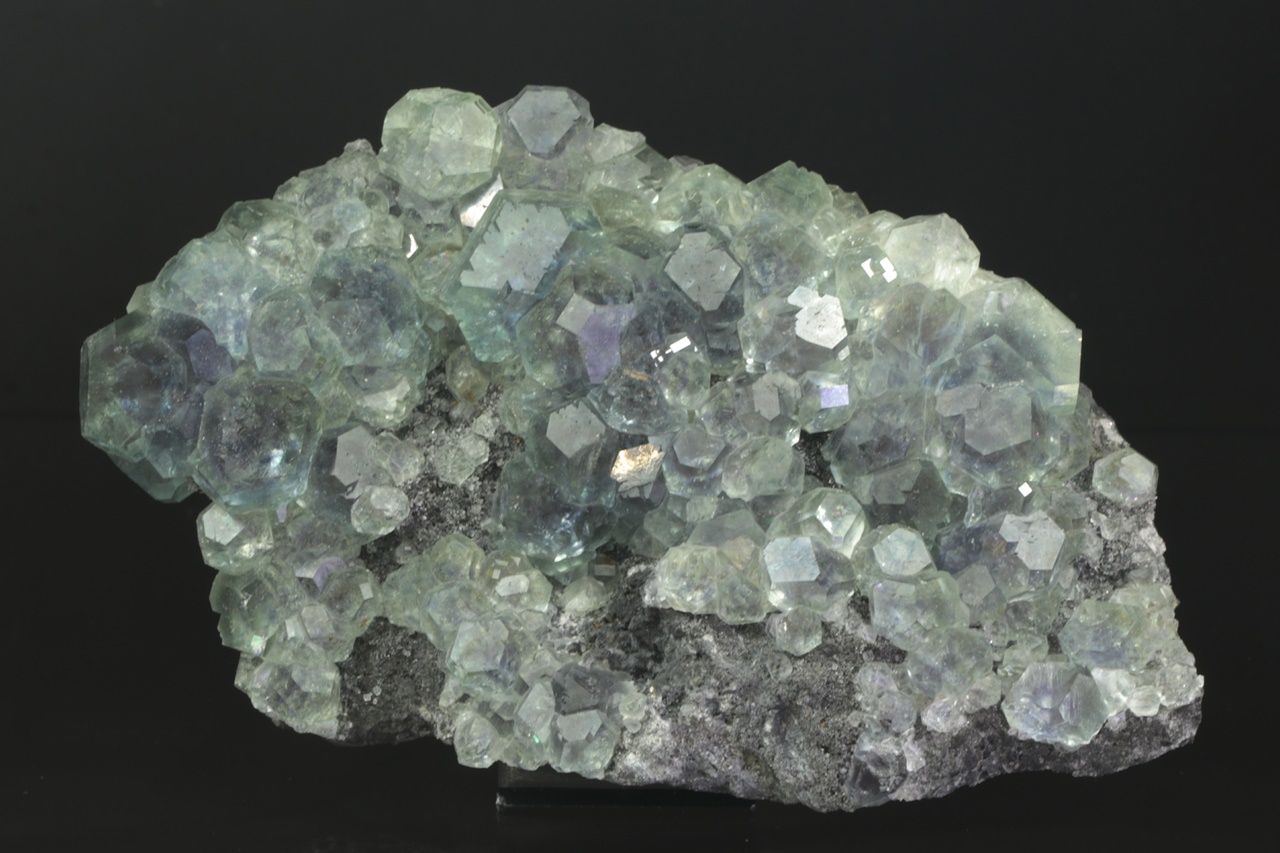 A magnificent druse of crystals of light green Fluorite with purple centers formed by the combination of a cube with an octahedron. The Fluorite is very pure and almost transparent, with the largest crystals being up to 2.5 cm in size.