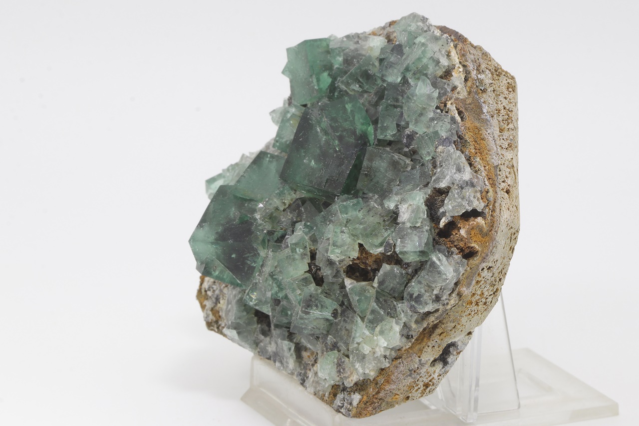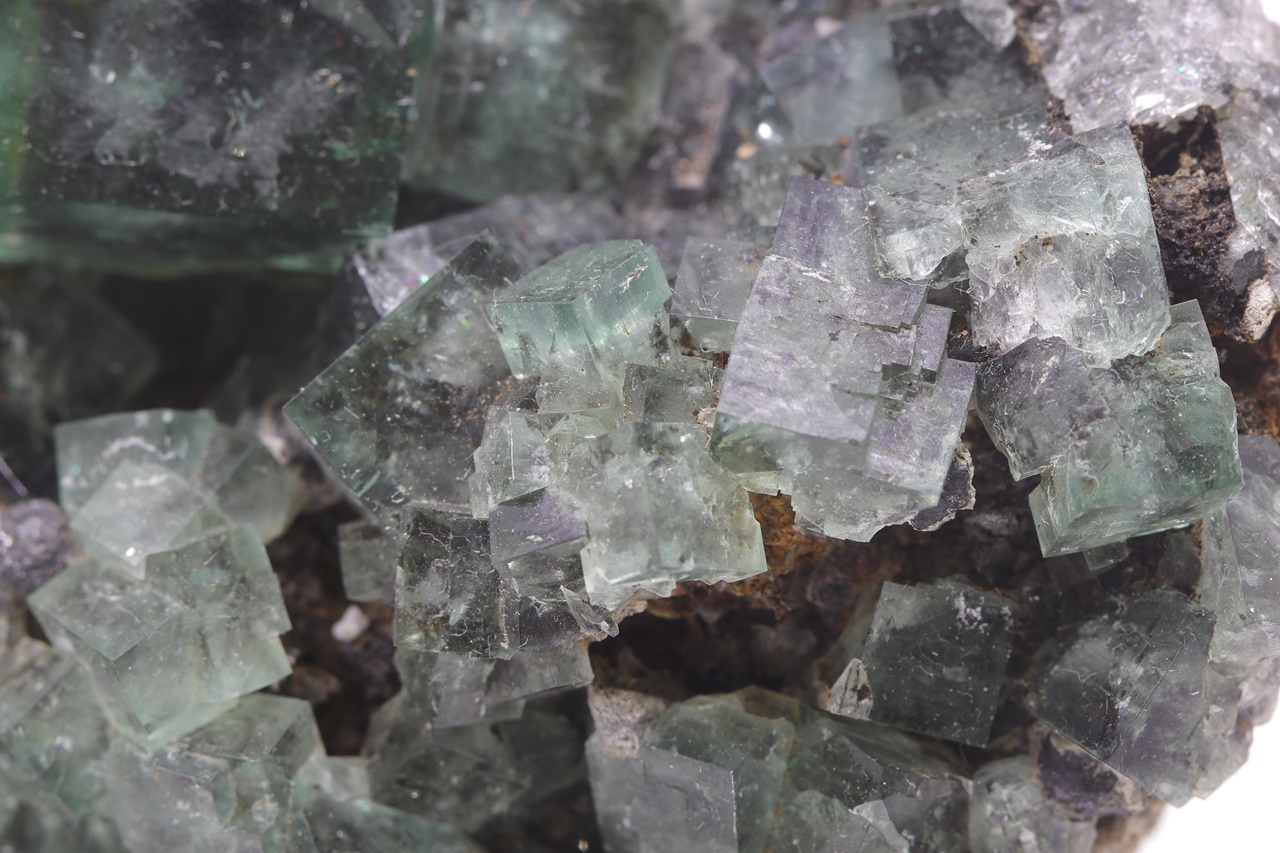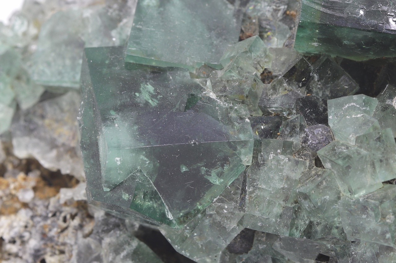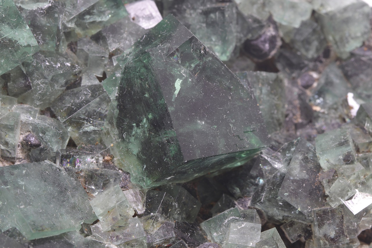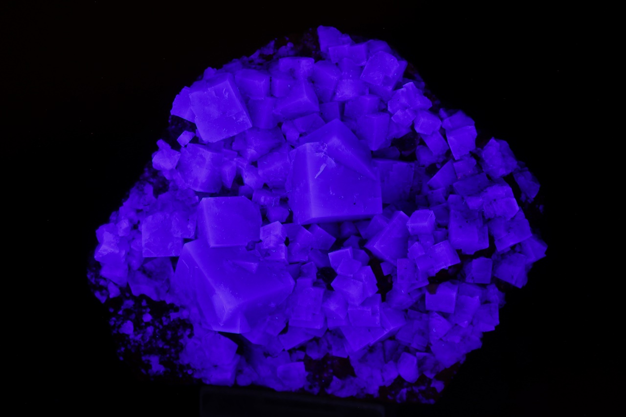 Druse of green cubic crystals of fluorite. The largest crystal is 18 mm in size. The specimen glows under UV light .