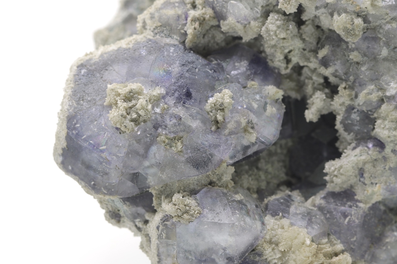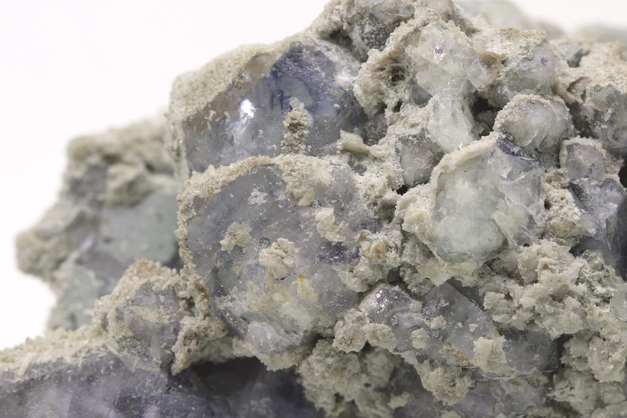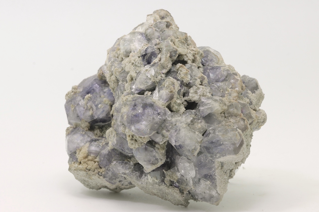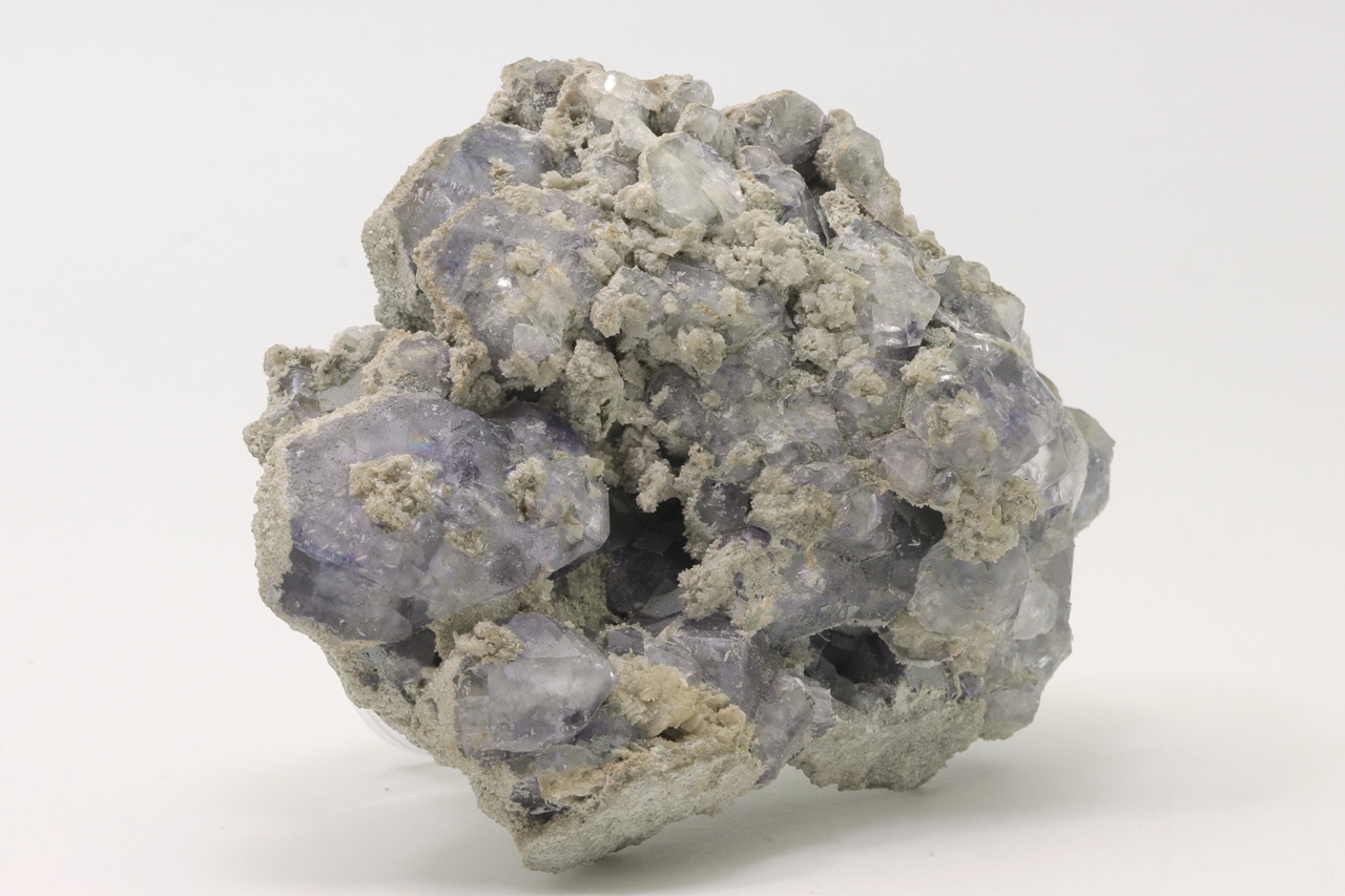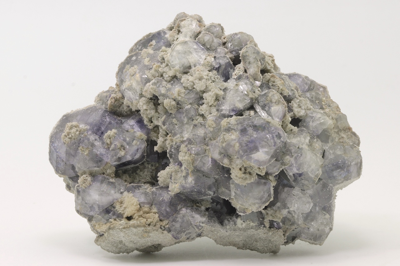 Crystals of translucent, violet-tinted fluorite sprinkled with light gray dolomite and quartz from a renowned fluorite locality. The largest crystal is 2.5 cm big.