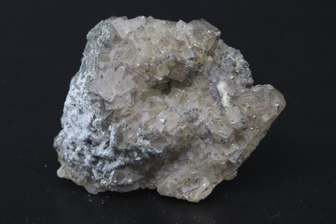 A very rich specimen of cubic honey-yellow crystals of fluorite, which are zonal and transition into light to dark purple colors. Individual cubes reach sizes of up to 1 cm and are intergrown and sit atop each other. Very tiny brass-golden aggregates of pyrite also sit on the fluorite crystals. The specimen comes from the typical Czech fluorite locality of Běstvina.