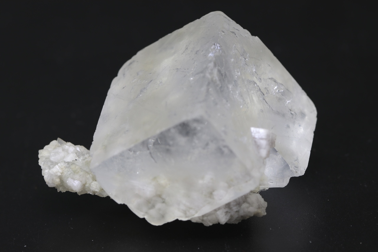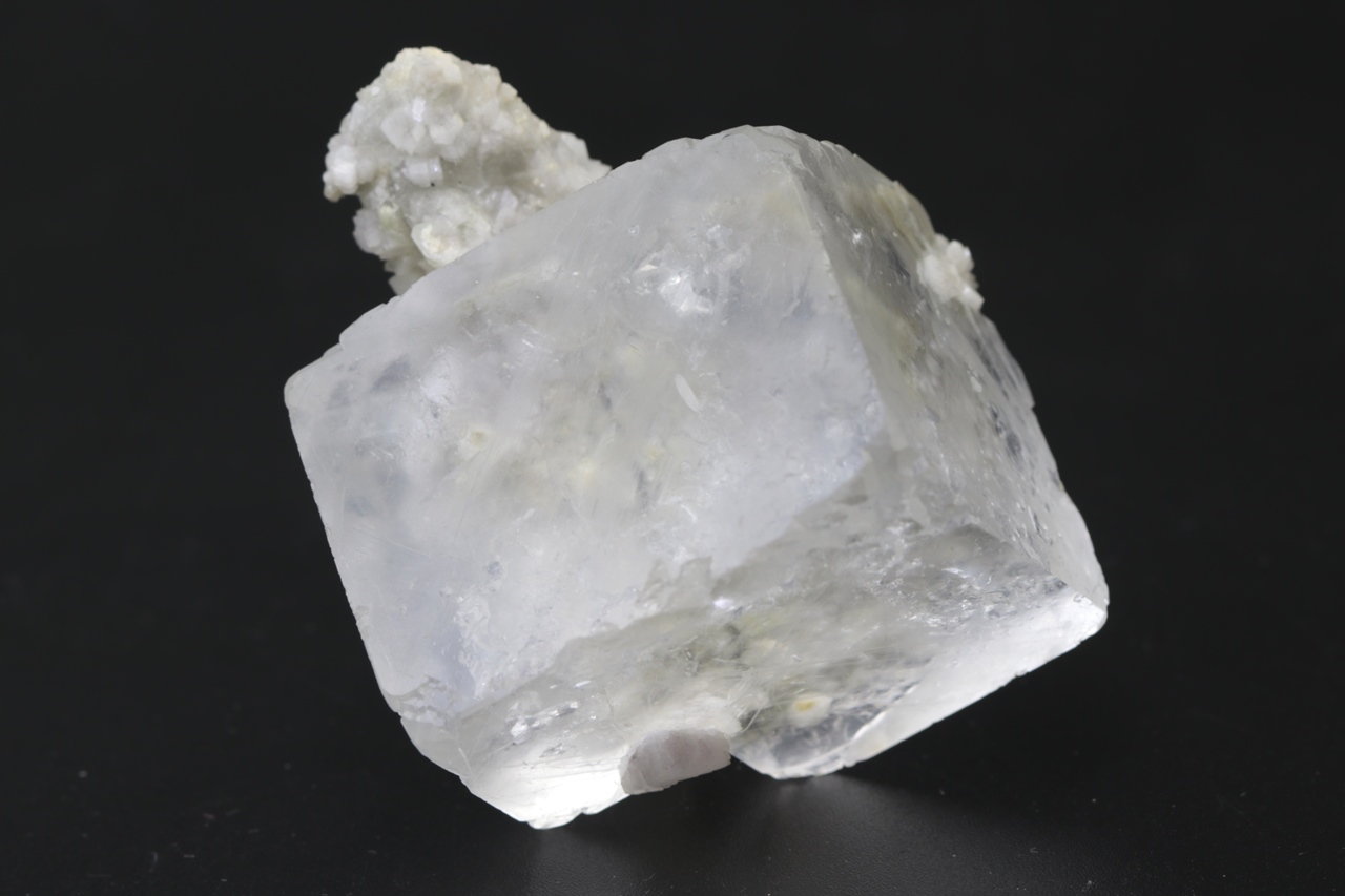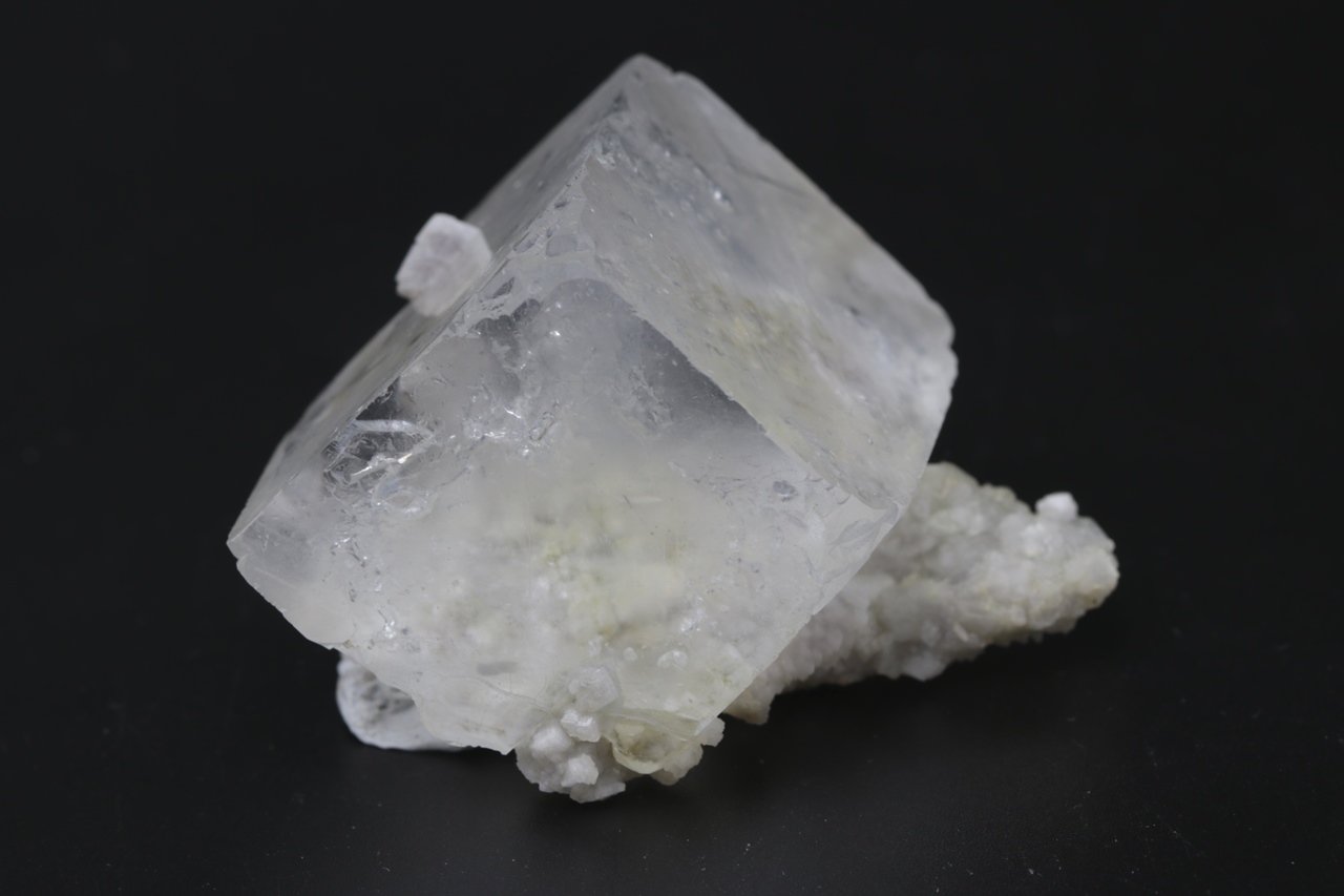 Fluorite forms a colorless, vitreous lustrous cubic crystal that measures 42x49x35 mm and grows on a crystalline base. It is an aesthetically very successful specimen of this halide that comes from the Russian locality of Dalnegorsk.