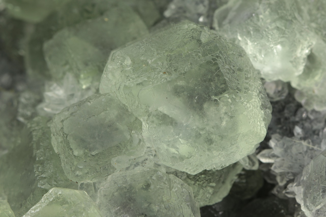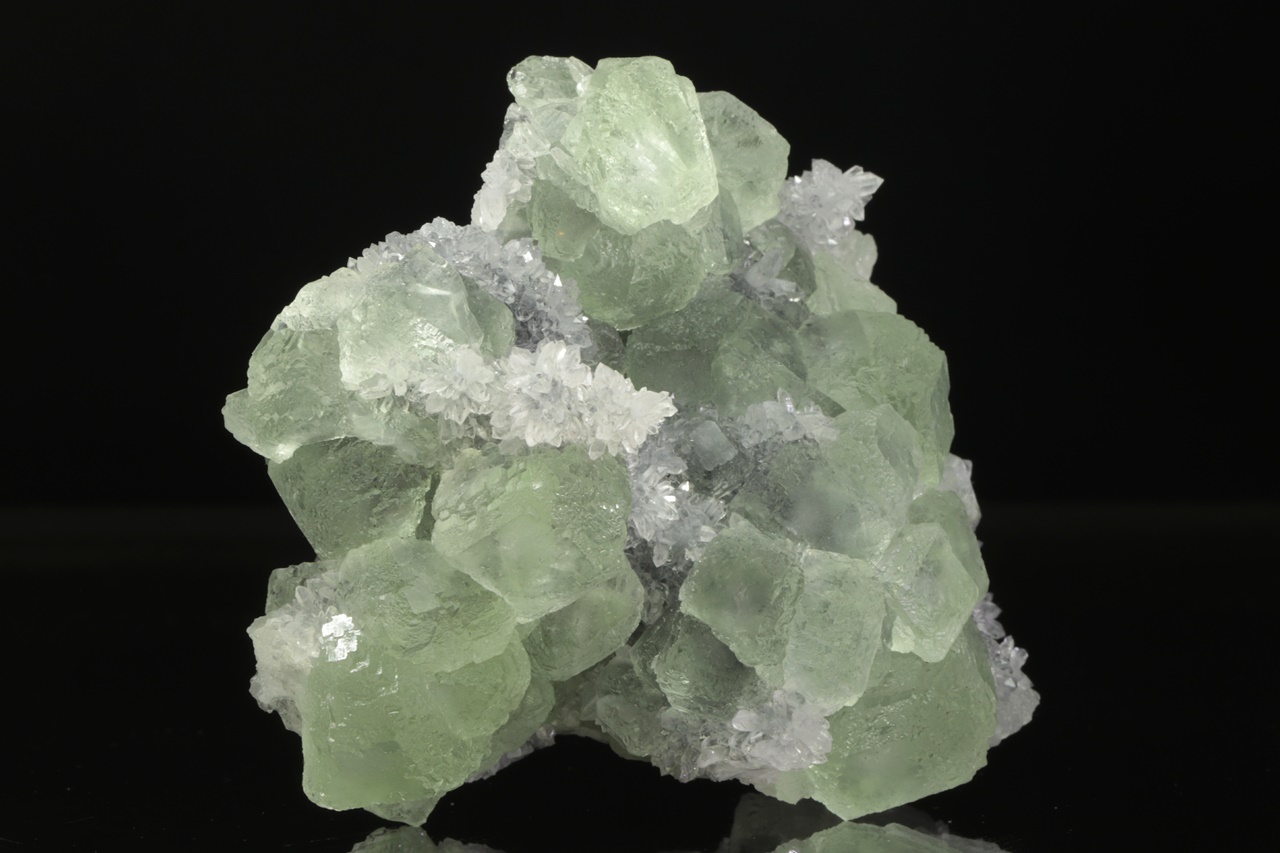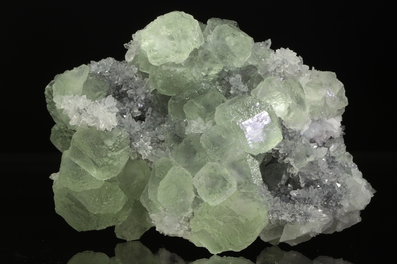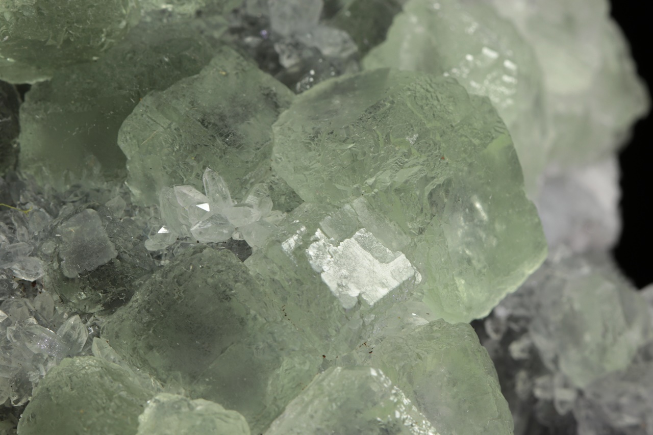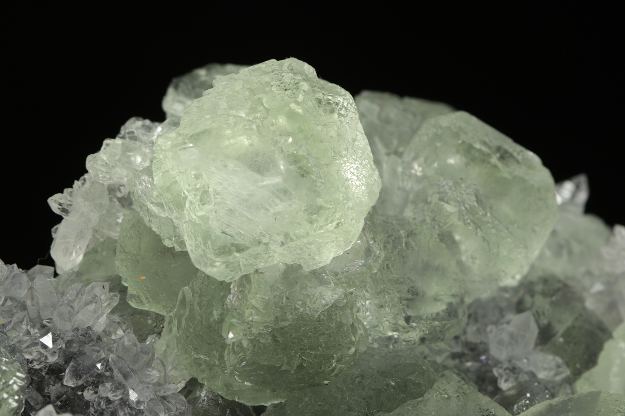 A magnificent specimen of transparent crystals of light green fluorite forming the junctions of a cube and a rhombododecahedron with quartz. The largest fluorite crystal is 2.5 cm in size.
