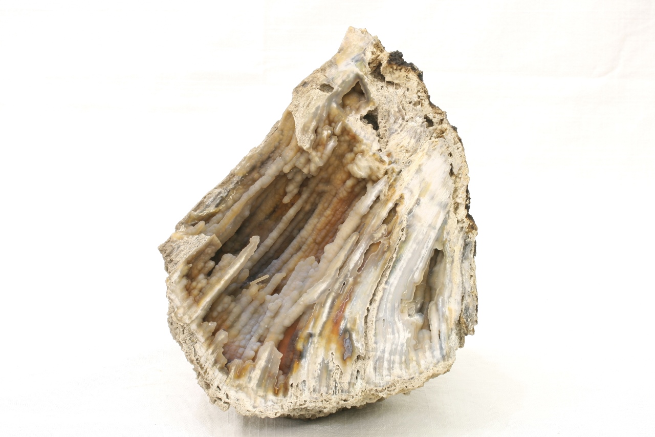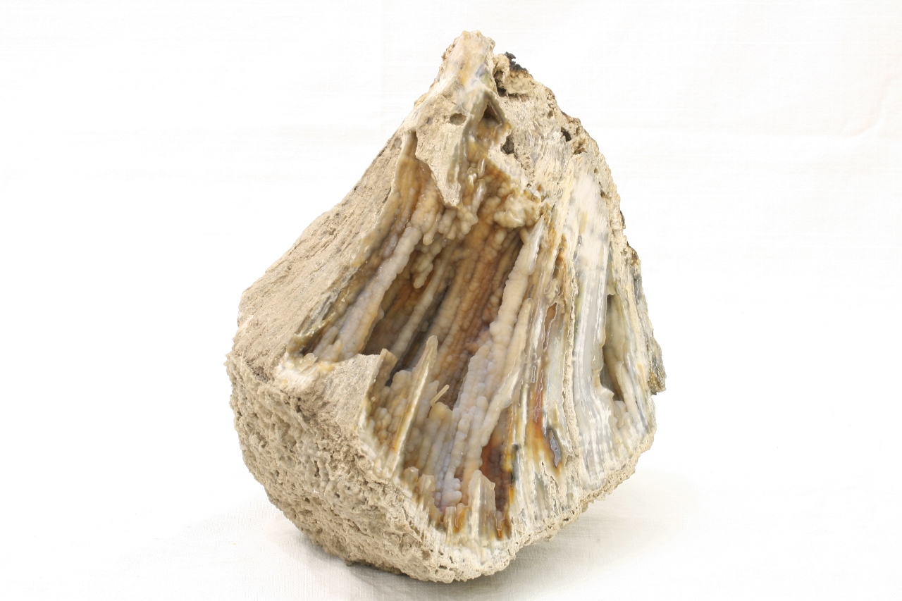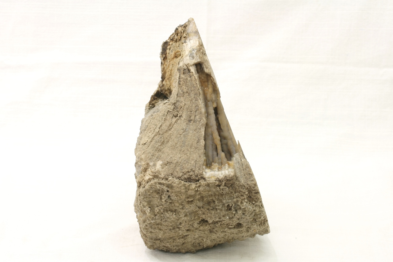 Fossil coral with a cavity filled with chalcedony stalactites. The original calcite shells of the coral were dissolved during fossilization and replaced by chalcedony, so that the typical structure of the coral is preserved in places. Semi-transparent chalcedony with a yellowish to bluish color in the coral cavities creates striking stalactites. The coral comes from northern Florida and is of late Oligocene age (34–23 million years old).