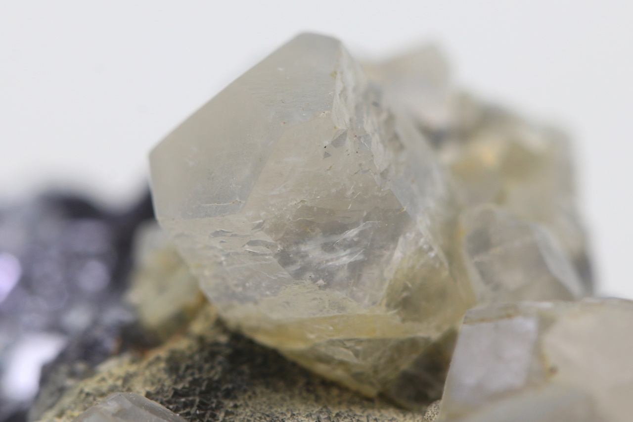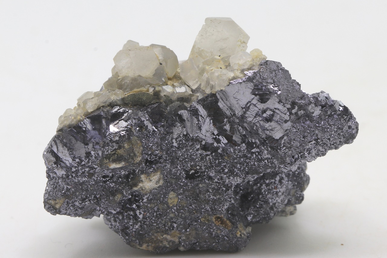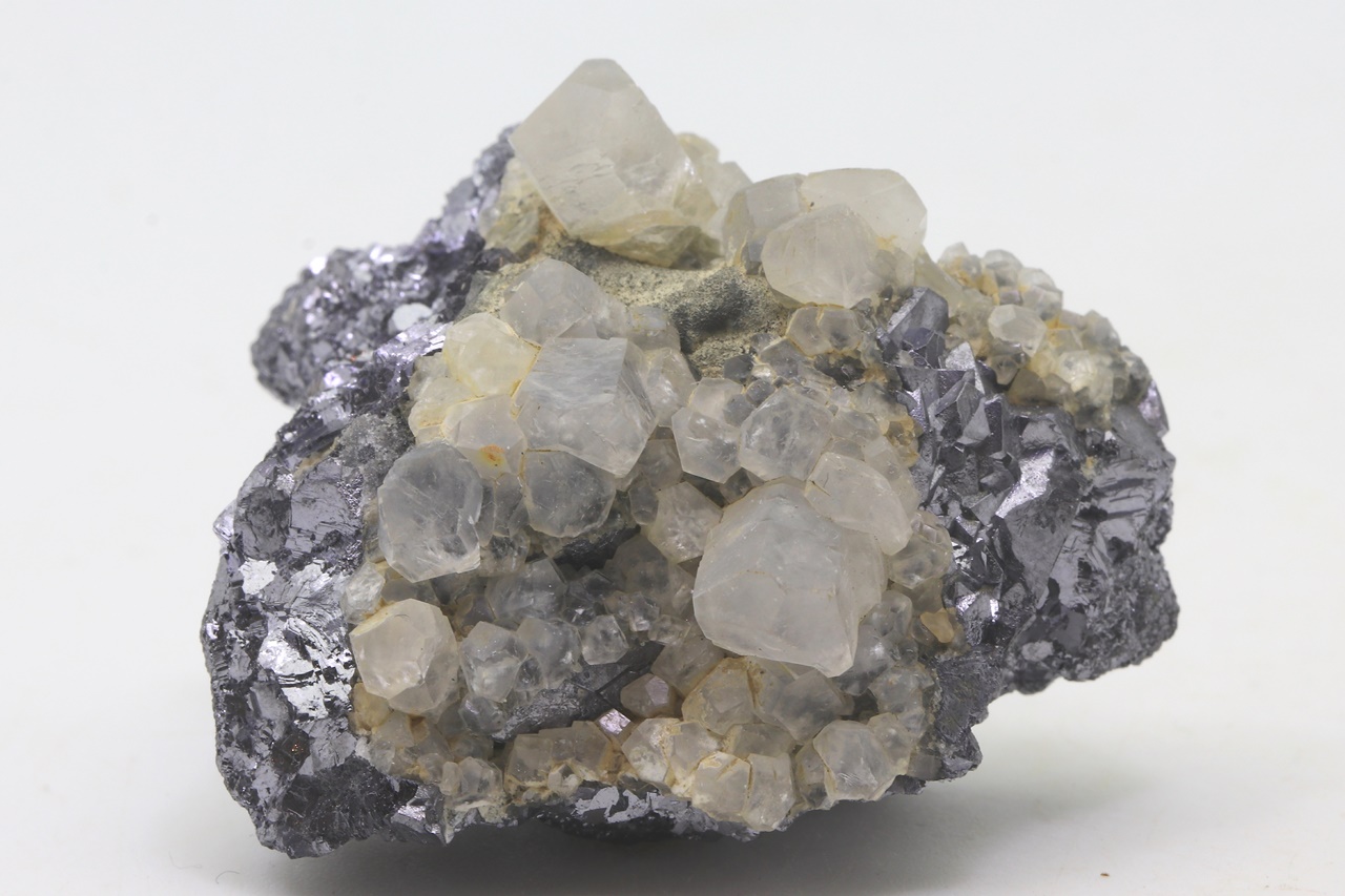 Very shiny crystals of galenite overgrown with cannonball calcite. The largest calcite crystal is 10 mm in size.